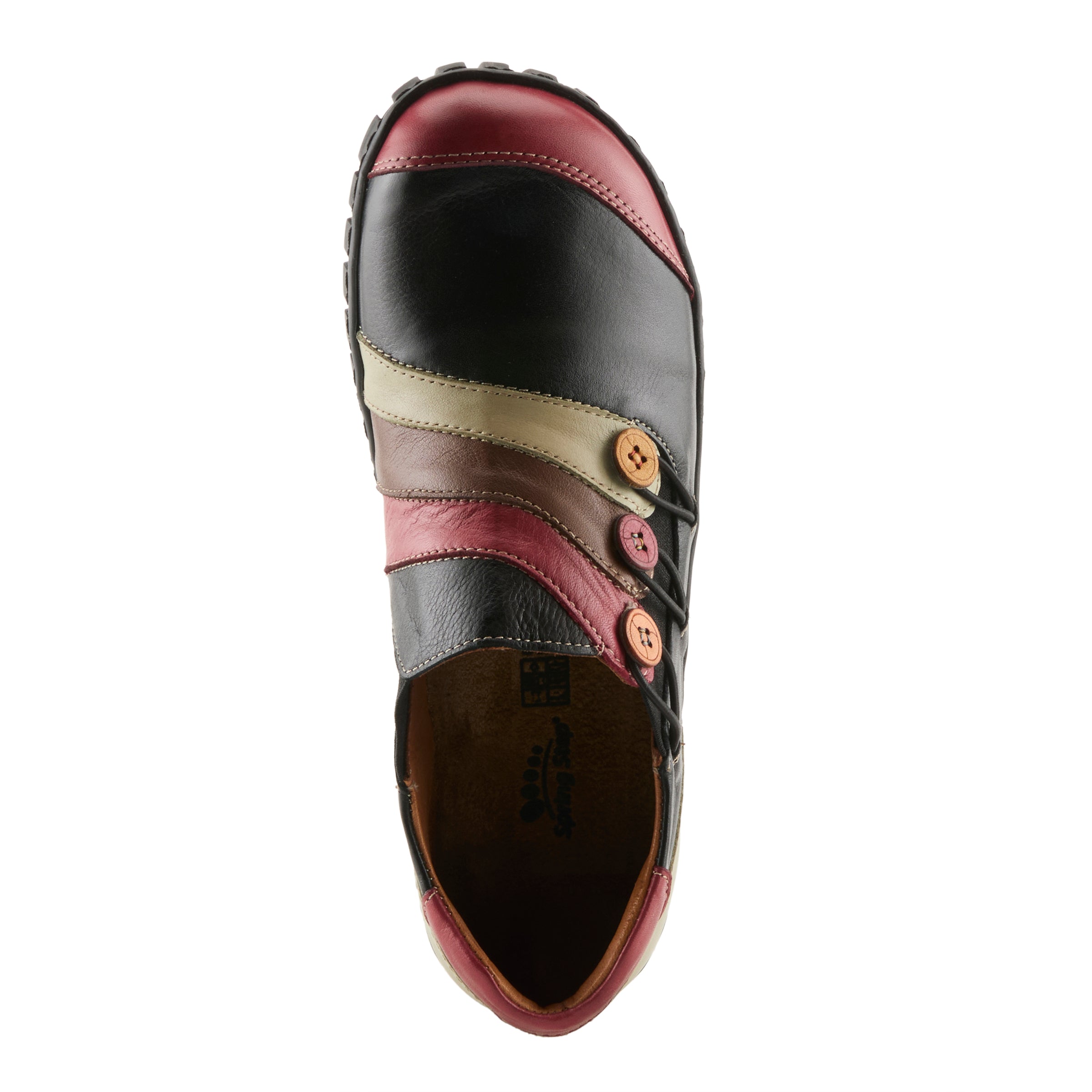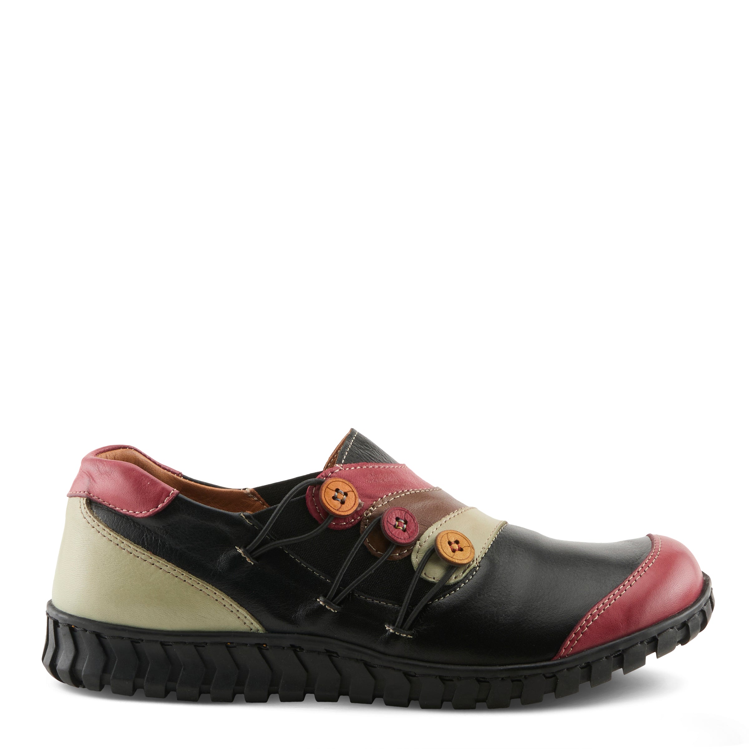 Premium, high-quality leather shoe featuring striking color blocking and unique colorful buttons on a flexible comfort sole.
