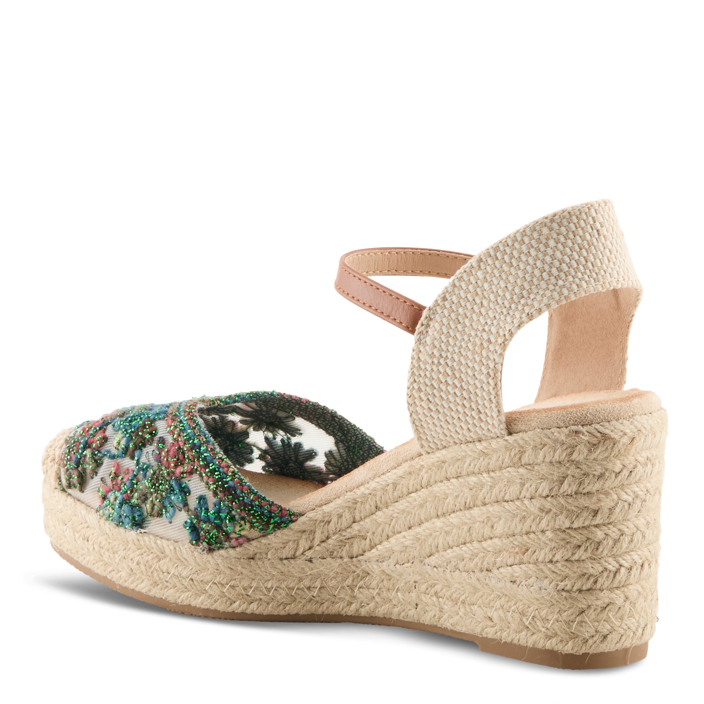 Bring a touch of romance and sophistication to your look with these enchanting espadrille wedges, designed for the true fashionista at heart. The upper features a dreamy combination of sheer textile underlay adorned with delicate mini floral chenille embroidery and shimmering floral accents—making every step a statement in chic elegance. The faux leather ankle strap with buckle closure adds a polished finish, while the microsuede insole ensures lasting comfort.