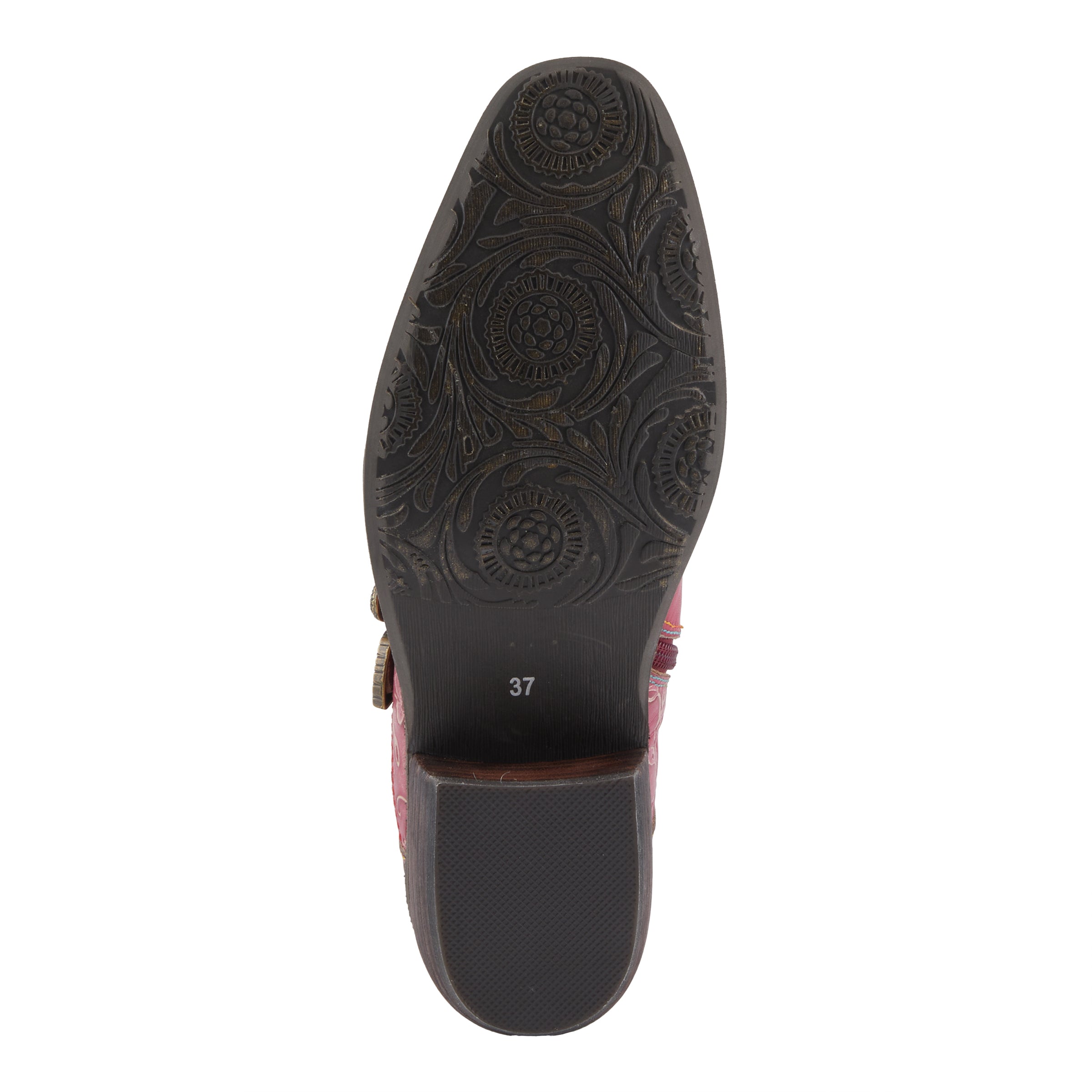 - Full grain burnished polished leather and embossed two tone floral designed hand painted leather