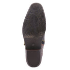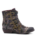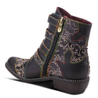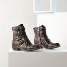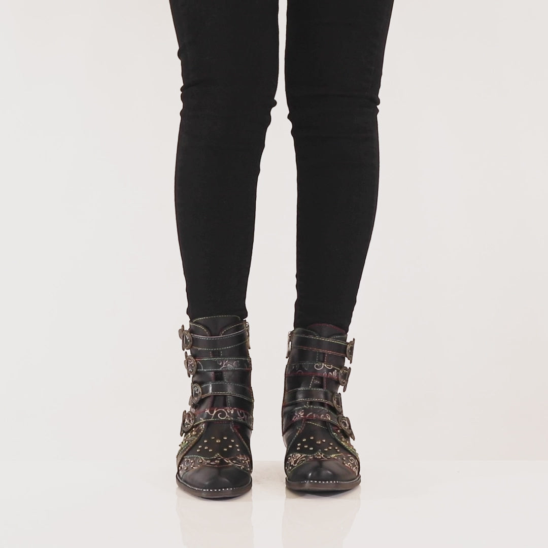 A beautiful western style bootie with a Victorian flavor, with amazing four(4) strap refined bow style antique buckles and end strap embellishments, in a combination of full grain burnished polished leather and embossed two tone floral designed hand painted leather.