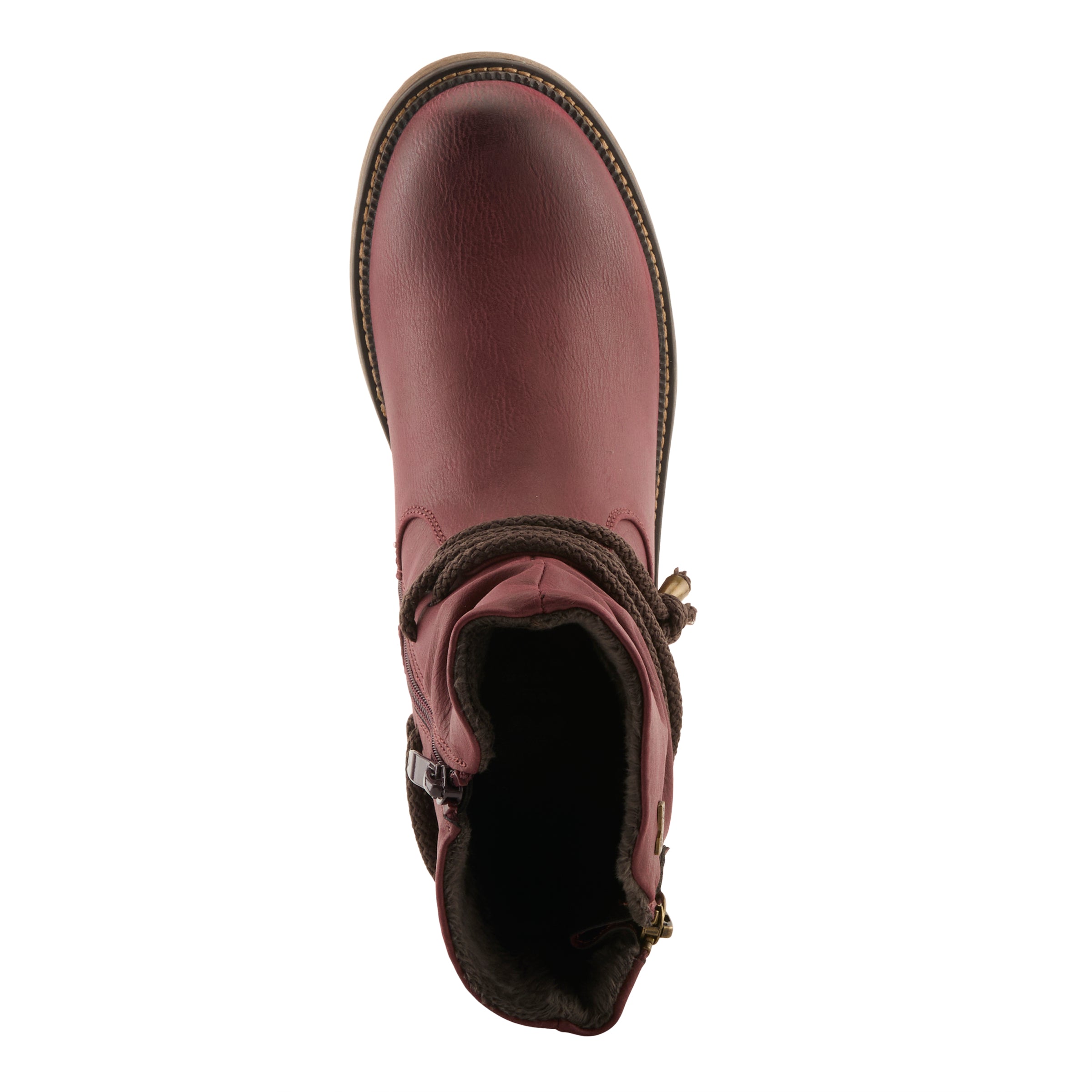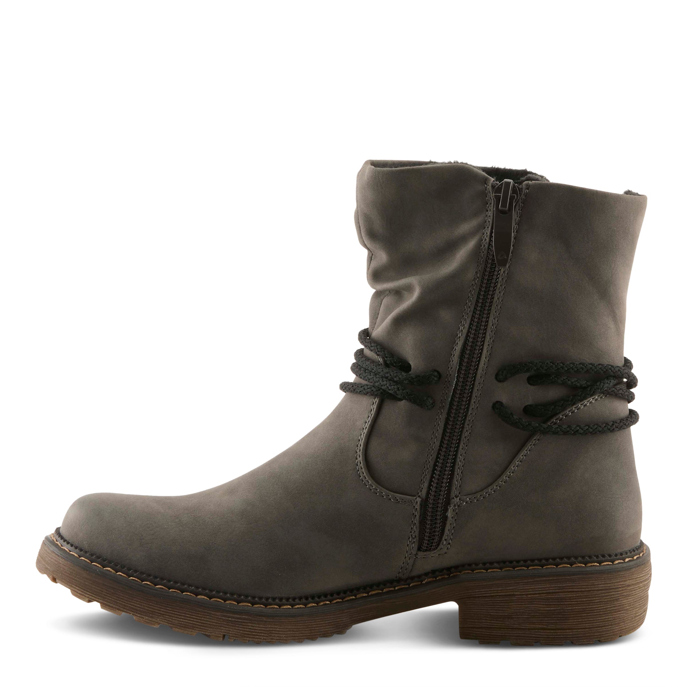 Trendy and functional water resistant mid boot featuring a slouchy shaft design with decorative rope laces at the ankle and a profile zipper with expanding gusset for adjustability.