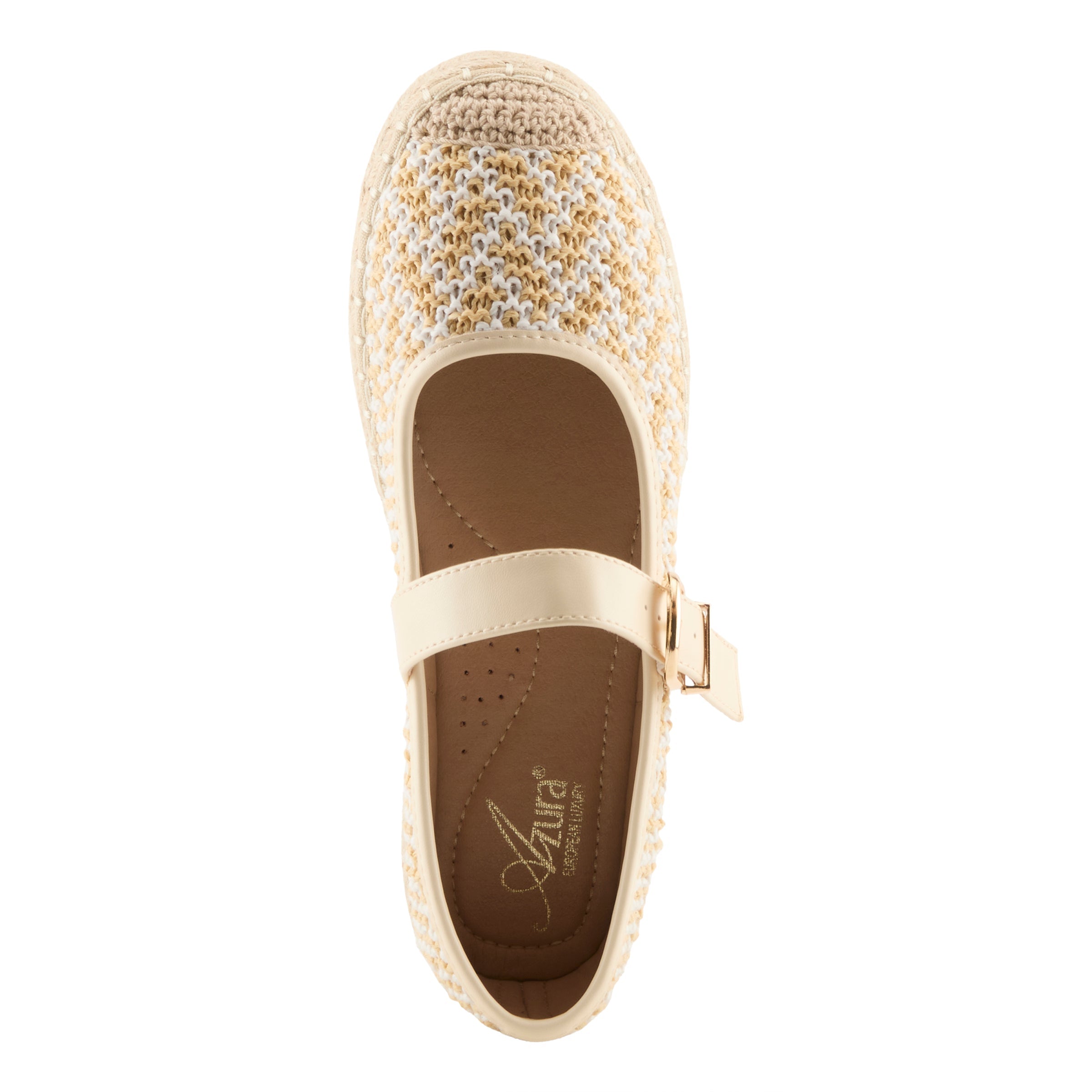 For the woman who loves effortless style without the height of a heel, this adorable Mary Jane flat is the perfect mix of trendy, classy, chic, and relaxed elegance. Crafted with a unique knitted textile upper in two-tone color combinations, it delivers both texture and visual appeal. The faux leather strap with a gold-tone buckle adds a polished finishing touch while keeping the fit secure.