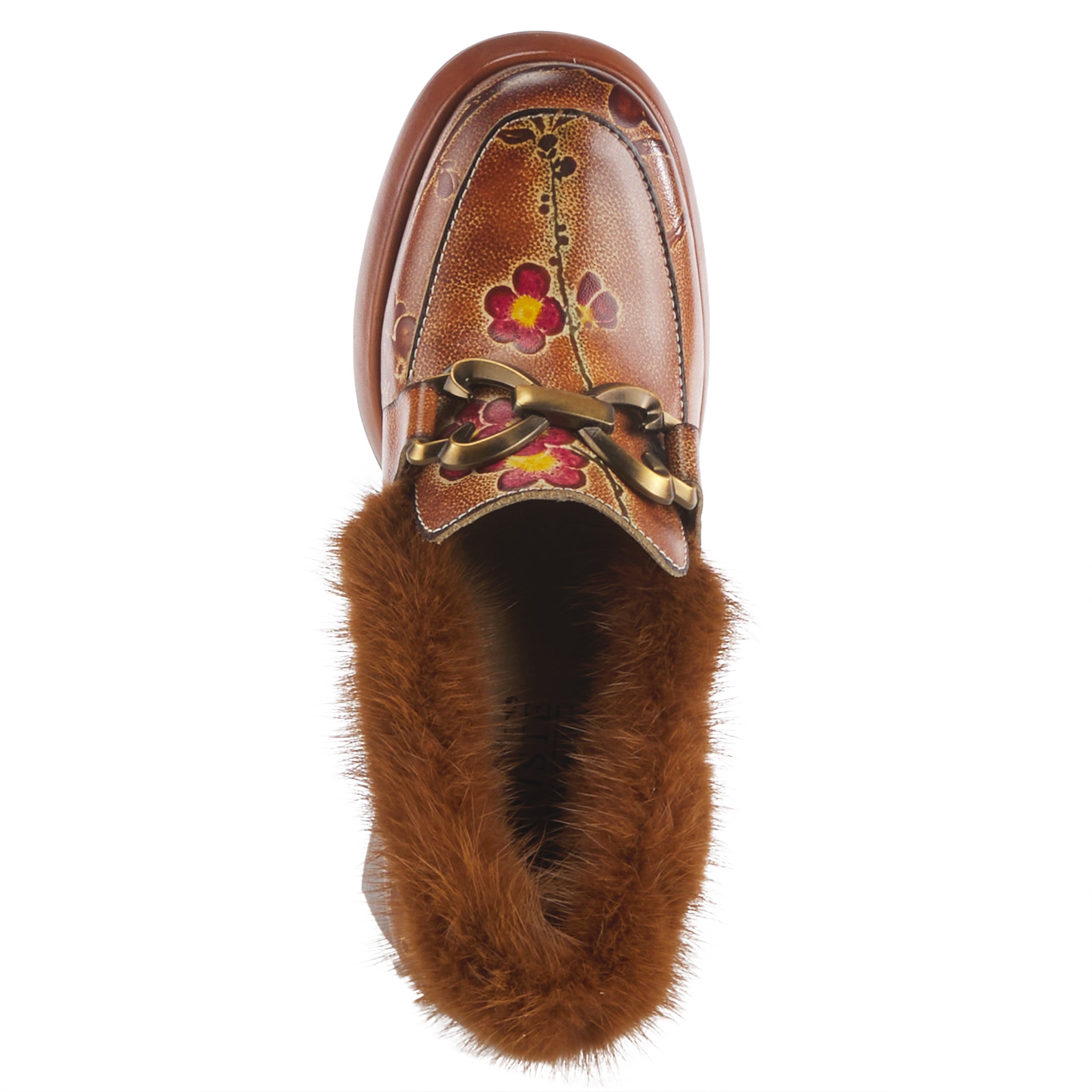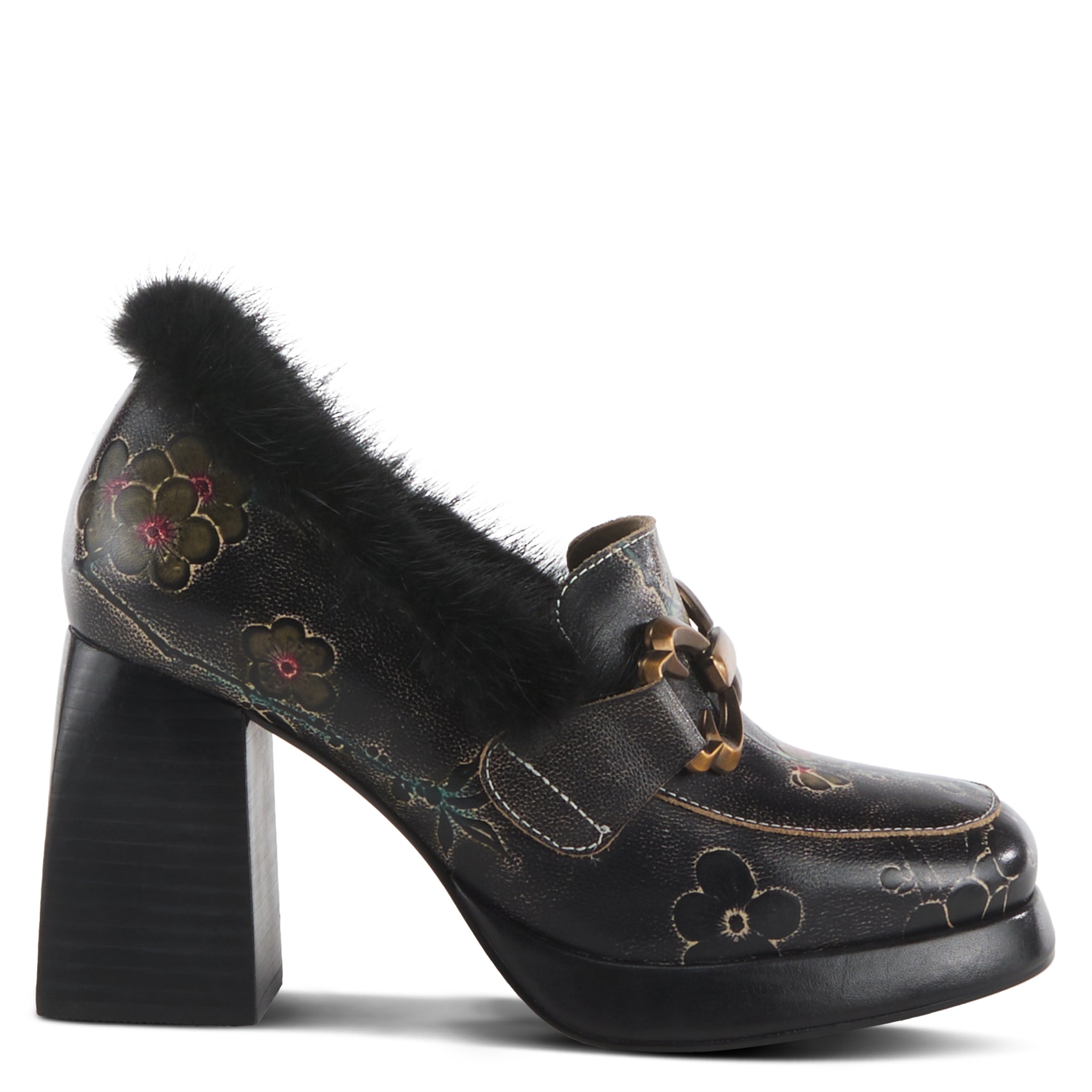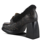 Be a show stopper in these heels! This sculpted chunky stacked heeled loafer is a bold and stylish statement piece, featuring a hand-painted floral upper design that adds a touch of femininity. The lush faux fur trim provides warmth and texture, while the decorative metal applique adds a unique and eye-catching element. With its combination of style and comfort, this loafer is the perfect addition to any fashion-conscious wardrobe.