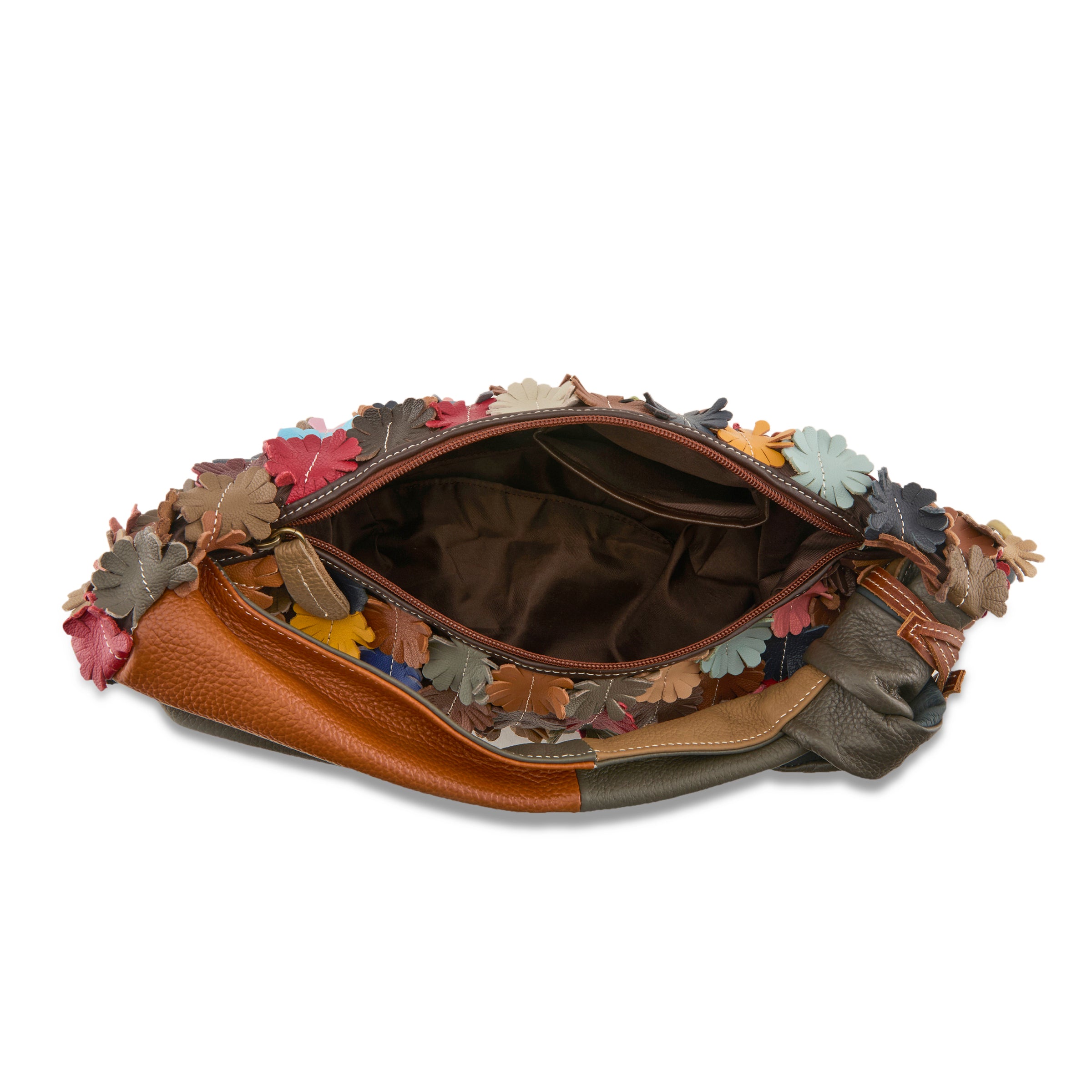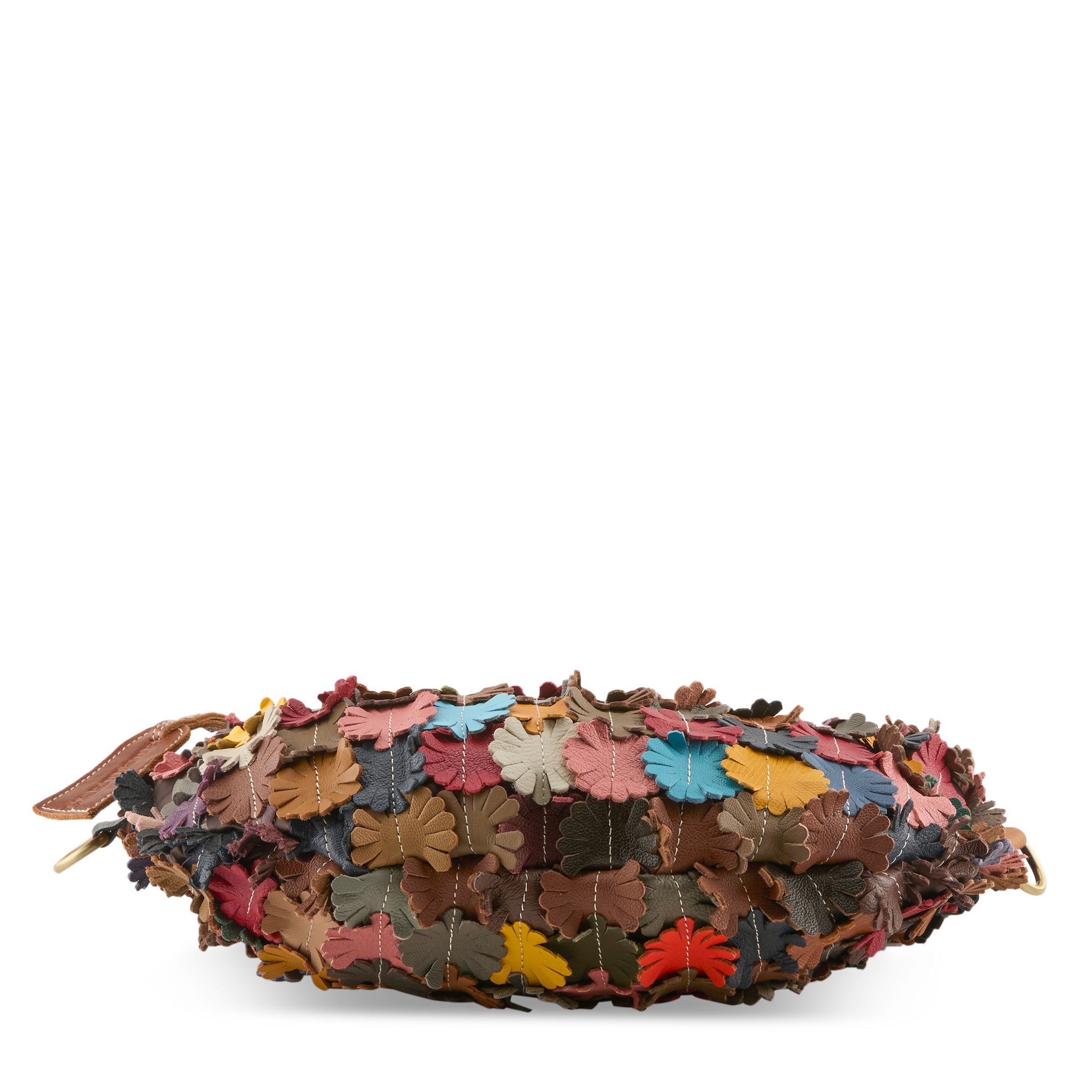 Genuine multi-colored leather flowers stitched on a Nylon twill base.