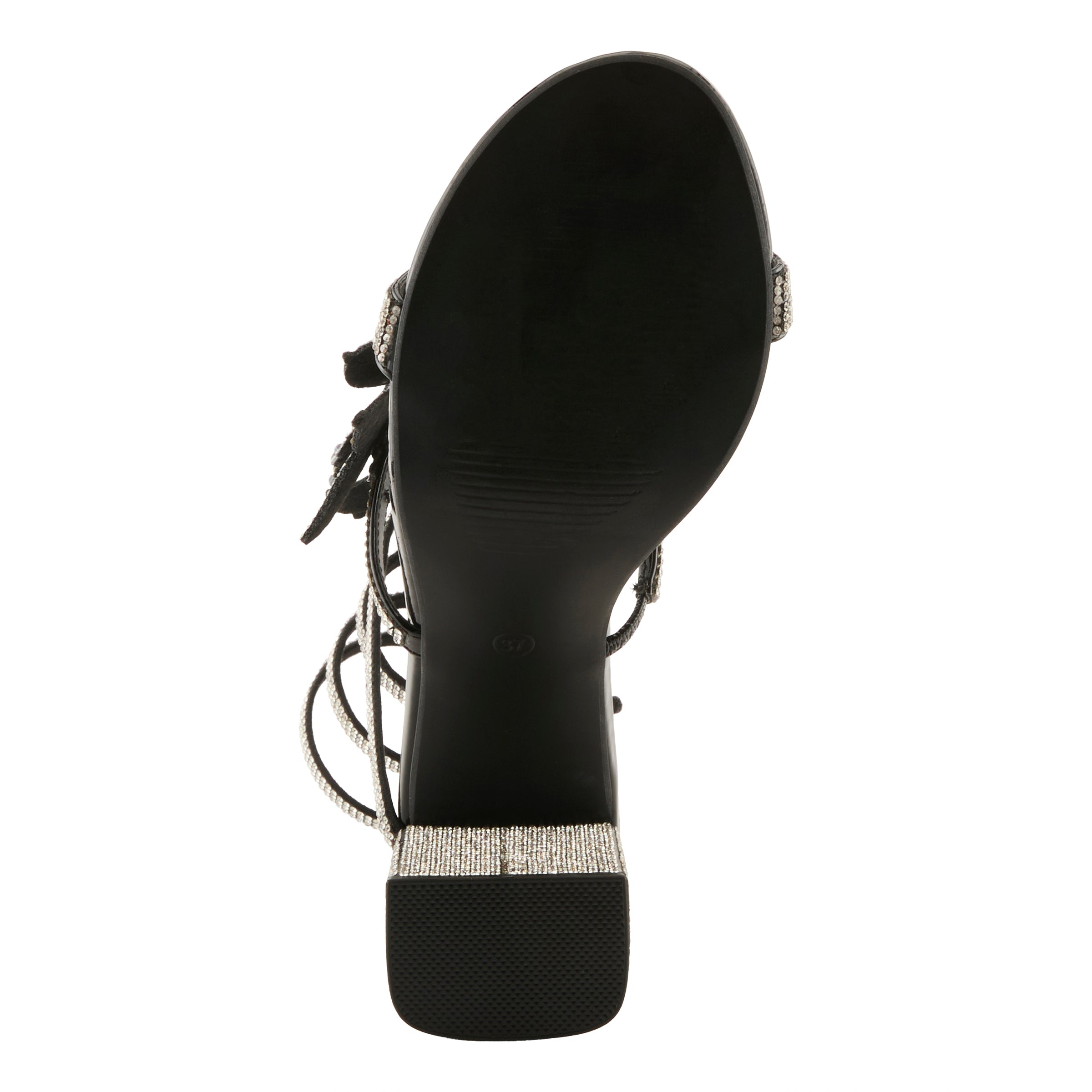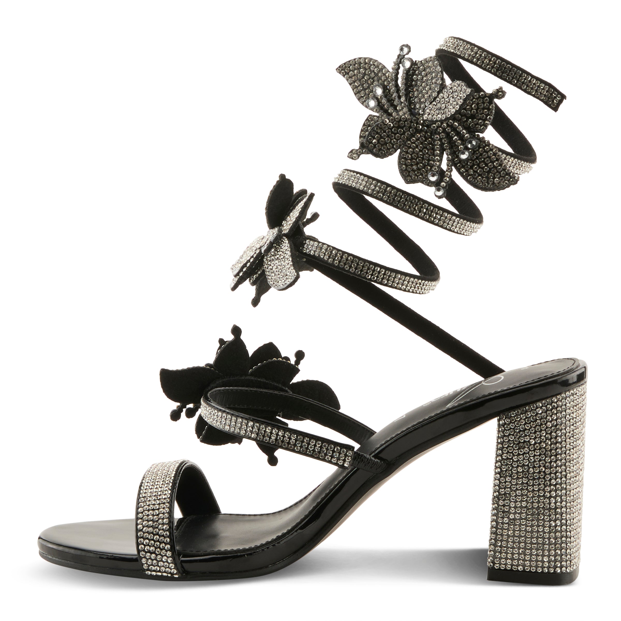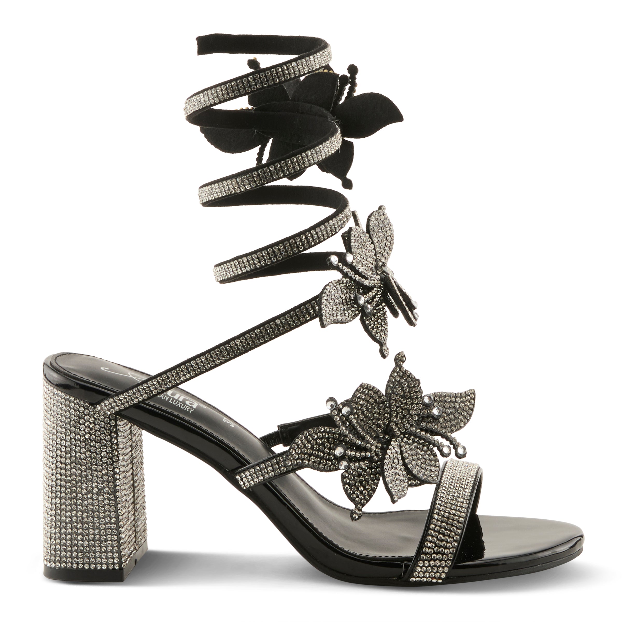 Dare to dazzle with To The Moon, a sandal designed to shine brighter than the rest. With its crystal-encrusted block heel, sculptural spiral ankle wrap, and dramatic crystal floral appliqués, this style transforms every step into a statement. The shimmering rhinestones catch the light from every angle, while the bold silhouette blends high-fashion edge with timeless elegance.