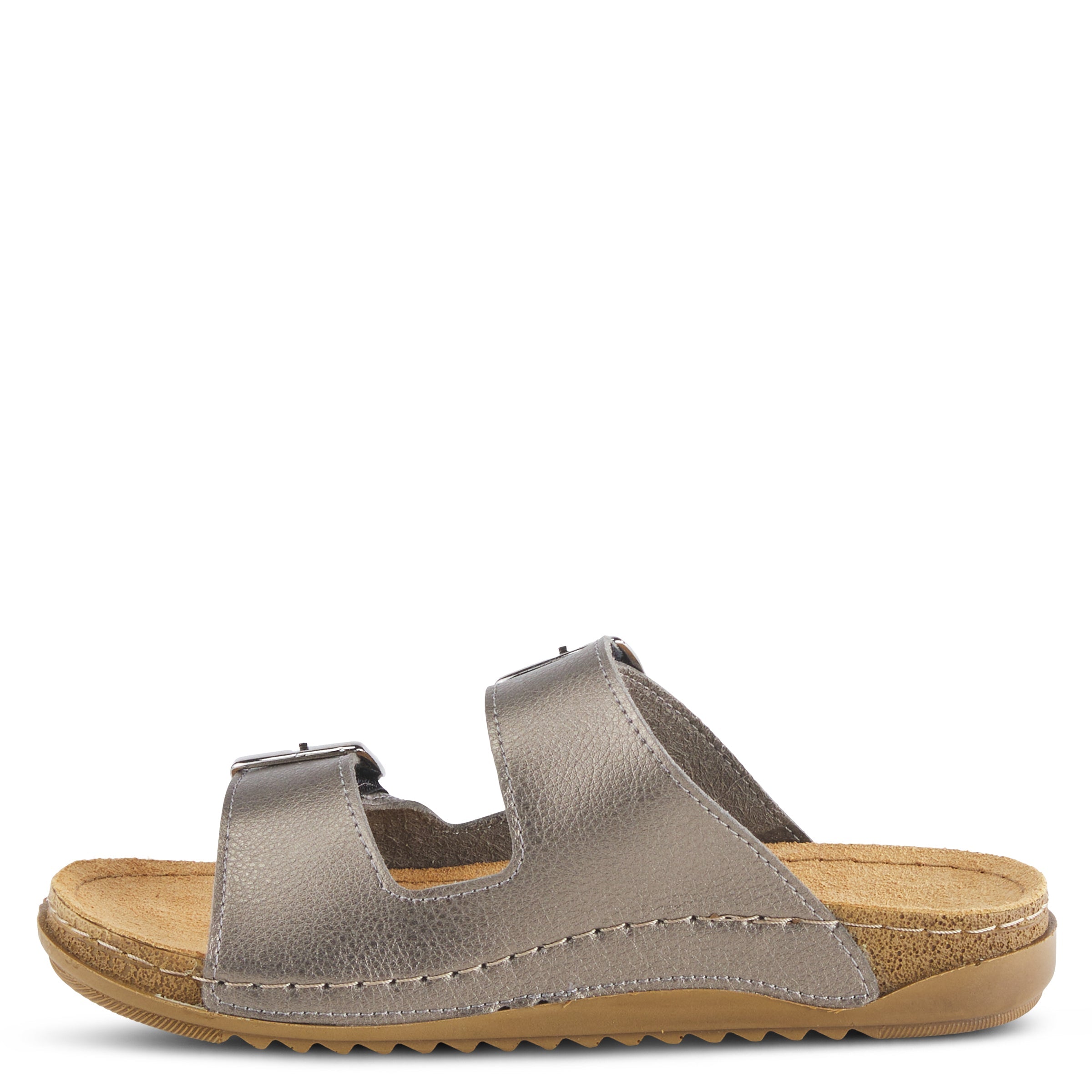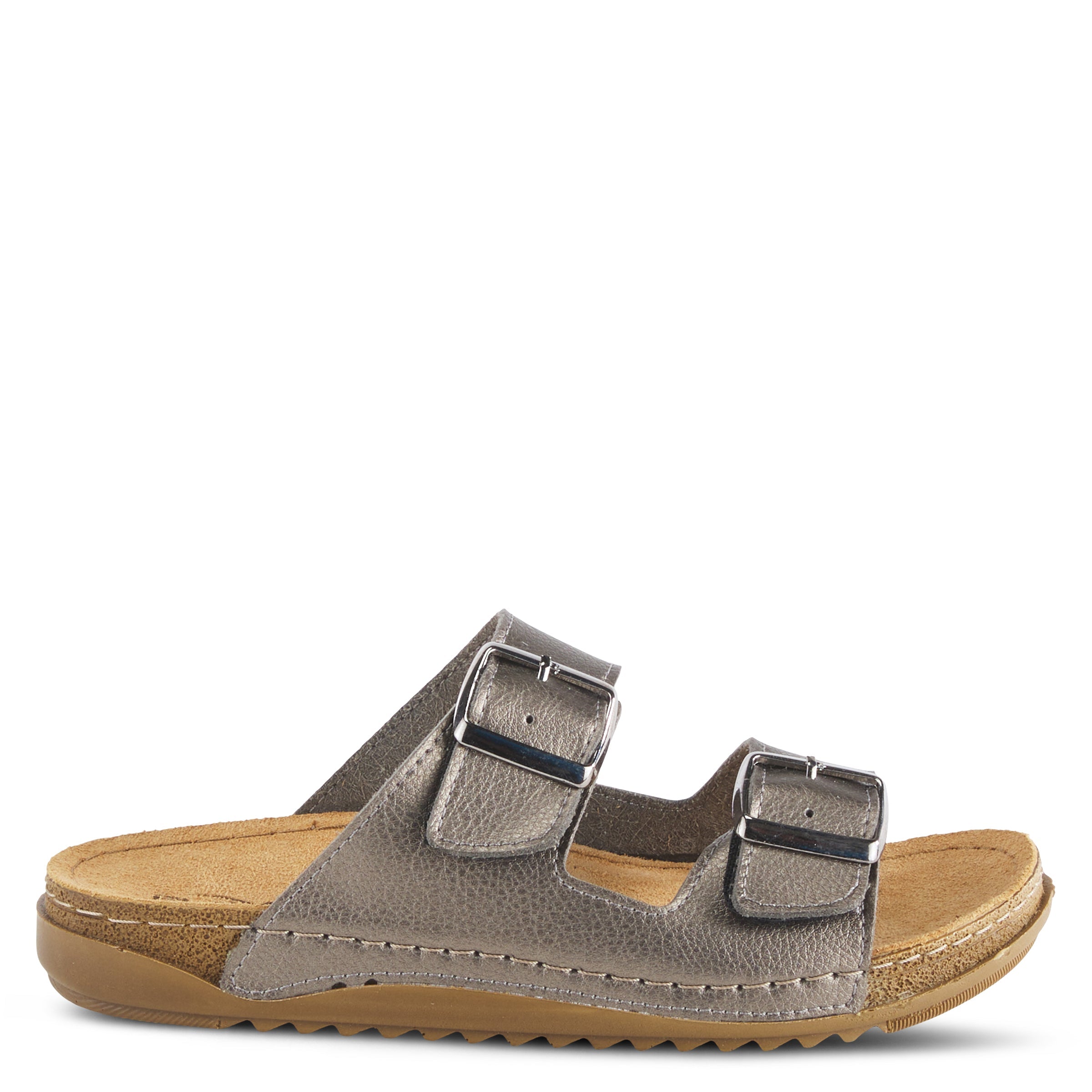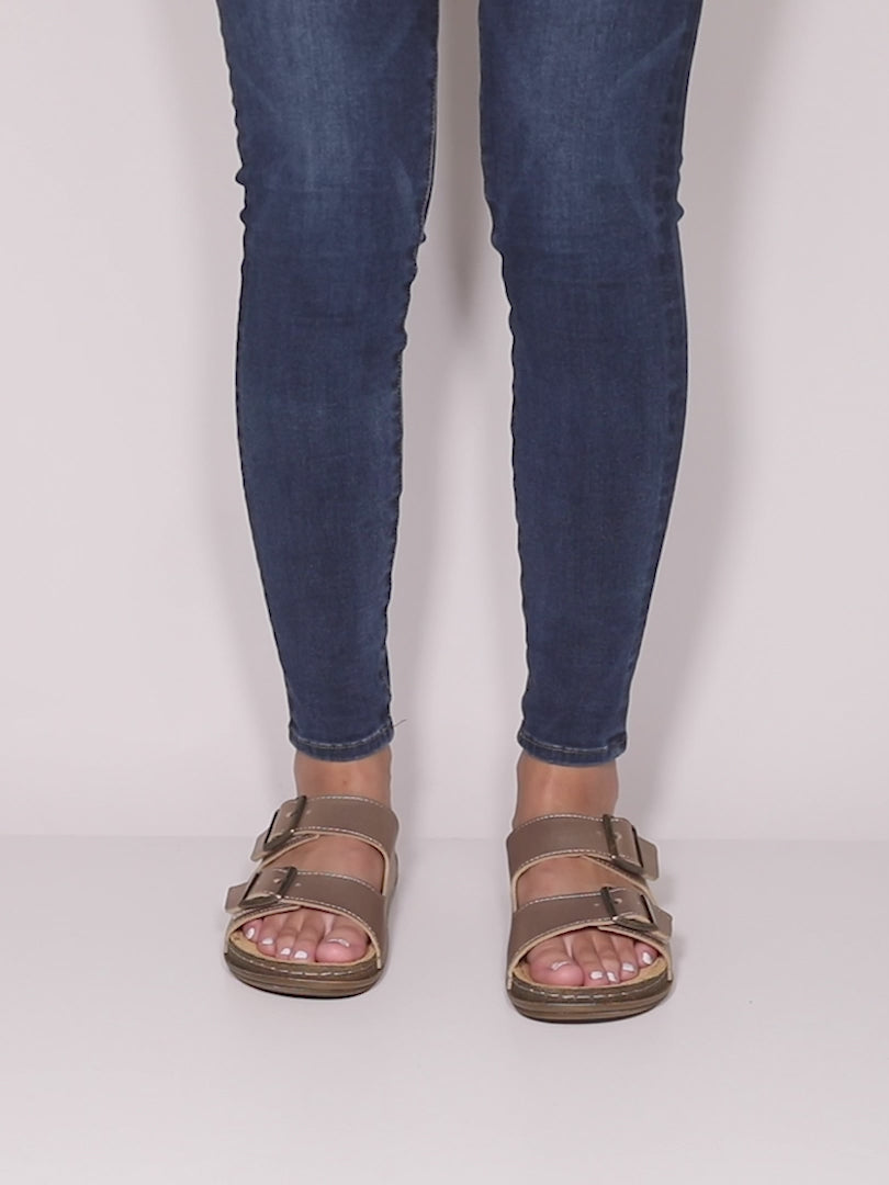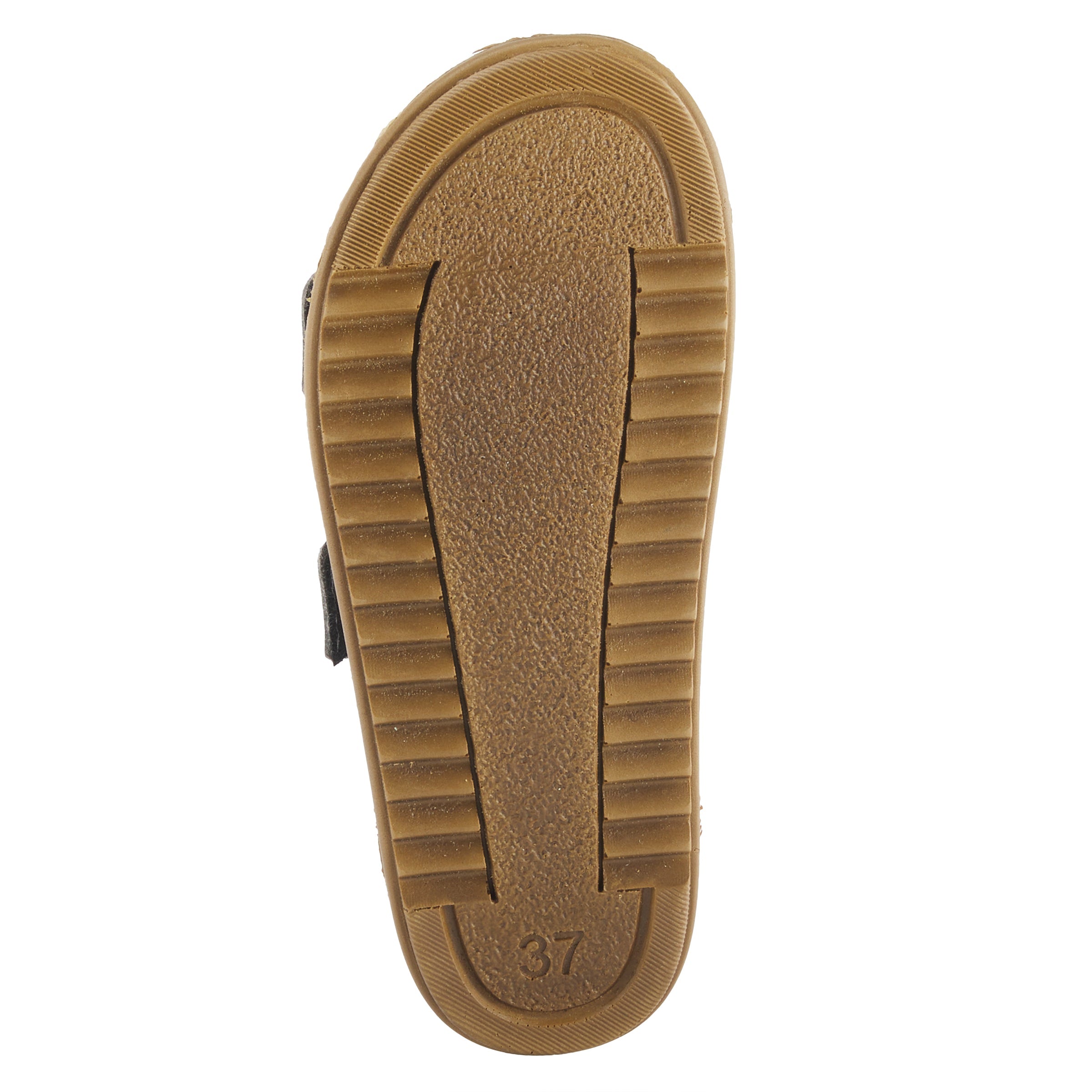 Dulces sandalias deslizantes con correas dobles y hebillas de metal para ajuste en una plantilla cómoda para un uso cómodo durante todo el día.