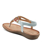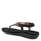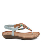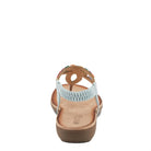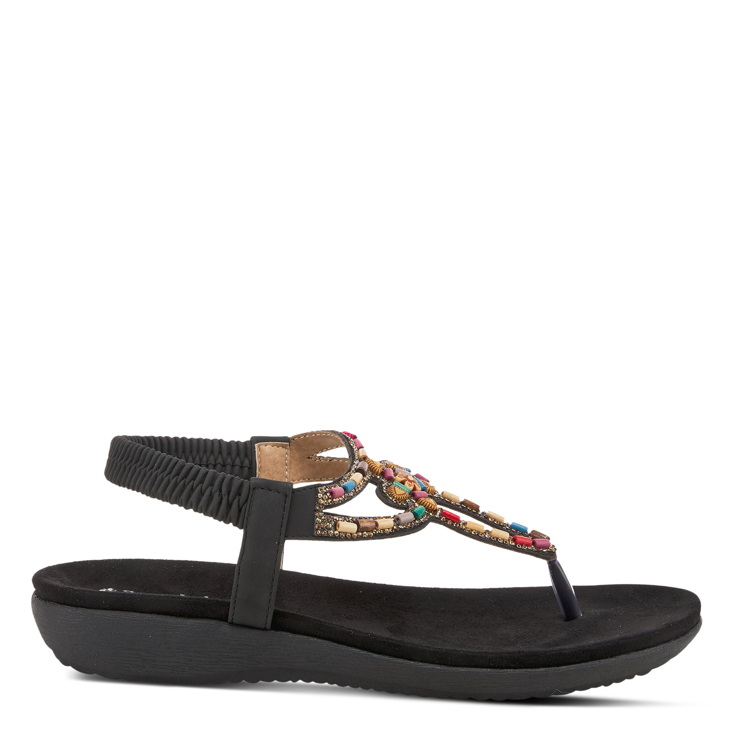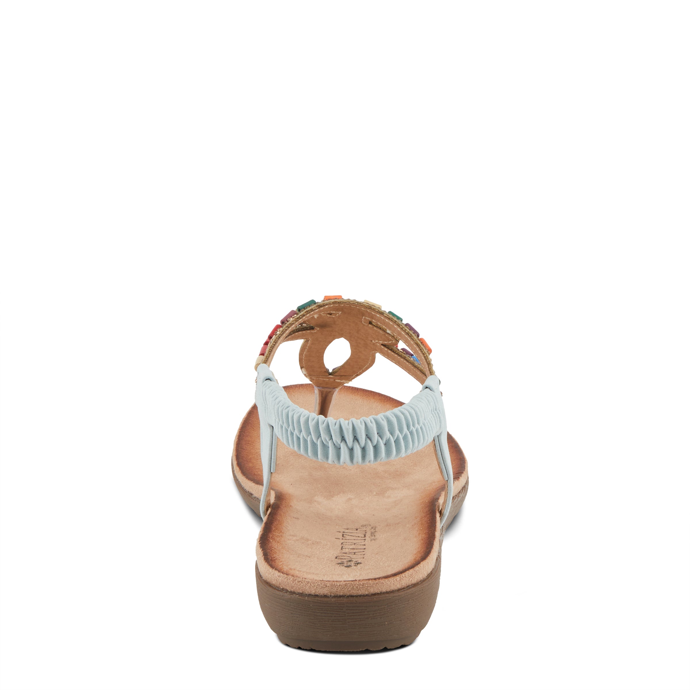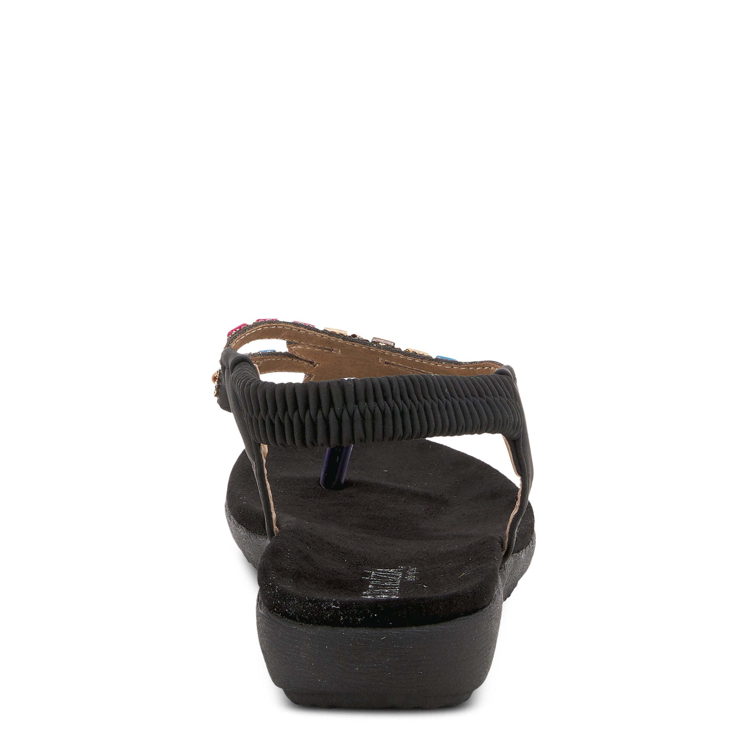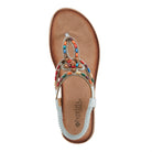 Delicada sandalia con correa trasera elástica y puntera con cuentas de barril de madera multicolor rodeadas de pedrería en una parte superior con corte geométrico con un diseño floral central. La plantilla suave y acogedora junto con la suela flexible asegura comodidad durante todo el día.