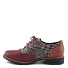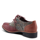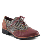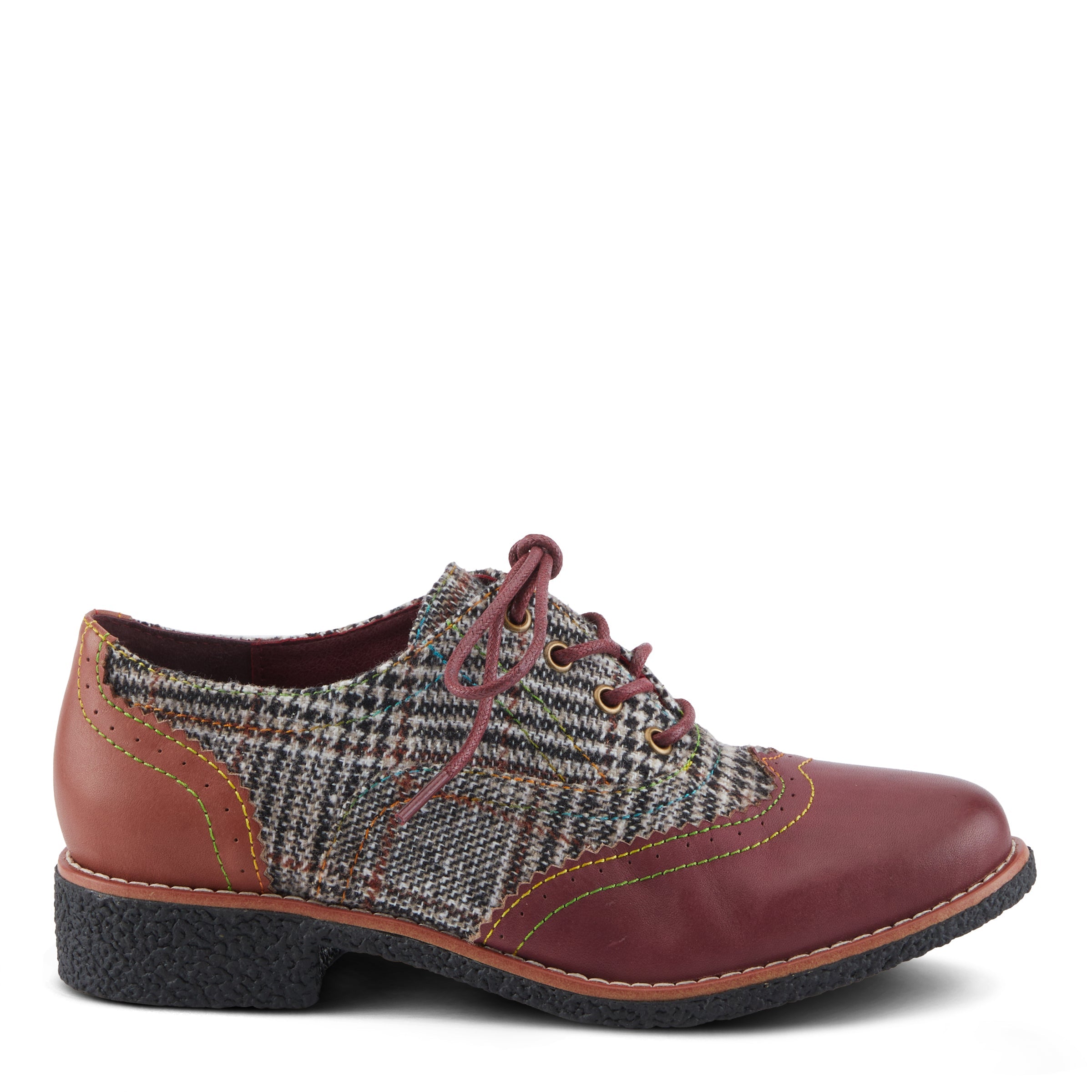 Oxford brogue de estilo tradicional con cuatro ojales, con encaje de algodón encerado, usando una hermosa mezcla de tela escocesa de lana de dos tonos con pieles pulidas y bruñidas de dos colores, sobre una suela de goma con textura de crepé con un pesado ribete natural cosido.