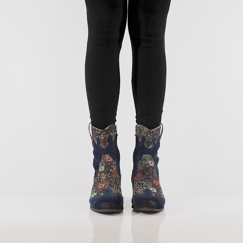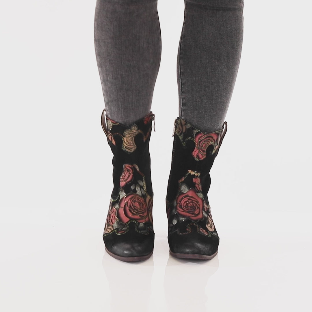 Este botín de tacón apilado inspirado en el oeste es una pieza llamativa que seguramente llamará la atención. El diseño floral iridiscente y metálico pintado a mano es un hermoso toque que agrega un toque único y personalizado al diseño general. El acabado cepillado y bruñido le da al zapato una sensación rústica que es perfecta para cualquier atuendo inspirado en el oeste. El cierre de cremallera permite ponérselo y quitárselo fácilmente, al tiempo que garantiza un ajuste seguro. El talón apilado brinda la cantidad justa de elevación, lo que lo hace cómodo para usar todo el día. El diseño del botín es atrevido y femenino, lo que lo convierte en una opción versátil para cualquier ocasión. Ya sea que se vista elegante o informalmente, el botín de tacón apilado inspirado en el oeste es imprescindible para cualquiera que busque agregar un toque de estilo occidental a su colección de calzado.