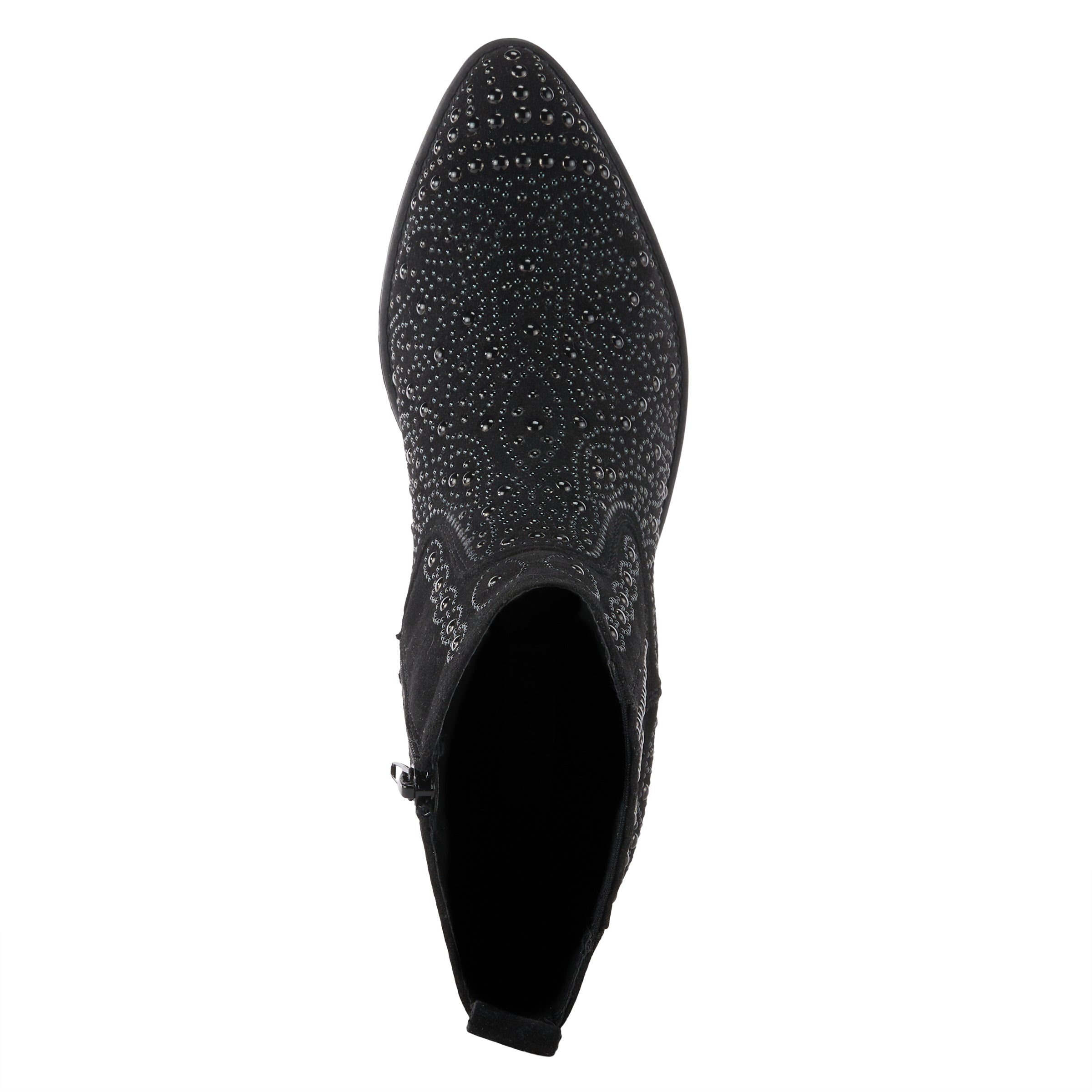 Esta bota de microgamuza de inspiración western es la combinación perfecta de moda y funcionalidad. El intrincado detalle de tachuelas añade un toque de vanguardia, mientras que el cierre y la cremallera facilitan su uso. Esta bota también cuenta con inserciones de gamuza ocultas para una apariencia elegante. Una bota con tachuelas por todas partes transmite un aire feroz y vanguardista, perfecto para agregarle algo de actitud a cualquier atuendo.