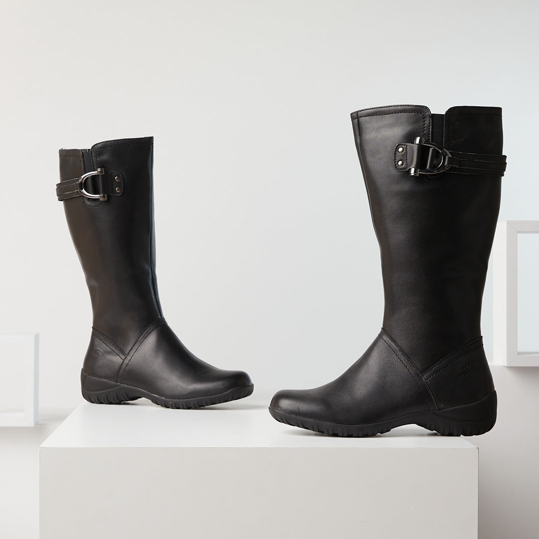 Bota de caña alta en piel impermeable decorada con adorno de metal hematite y gore elástico lateral.