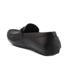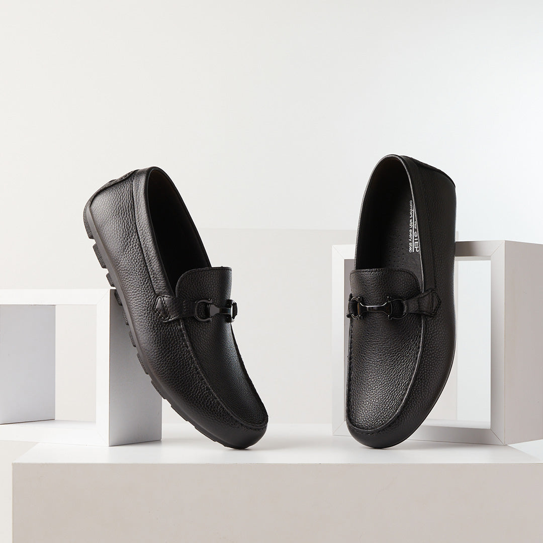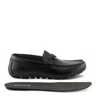 Zapato sin cordones estilo mocasín de conducción de hombre de moda en piel de grano completo suave molida con un delantal estilo mocasín cosido a mano, un borde de sillín de metal de color brillante a juego, cómoda plantilla extraíble de poliuretano suave y forro de piel, todo en un poliuretano flexible. suela.