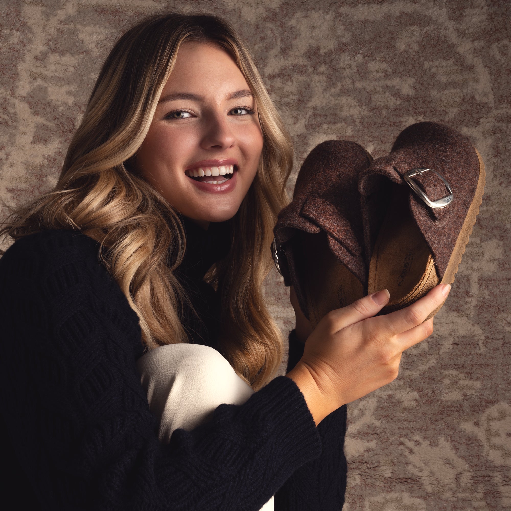 Step up your cozy style with these updated classic clog slippers. Crafted with a warm boiled wool upper and a soft suede insole, they offer a perfect balance of comfort and cool, comfy-chic design. The decorative buckle adds a stylish touch, while the hook and loop closure ensures a secure, adjustable fit. The flexible sole makes every step effortless, and the versatile color combinations make these clogs perfect for lounging or casual outings.