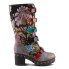 Diseño de bota moderno con eje de tapiz floral bordado textil de inspiración francesa con cinco (5) correas remachadas y diseños de hebillas individuales en una silueta de bota moderna, con un contrafuerte y empeine de cuero con diseño floral en relieve multicolor, todo en una suela con estampado floral y puntadas de arcoíris incrustación de pared lateral.