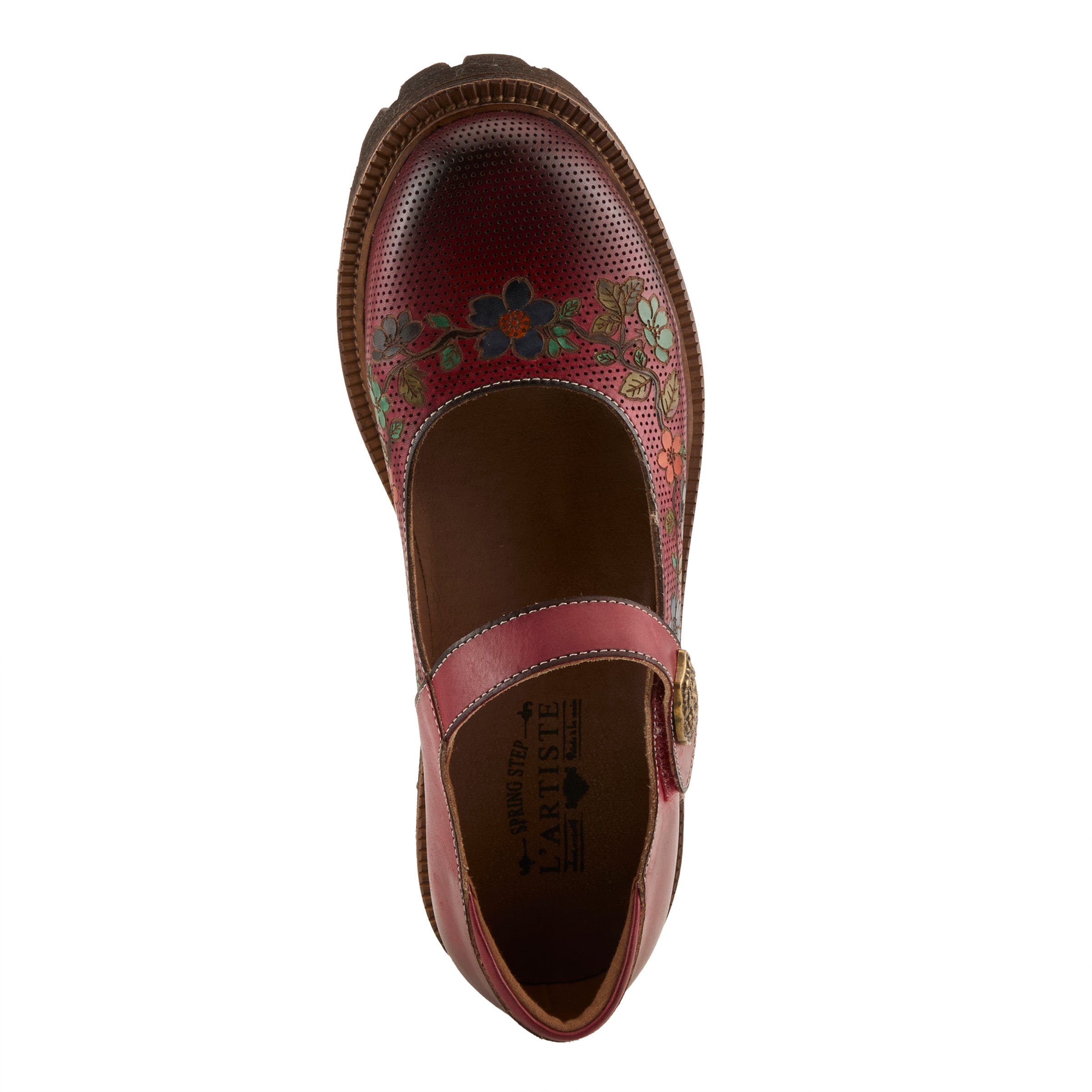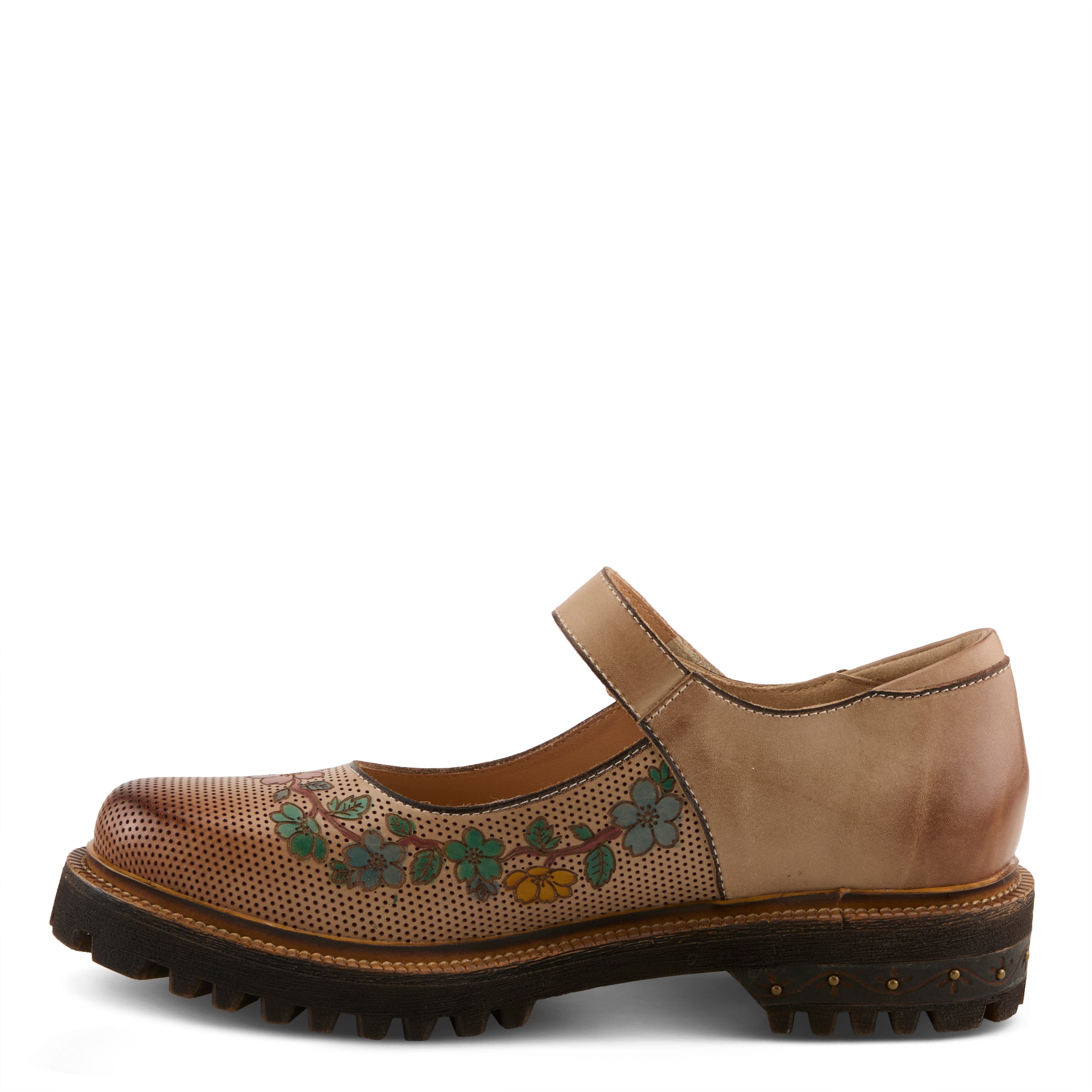 A modern take on a classic silhouette, this boho-chic Mary Jane is a work of wearable art. Crafted from premium hand-painted leather, it features intricate floral detailing across the upper, giving it a soft, feminine touch. A hook-and-loop closure with an antique-inspired embellishment provides easy adjustability while adding a vintage feel. The subtly etched heel and rugged lug outsole create the perfect blend of delicate charm and everyday durability. Whether you''re stepping out for a casual day or making a statement, this shoe offers the perfect balance of comfort and artistic flair.