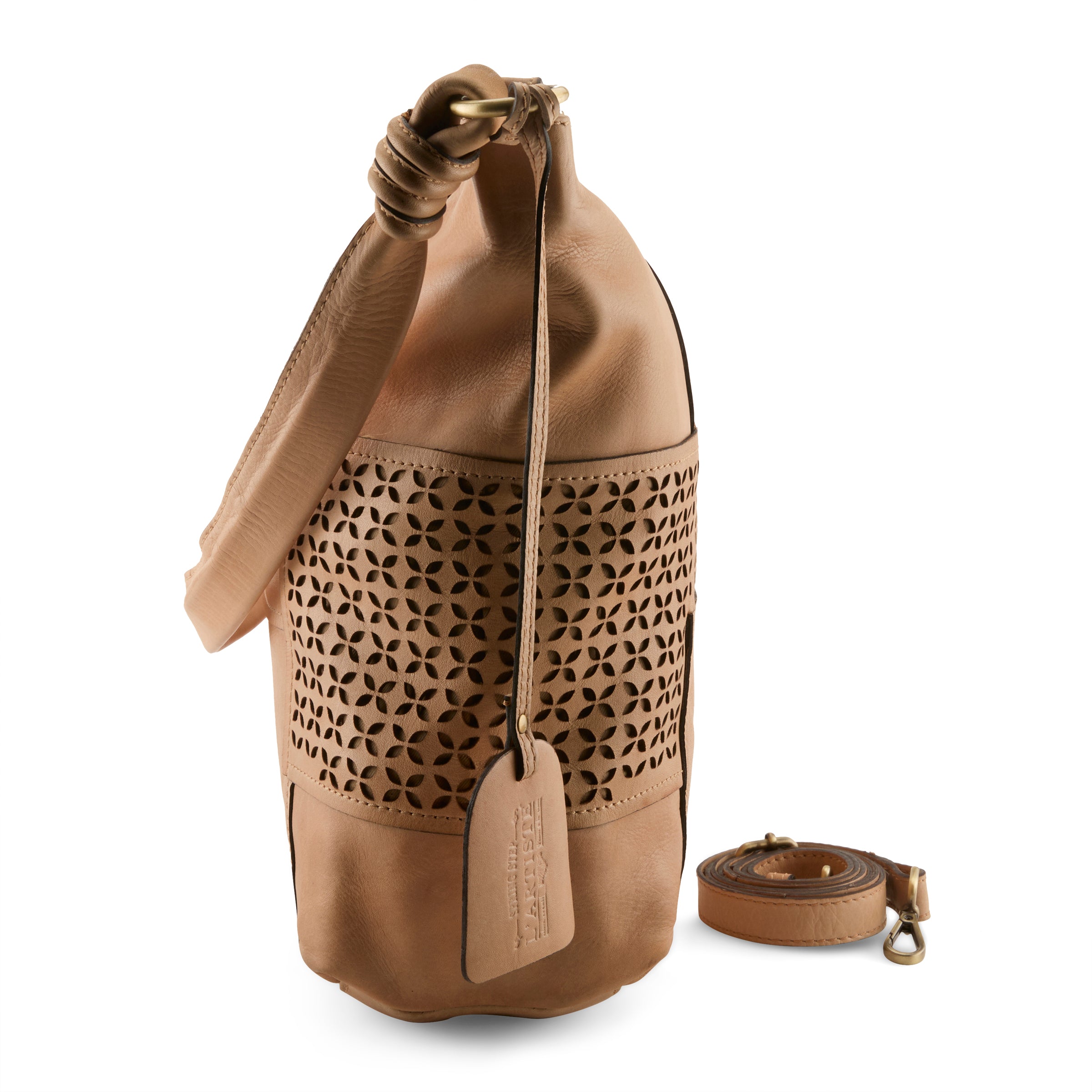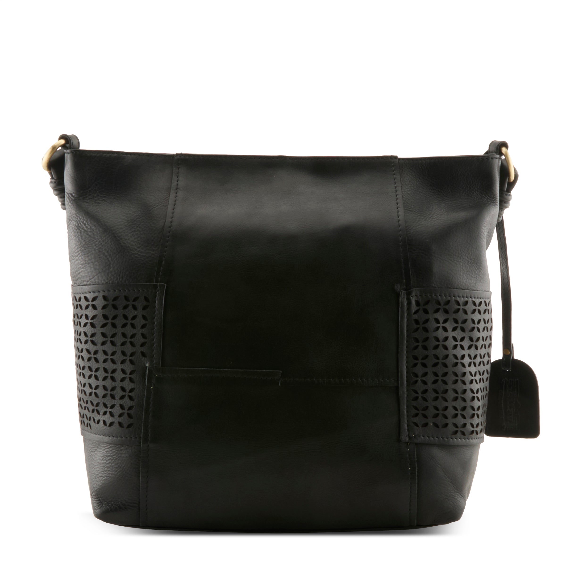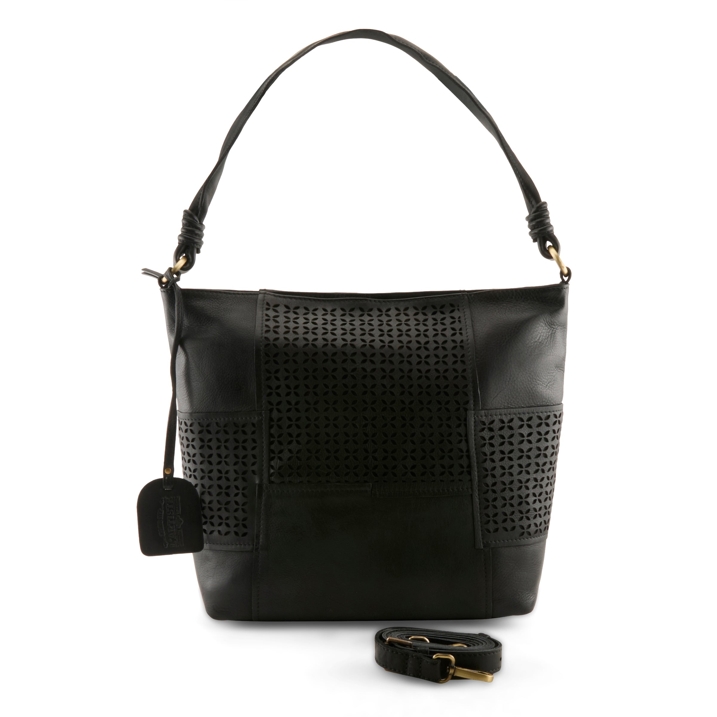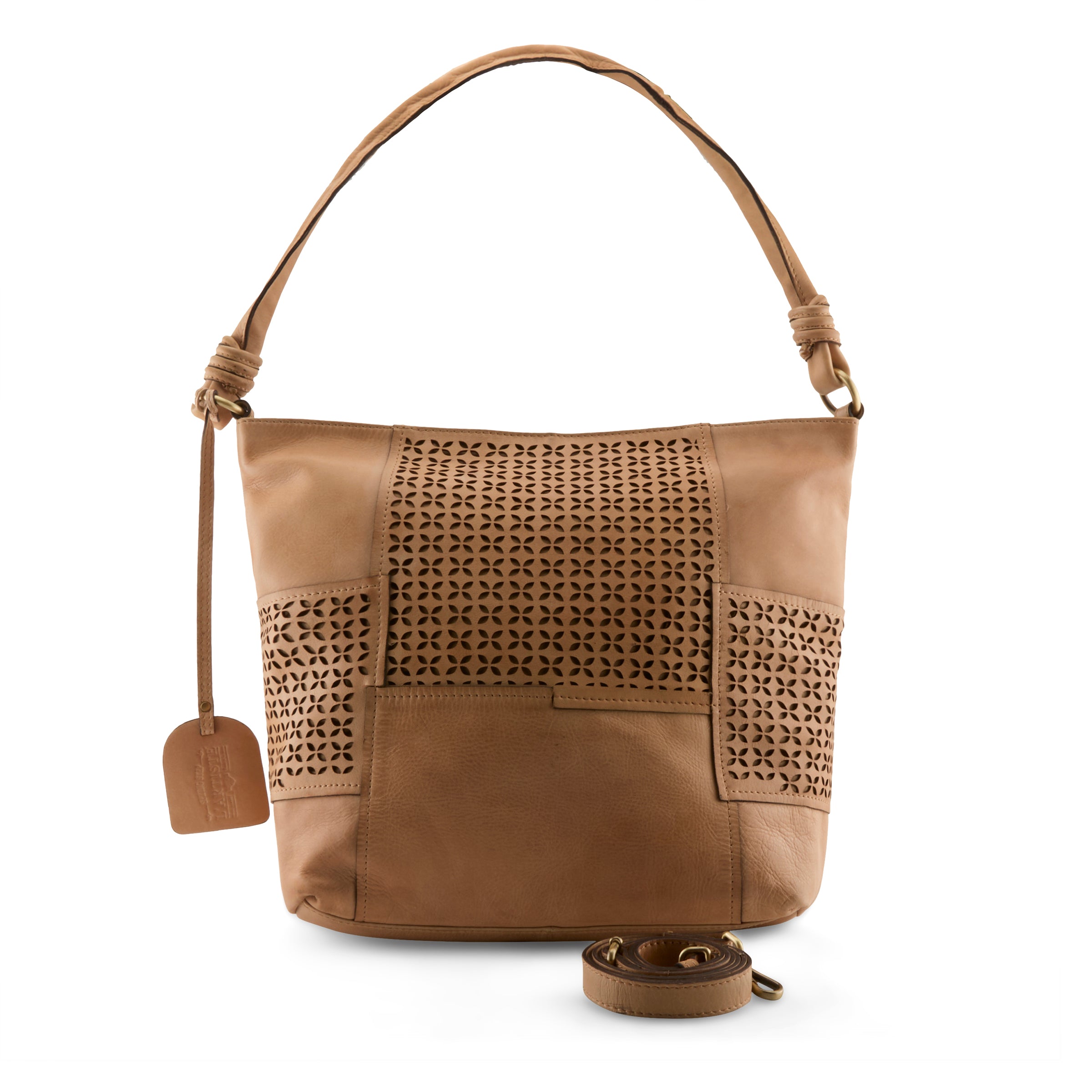 This soft buttery genuine leather crossbody/shoulder Hobo style bag we call Smoochie says it all! Its deliciously soft and well…. Smoochie! Alternating petal-like geometric full front and side laser-cut patterns in a repeating diamond-flower motif give it a contemporary but slightly bohemian feel, while the smooth sections of leather keep it looking polished and professional. The adjustable detachable strap allows for a handsfree crossbody experience or wear her close to your body with our end knotted shorter shoulder strap. Single compartment interior with full walled zipper pocket and opposite dual open pouches.