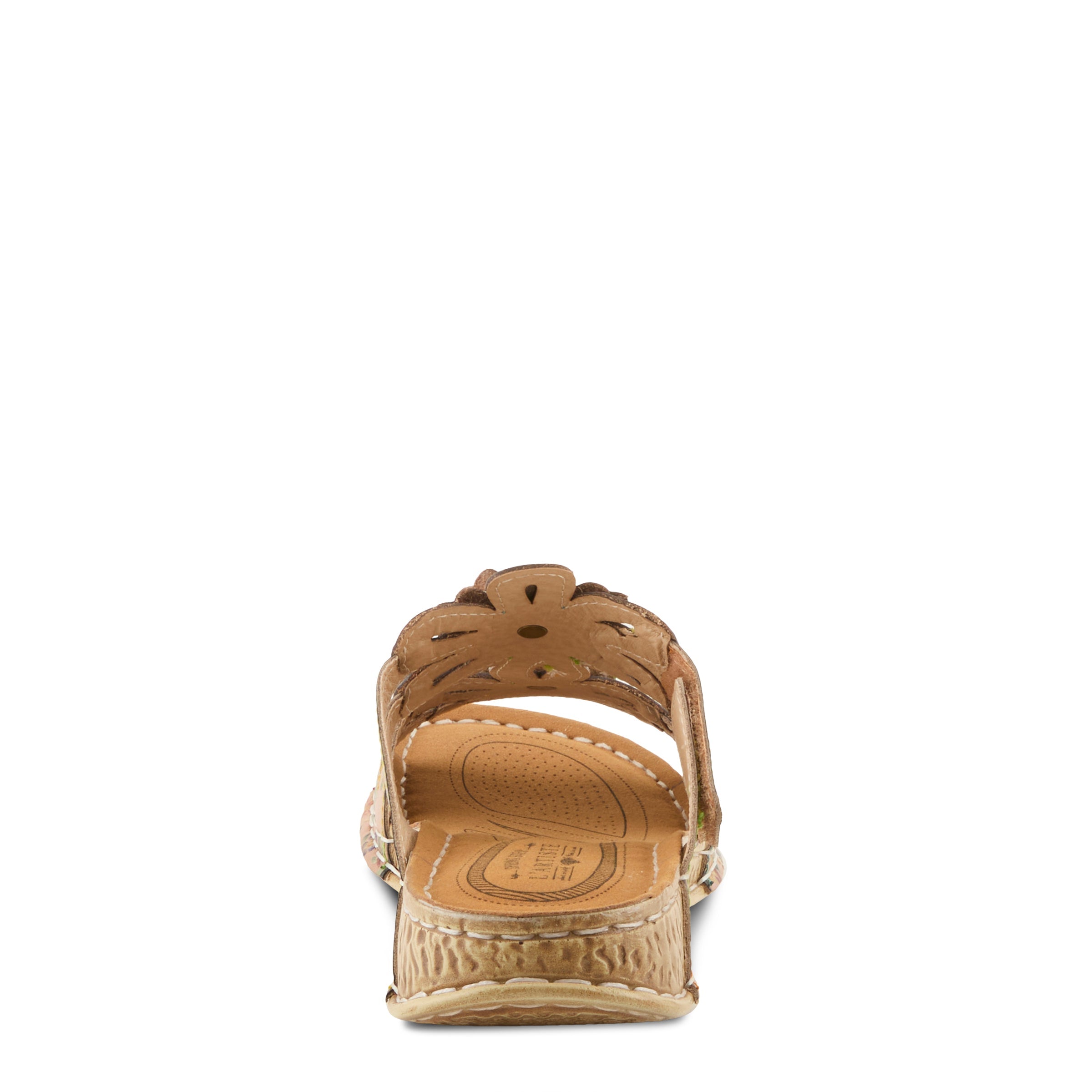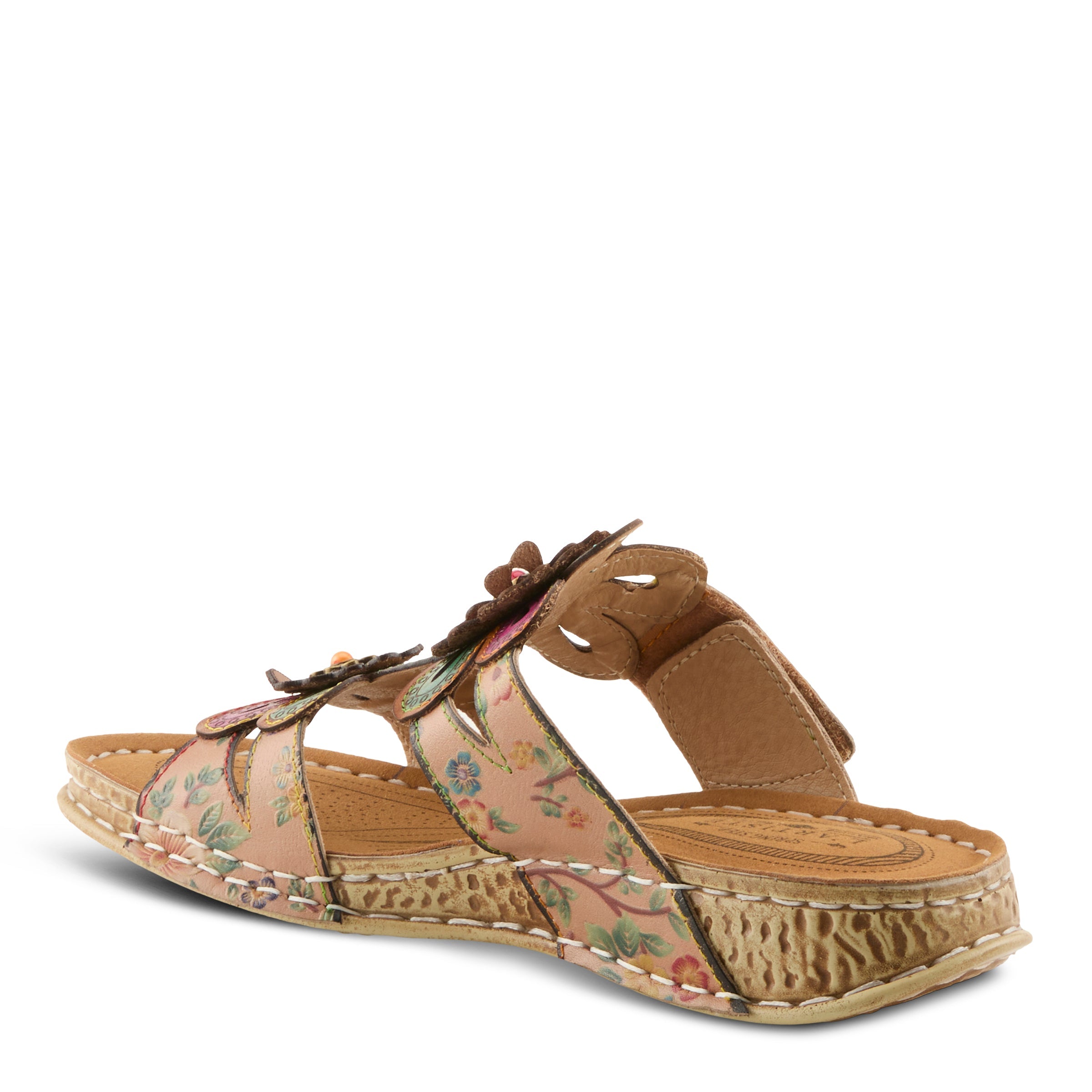 Step into timeless artistry with this hand-painted leather sandal, a design that balances comfort with signature L’Artiste flair. The upper showcases embossed floral motifs combined with dimensional leather flowers, each accented with antique-finish hardware and rounded conchos that add a heritage-inspired touch. The soft microsuede insole and cushioned footbed provide day-long comfort, while the flexible poly outsole allows effortless movement.