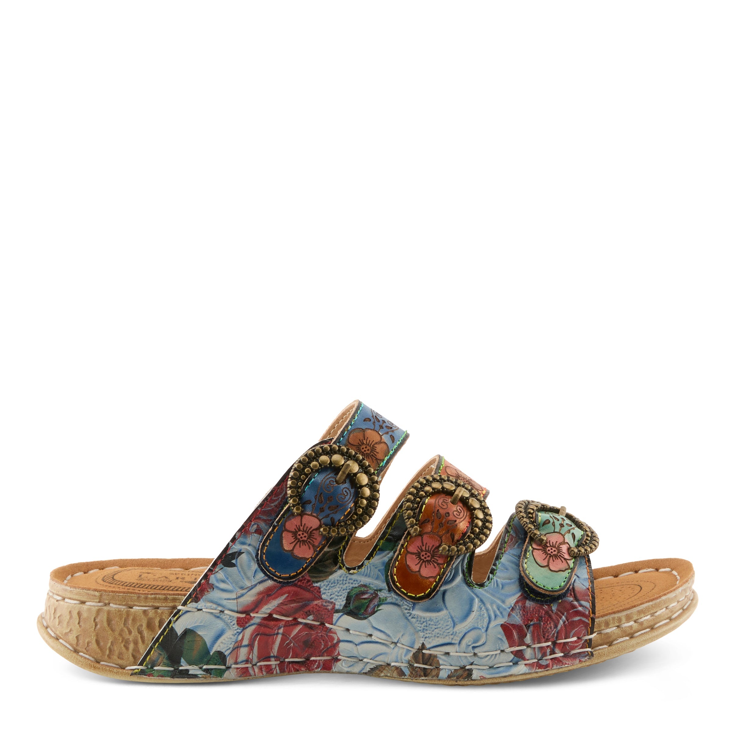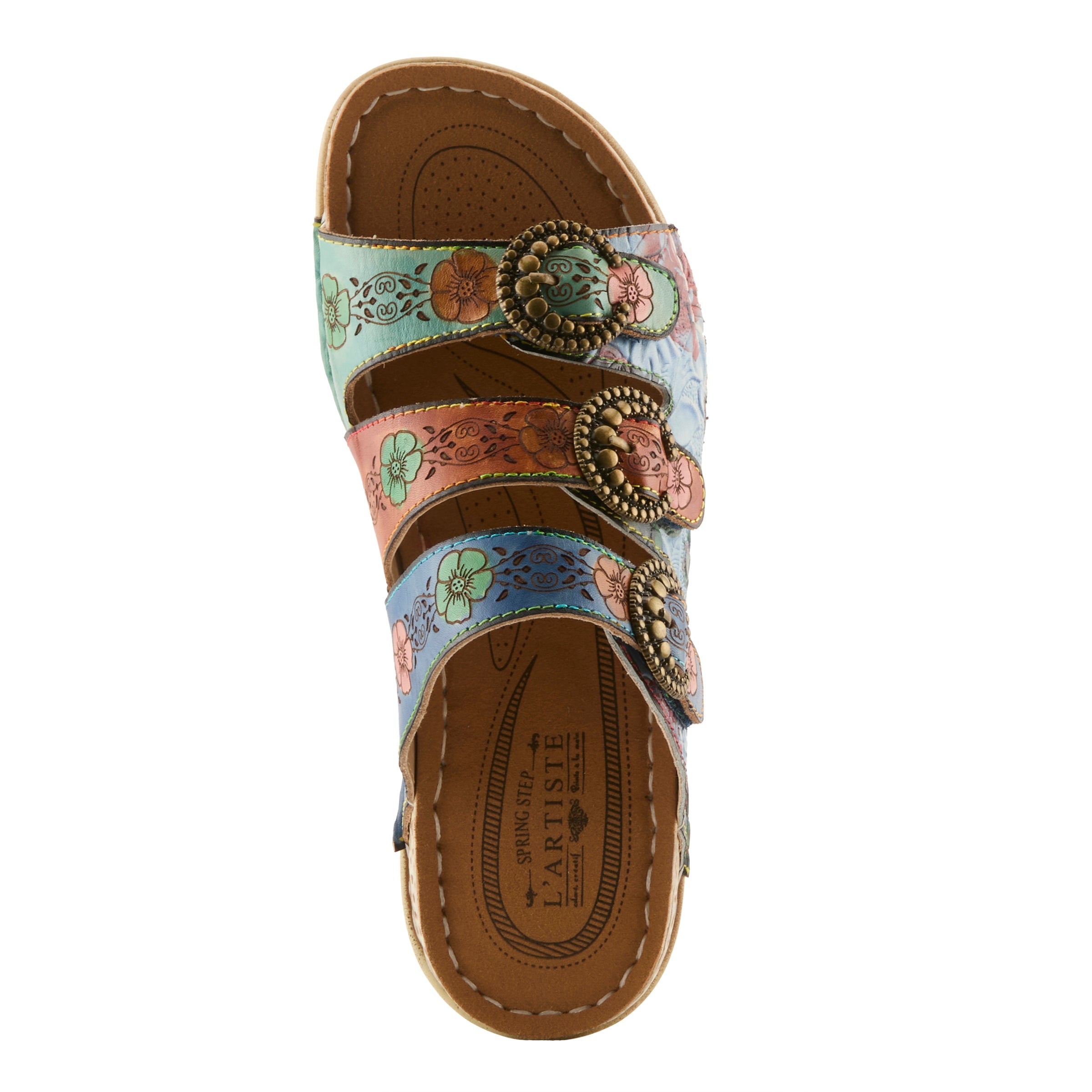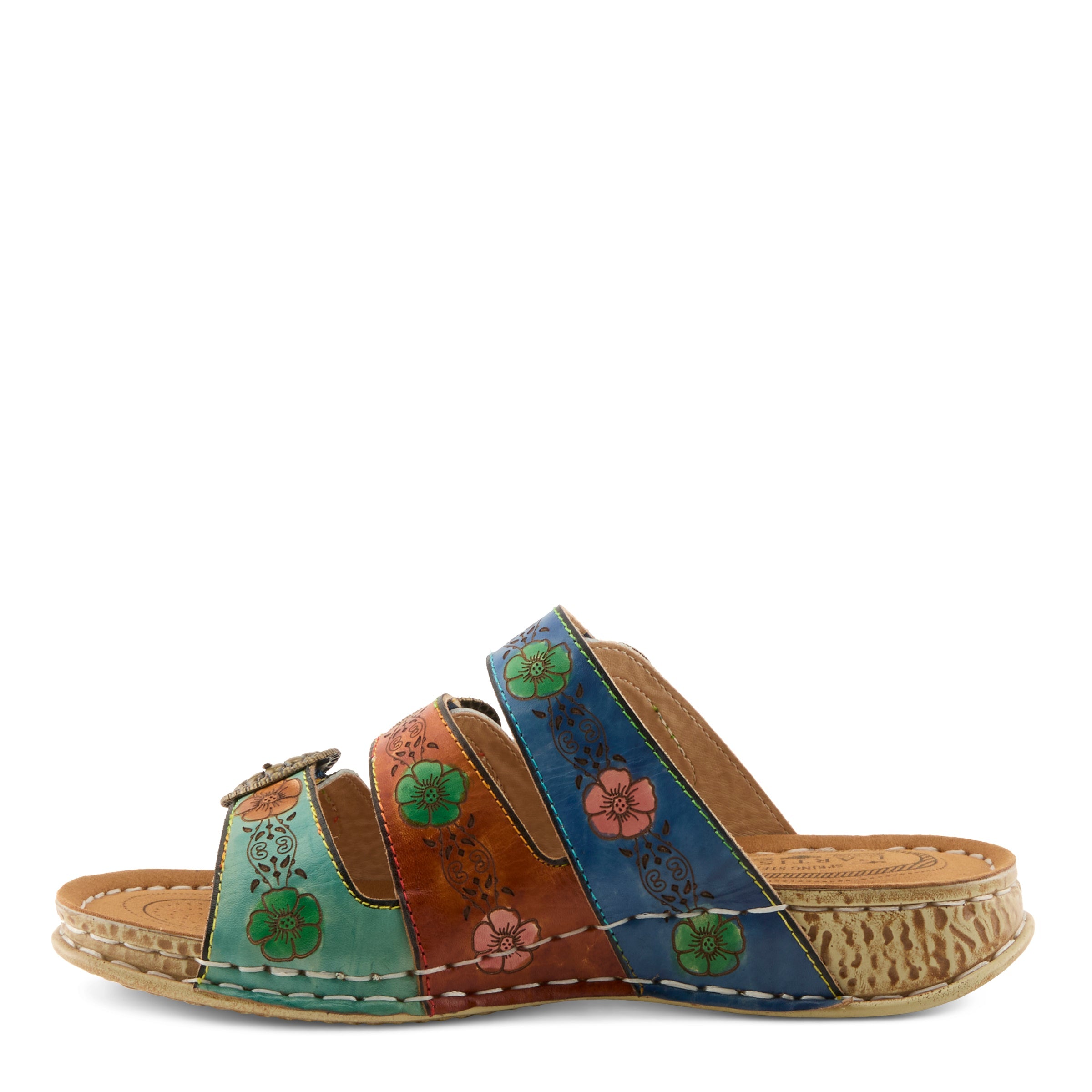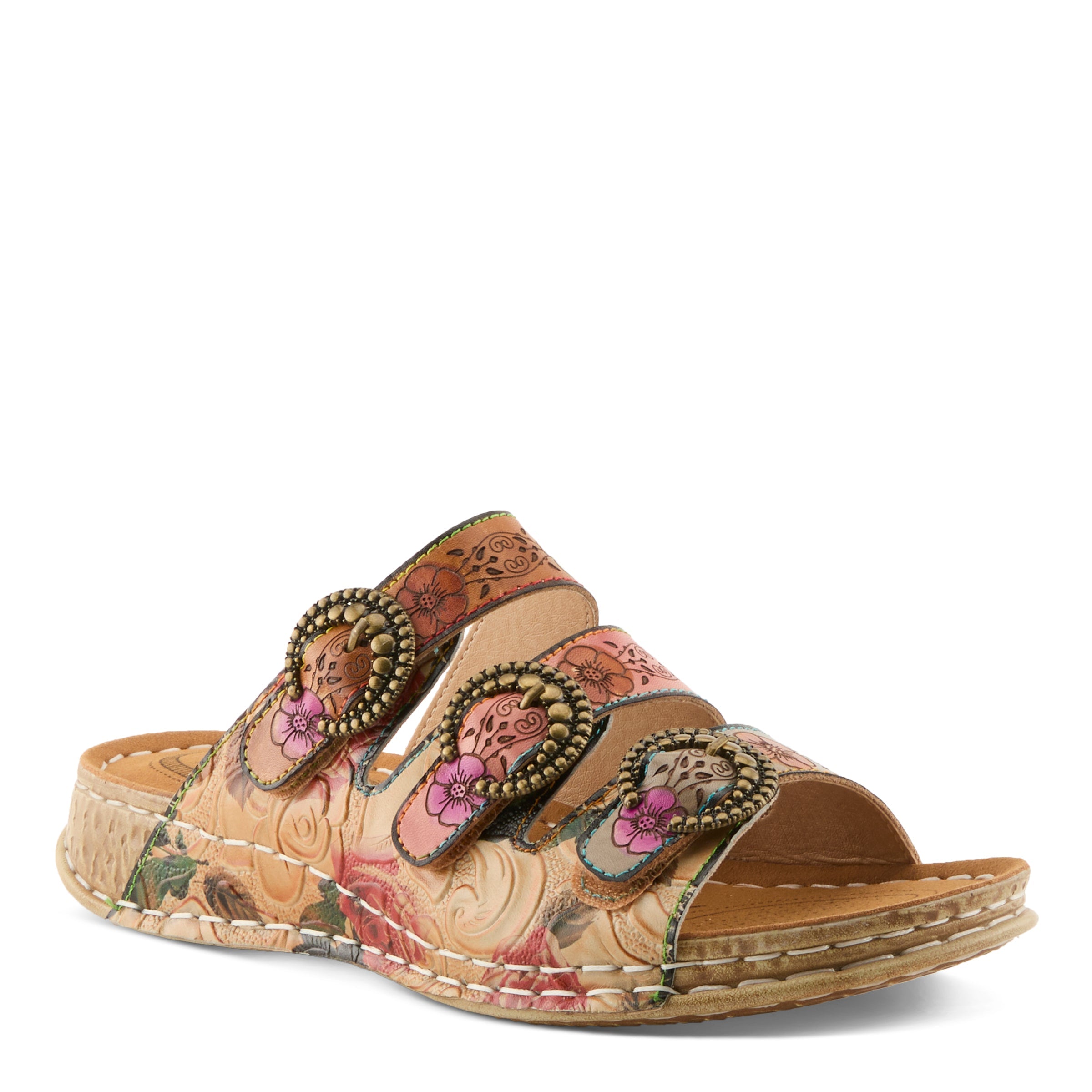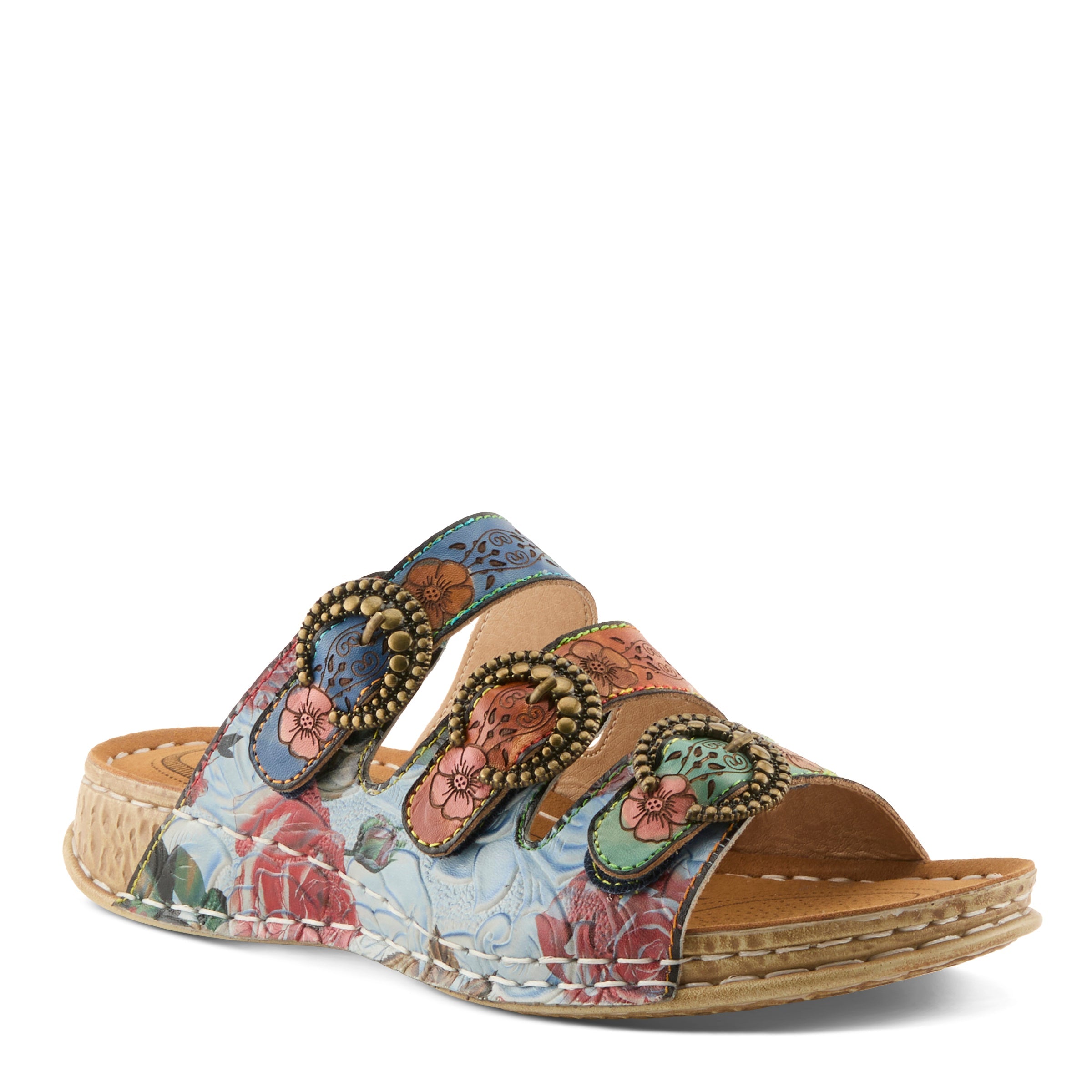 This hand-painted leather sandal brings timeless artistry to everyday comfort. The three-band design is beautifully detailed with embossed and laser-cut floral motifs, while antique-inspired oval buckles add a touch of heritage charm. The buckles, framed with a beaded edge and a delicately engraved floral medallion, elevate the sandal into a wearable piece of art. Built on a softly cushioned footbed and flexible outsole, this style blends tradition and comfort with effortless grace.