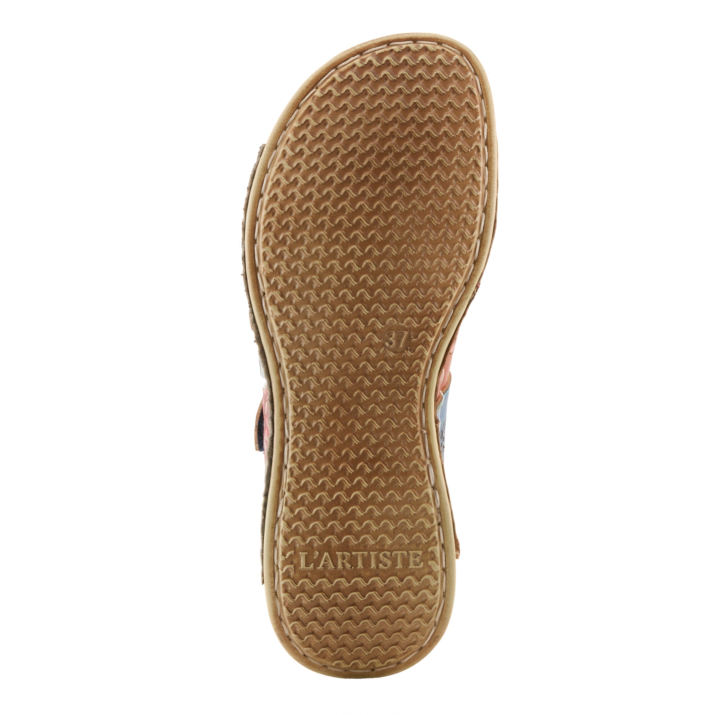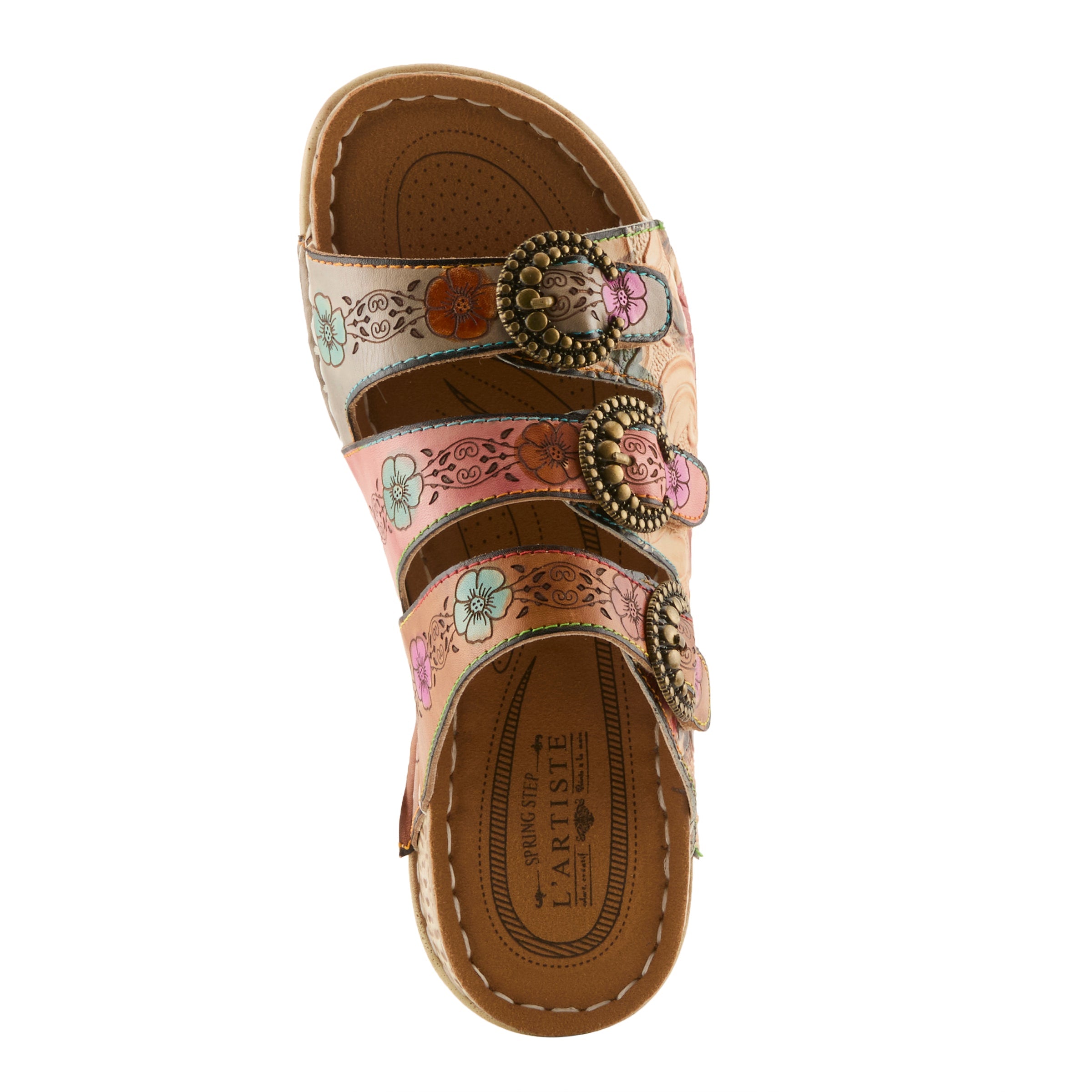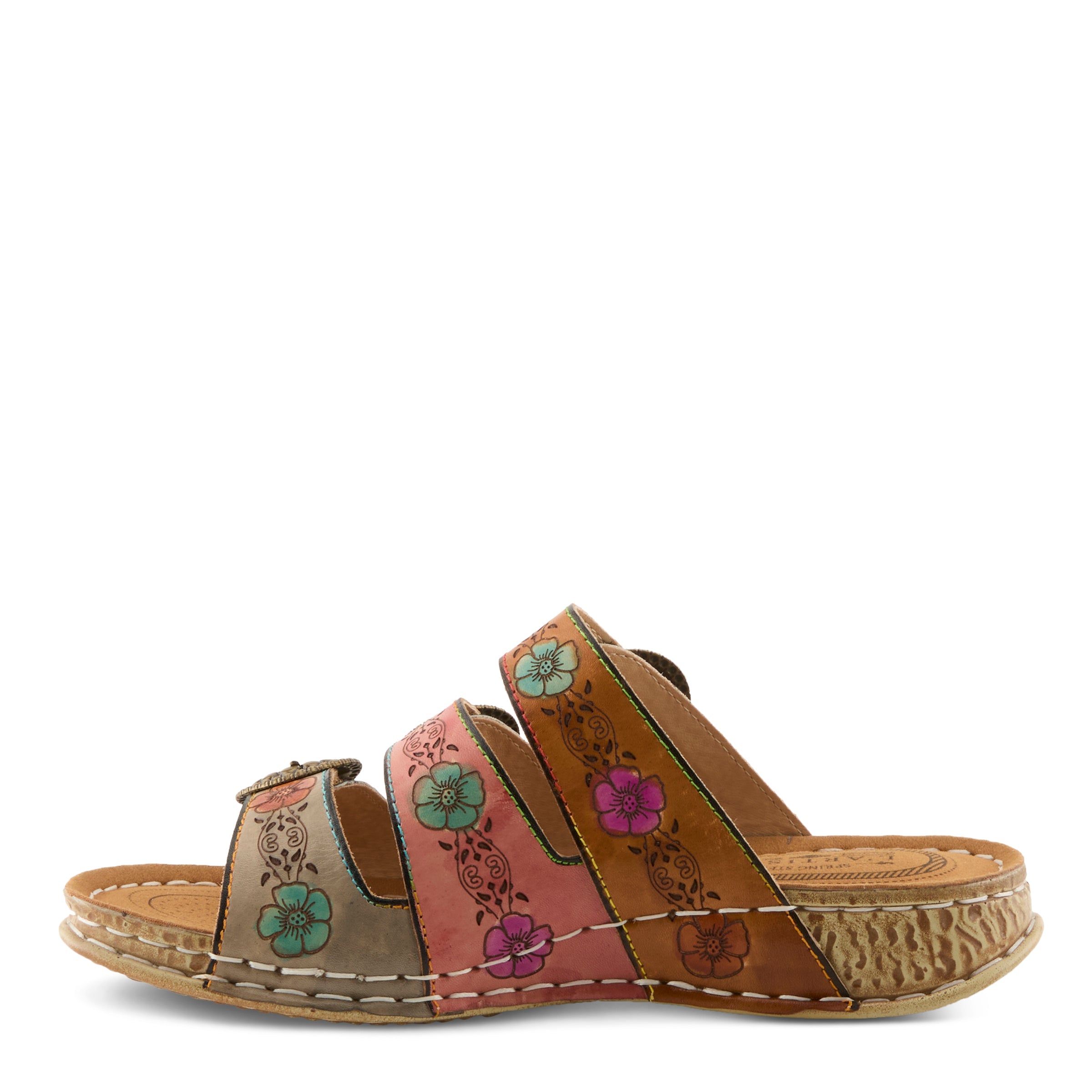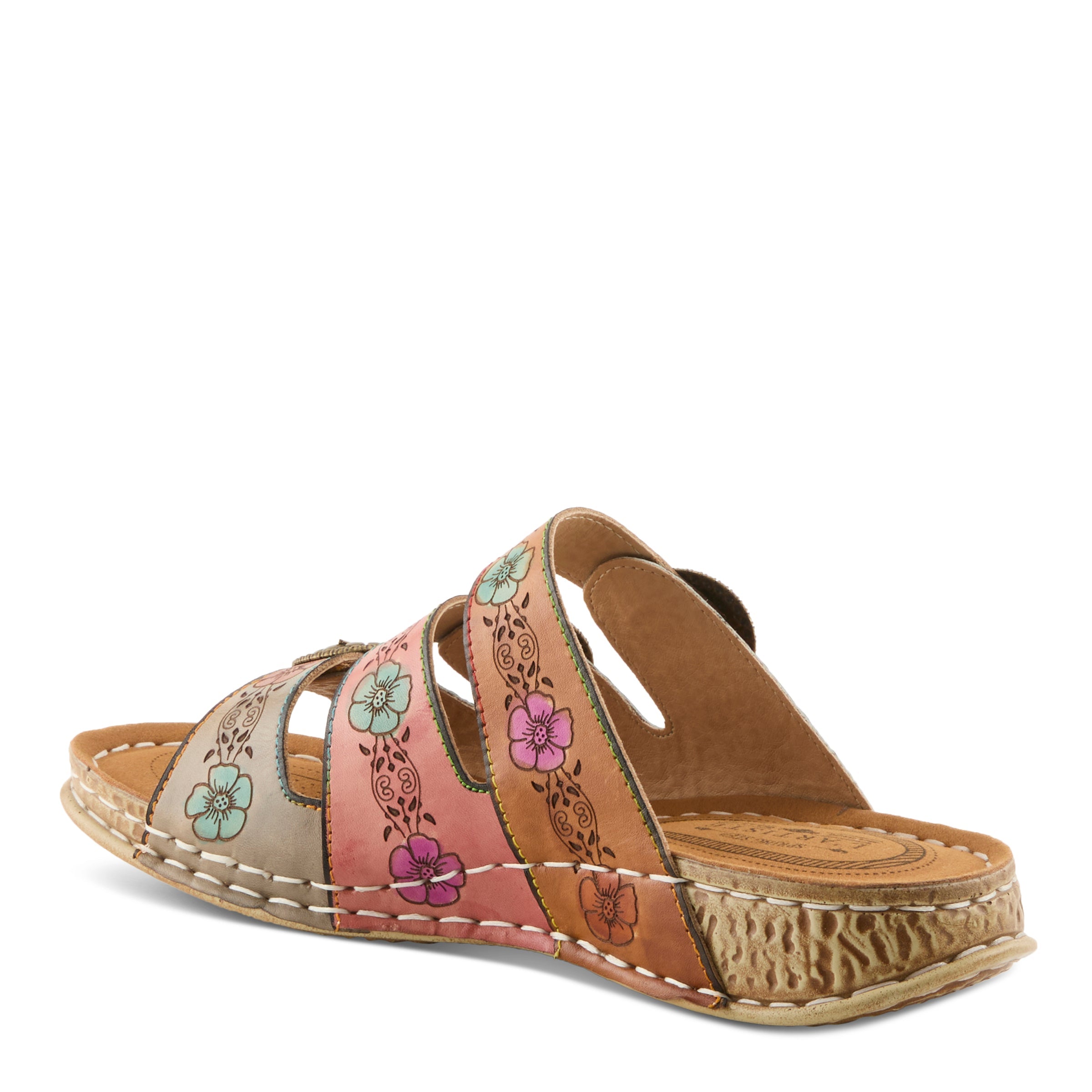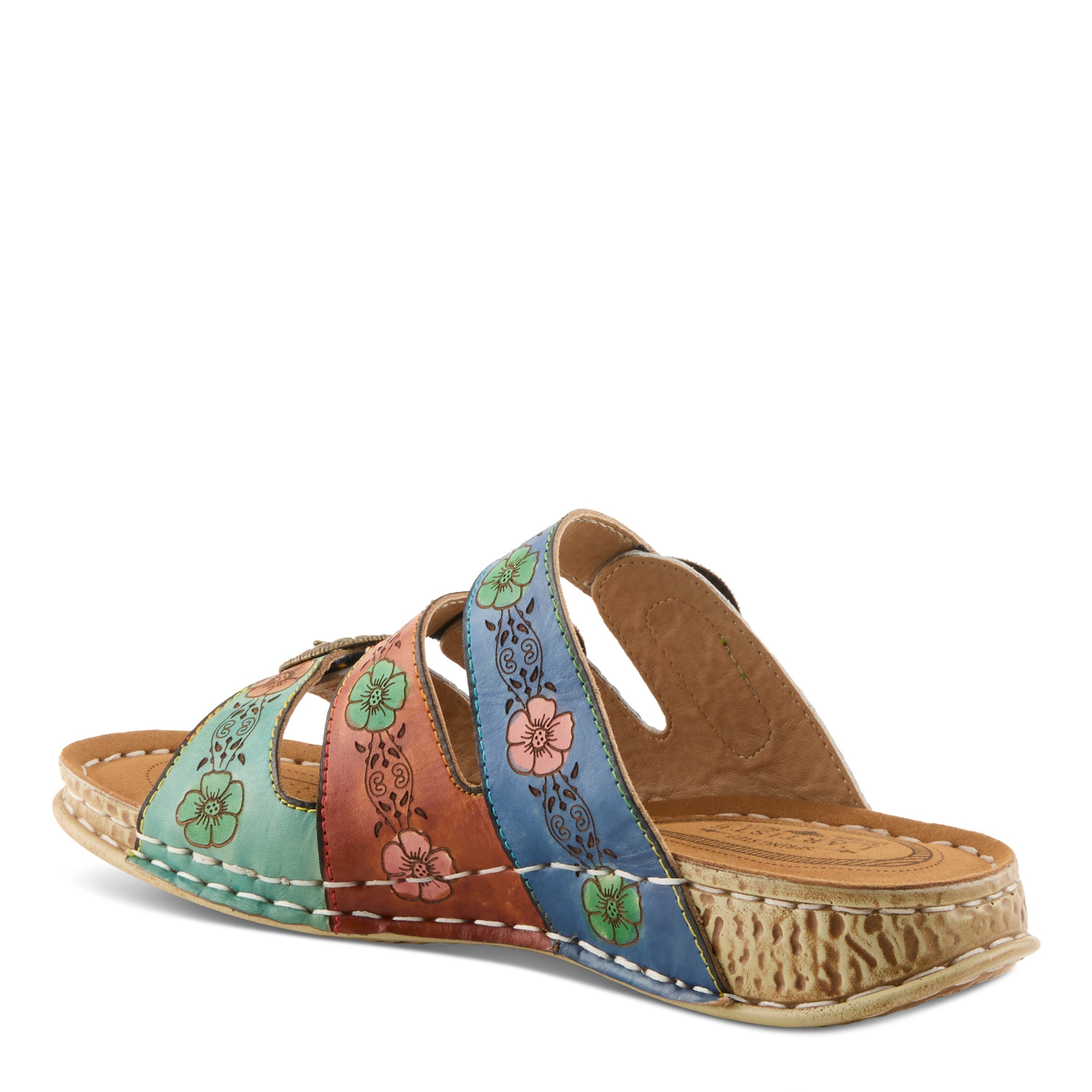 This hand-painted leather sandal brings timeless artistry to everyday comfort. The three-band design is beautifully detailed with embossed and laser-cut floral motifs, while antique-inspired oval buckles add a touch of heritage charm. The buckles, framed with a beaded edge and a delicately engraved floral medallion, elevate the sandal into a wearable piece of art. Built on a softly cushioned footbed and flexible outsole, this style blends tradition and comfort with effortless grace.