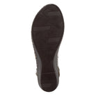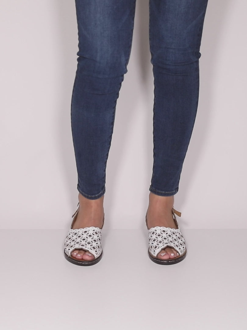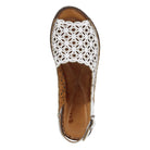 Sandalia destalonada de cuero de primera calidad de inspiración europea que presenta un corte geométrico láser y un diseño grabado con un delicado detalle festoneado en la parte superior.