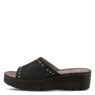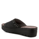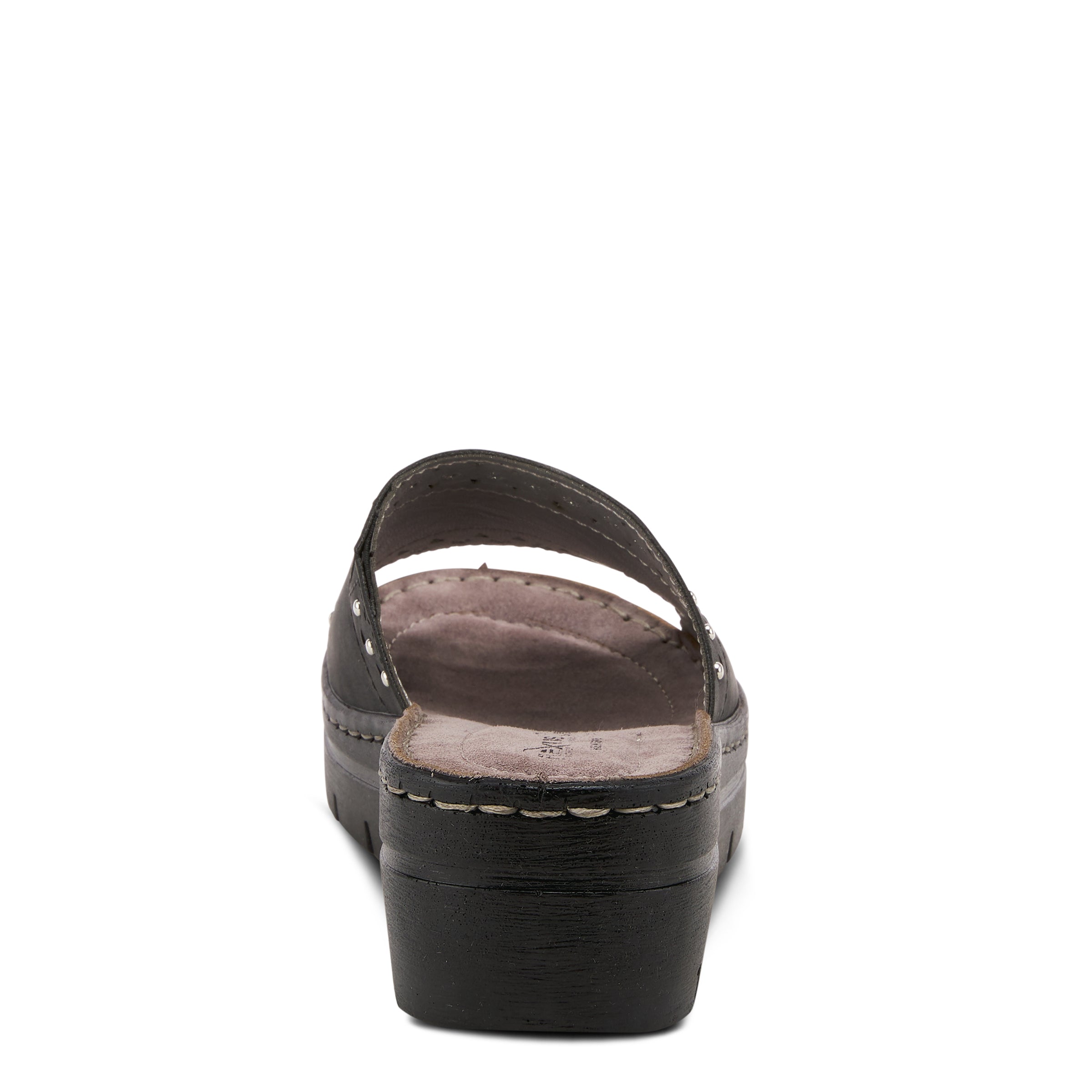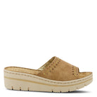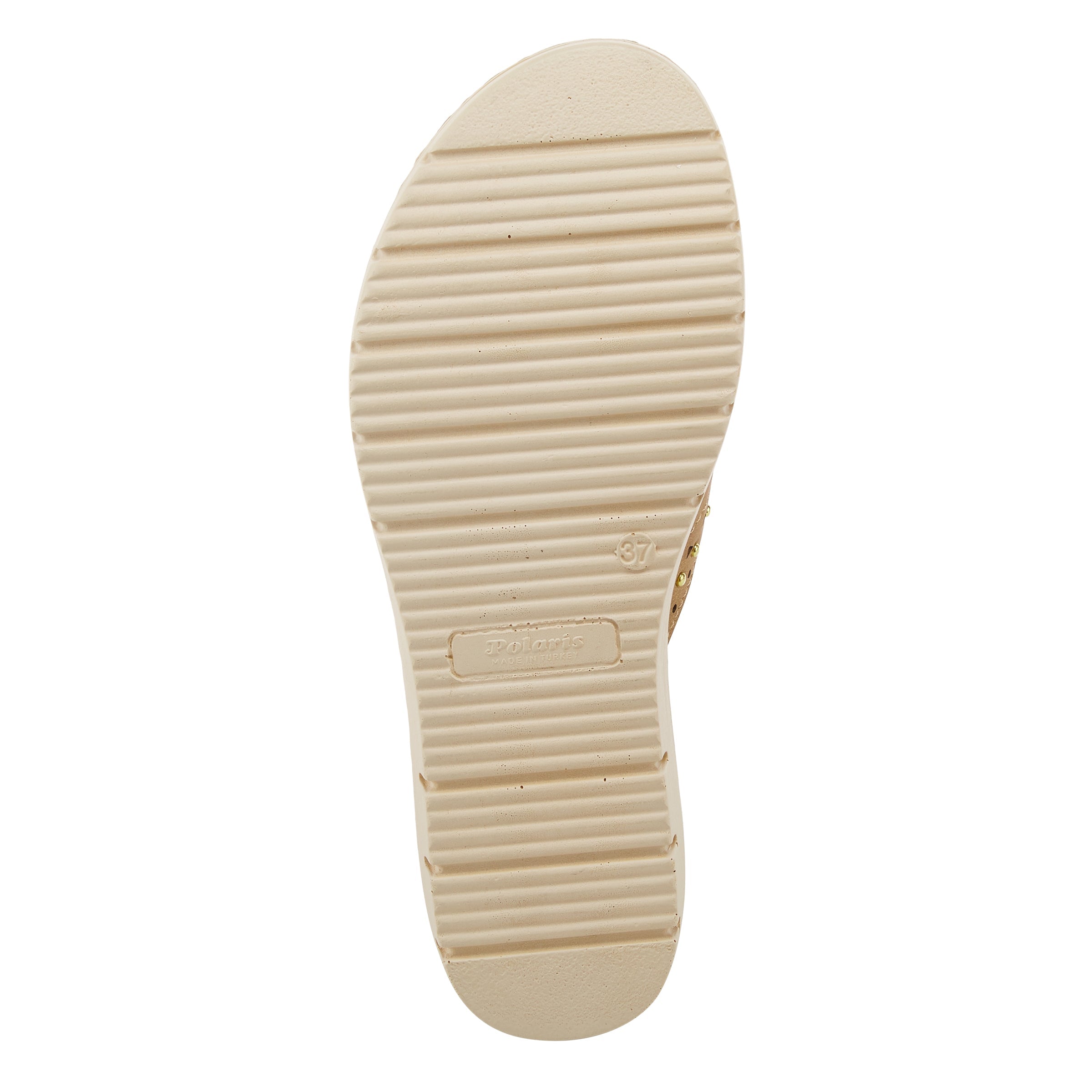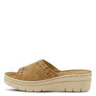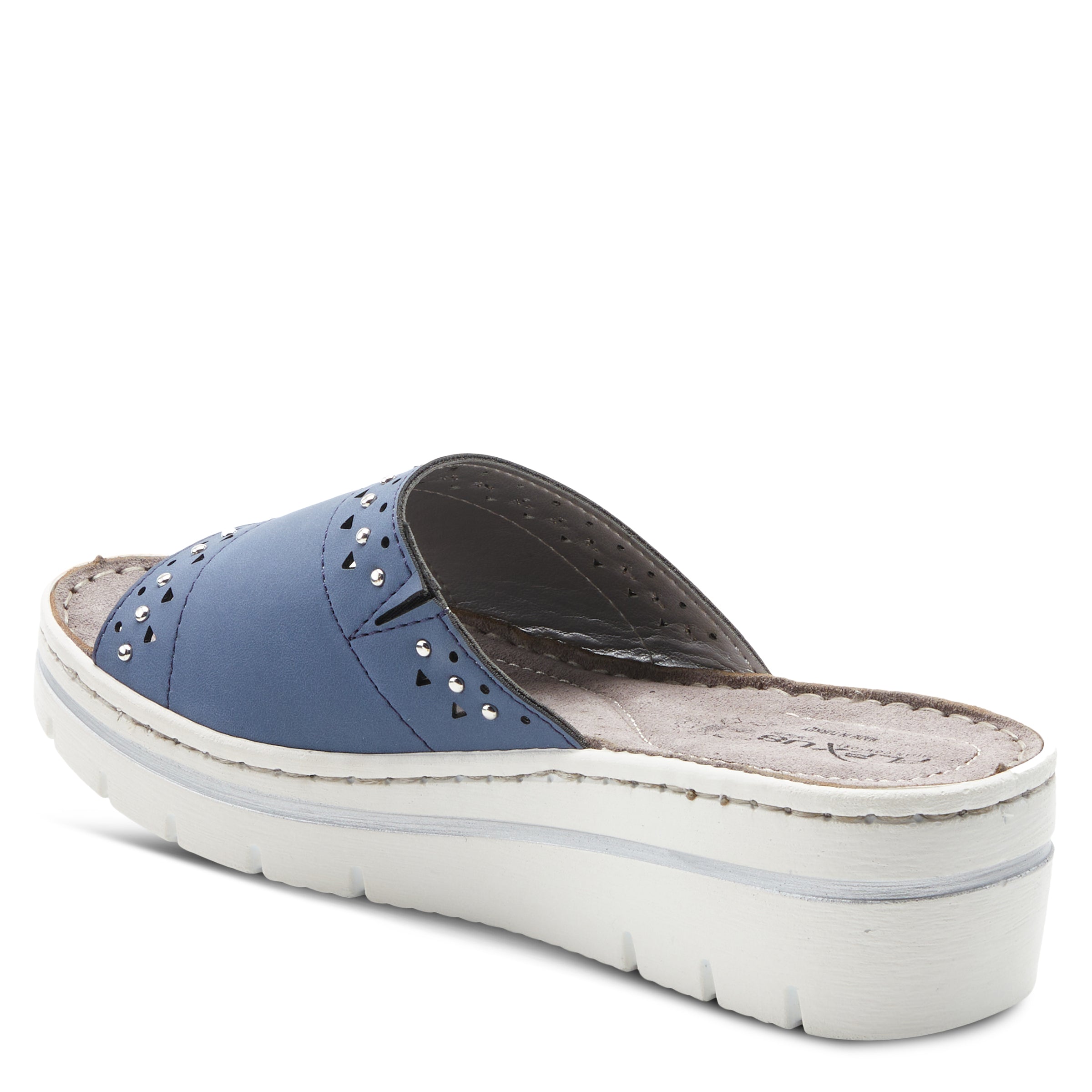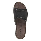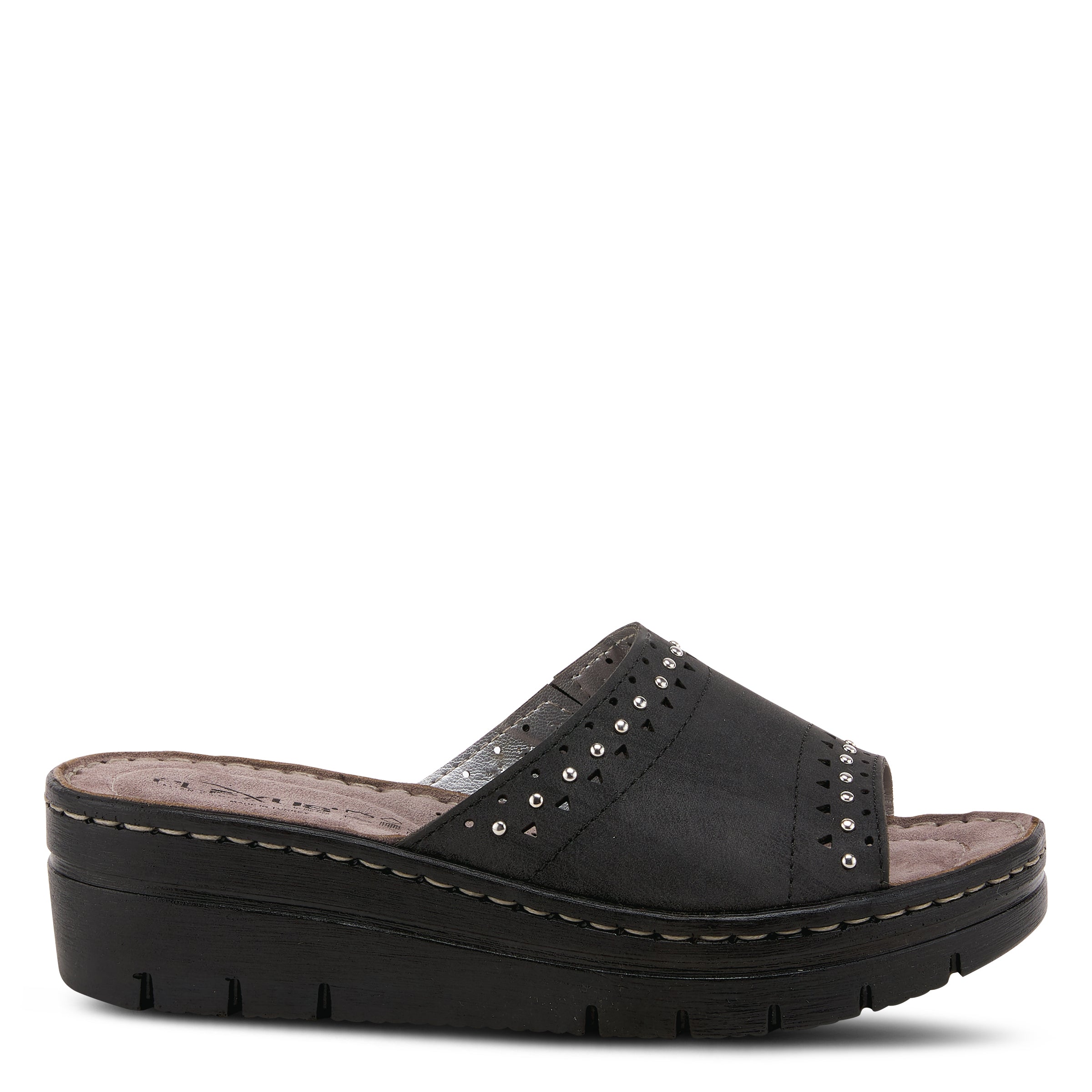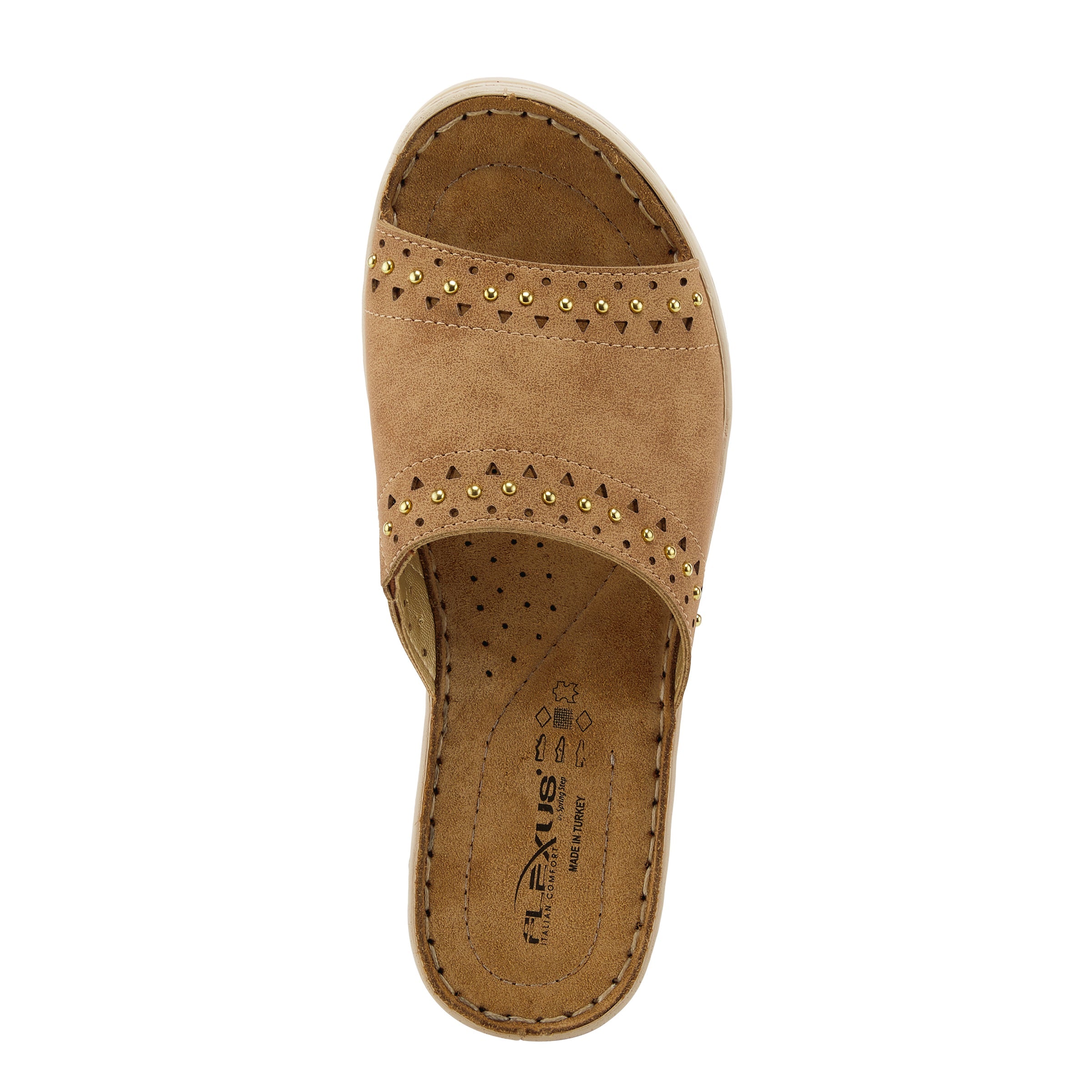 Sandalias tradicionales de una banda con delicados detalles de tachuelas y cortes, plantilla acolchada de cuero anatómico y una construcción de costura lateral fuerte para comodidad durante todo el día, todo en una suela de cuña con tacos a la moda.