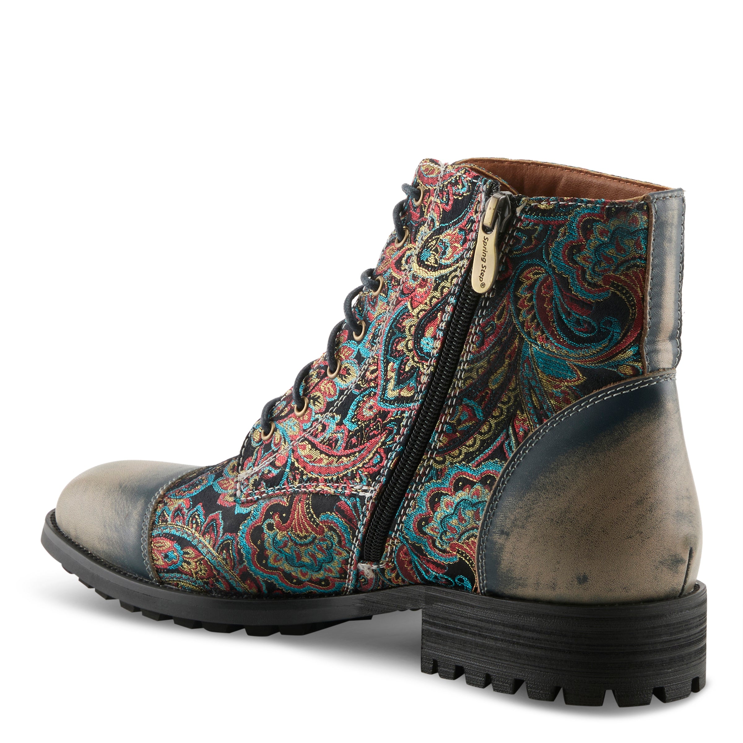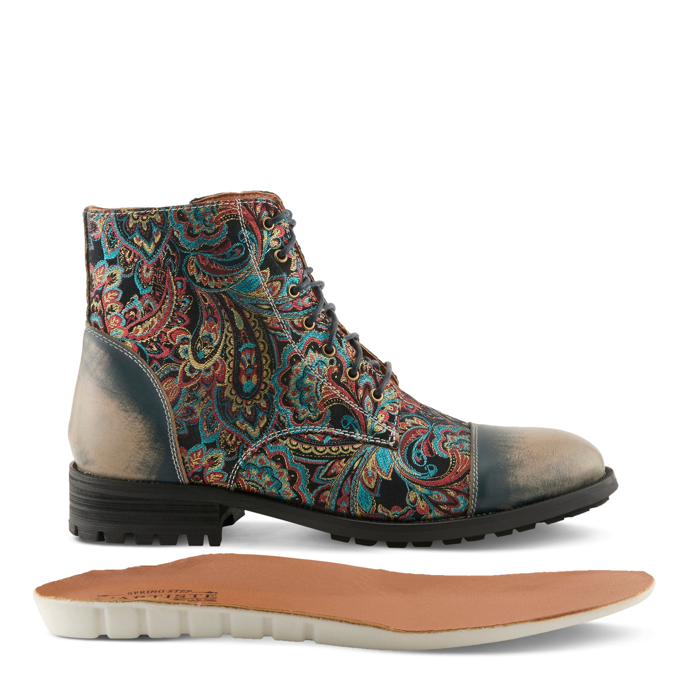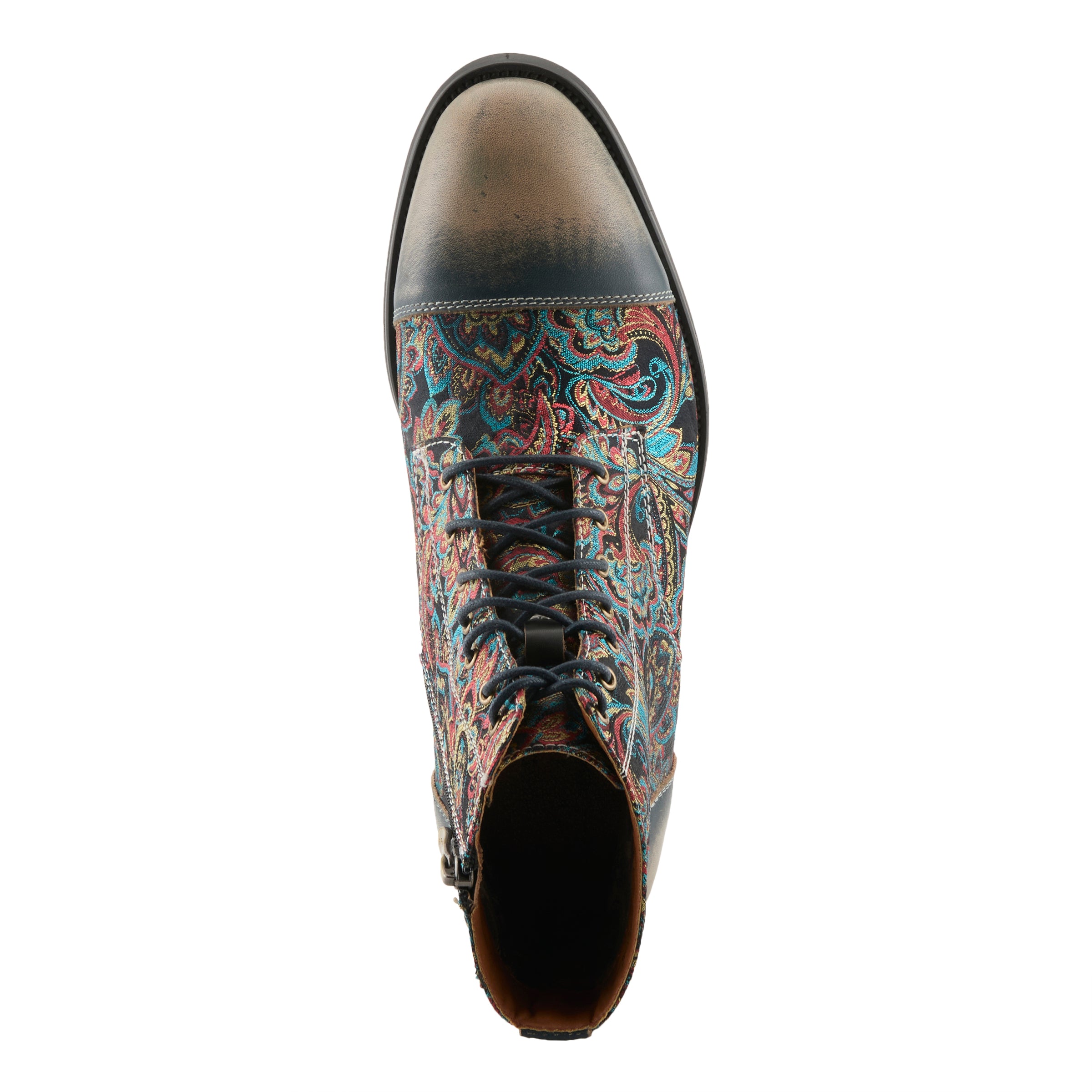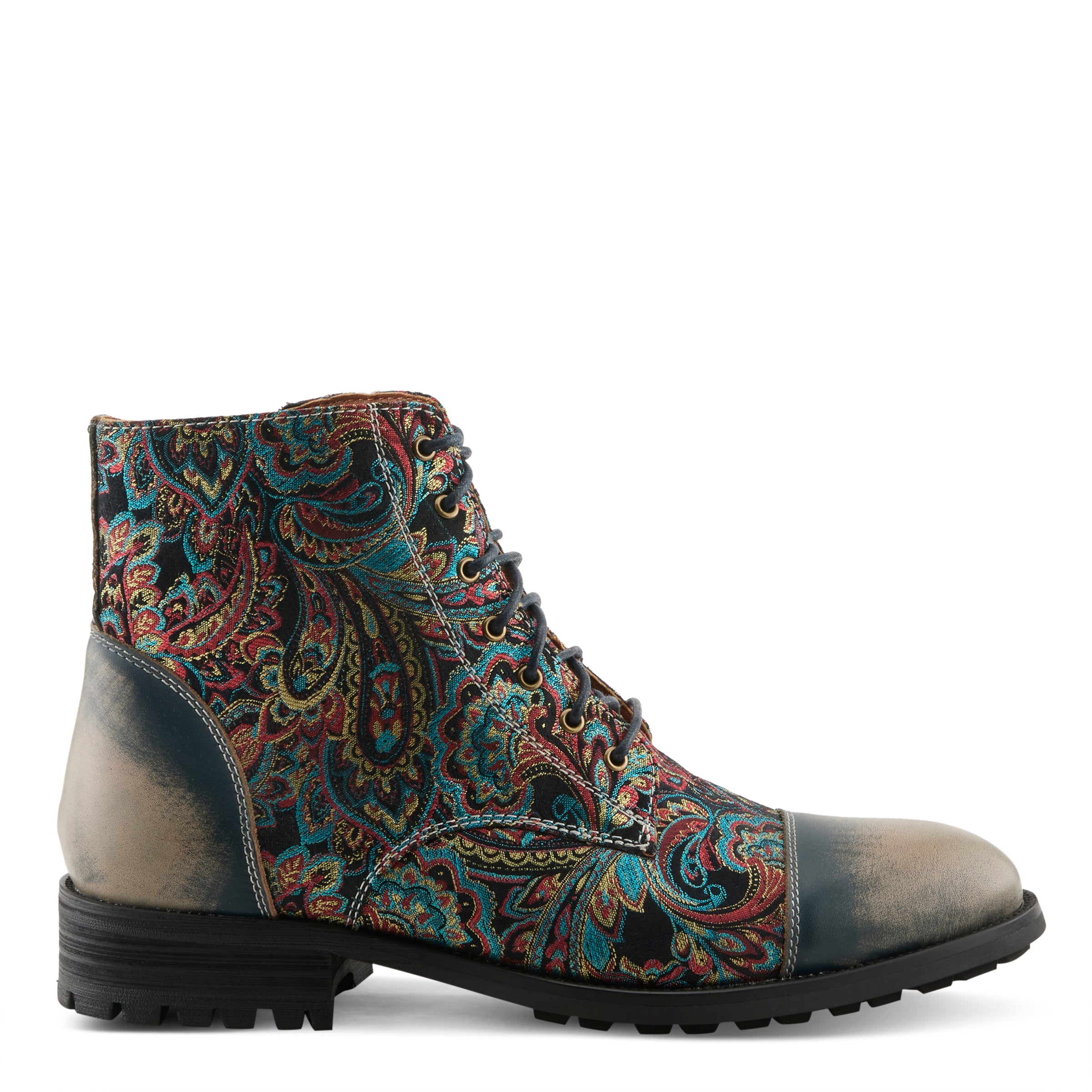 Haz una declaración con nuestras zapatillas altas para hombre con un estampado de cachemira multicolor y un acabado cepillado y bruñido. El cierre con cordones y cremallera garantiza un ajuste seguro, mientras que la apariencia de puntera añade un toque vanguardista a tu estilo. Ya sea que te vistas de manera elegante o informal, nuestras zapatillas altas con estampado de cachemira y acabado cepillado y bruñido son la opción perfecta para el hombre consciente de la moda que exige estilo y comodidad.