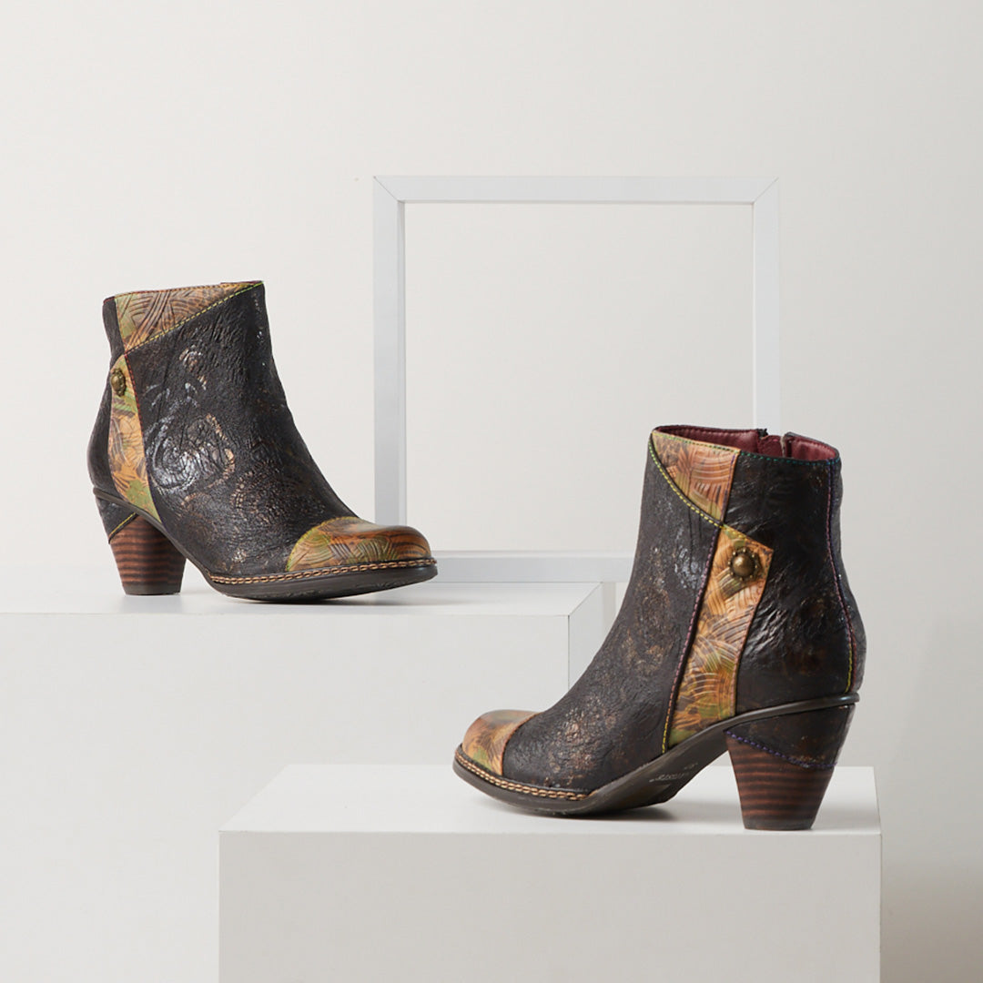 Botín de cuero de diseño francés con un aspecto sintético aplastado y en relieve con costuras de arcoíris vibrantes y un adorno de metal envejecido.