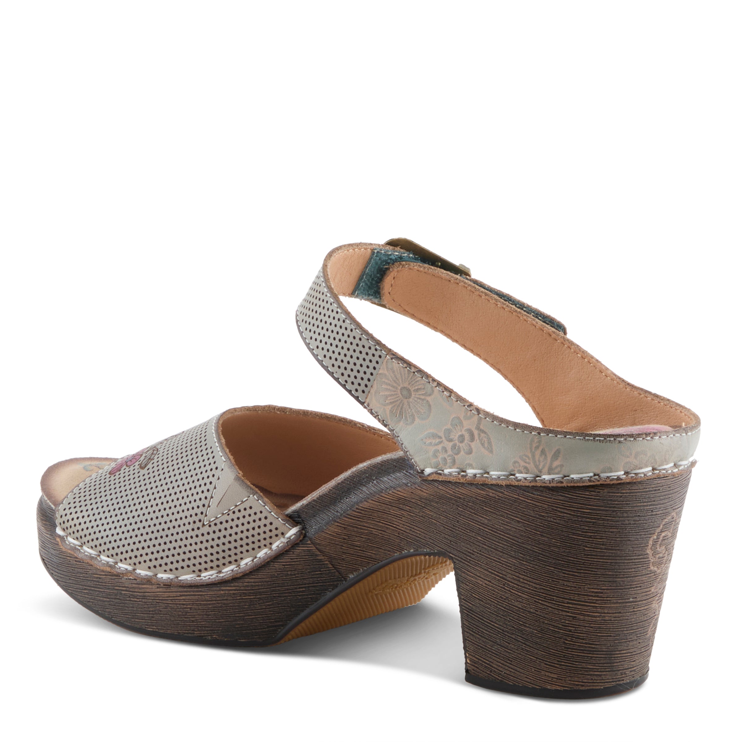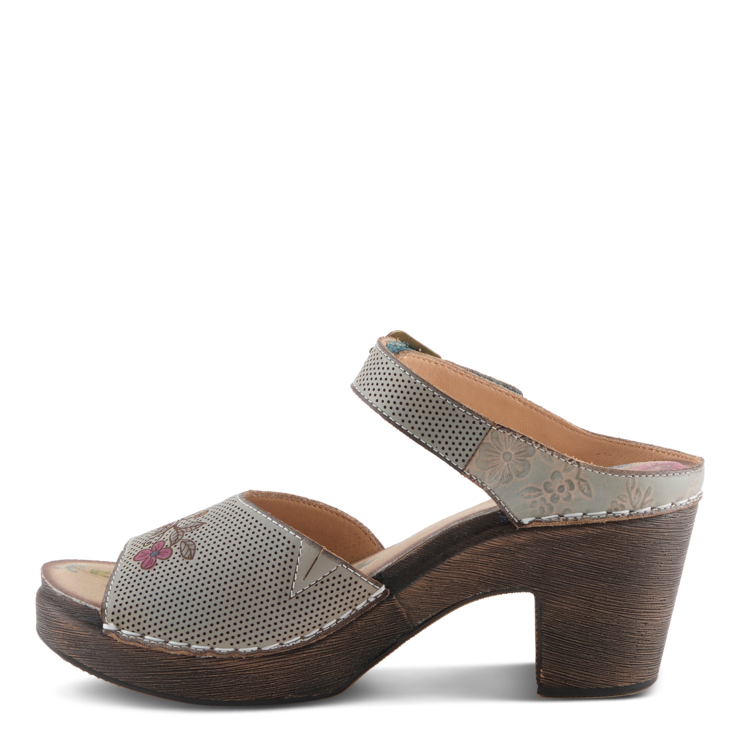 Elevate your everyday with this charming sandal, crafted in hand-painted perforated and embossed leather that showcases vibrant floral artistry. An easy hook-and-loop closure with an antique-inspired buckle provides a secure fit, while the sculpted block heel features delicate floral etching for timeless appeal. Inside, a printed floral microsuede insole with extra padding ensures all-day comfort. This sandal blends artisanal beauty with dependable wearability.
