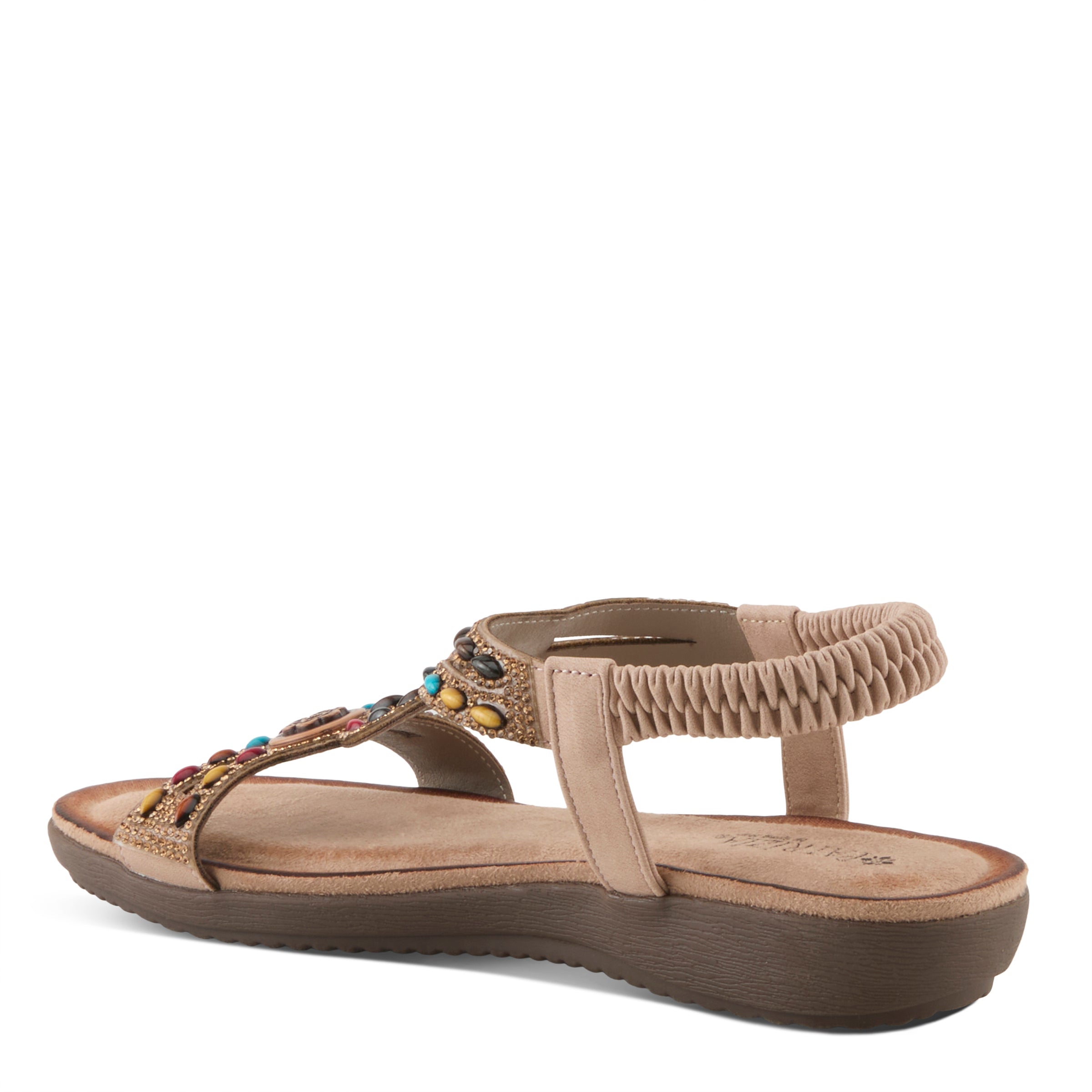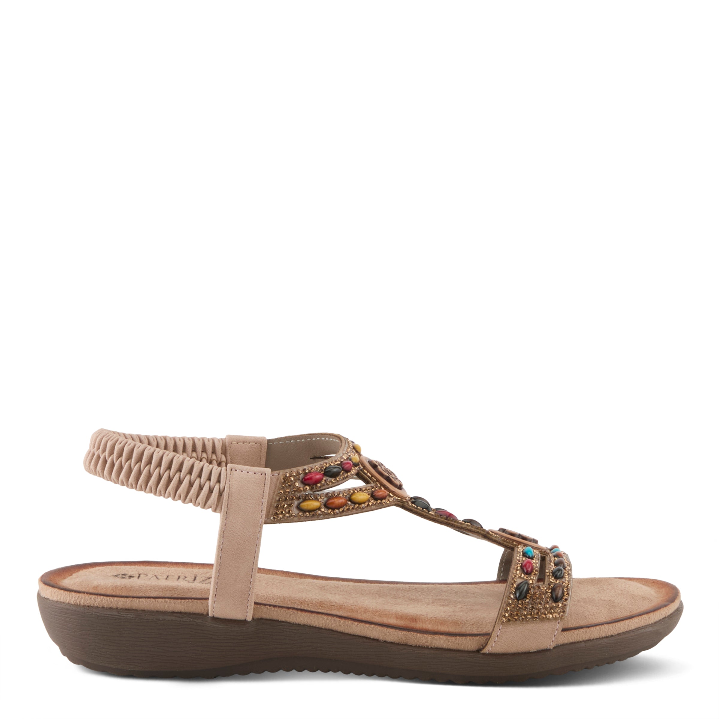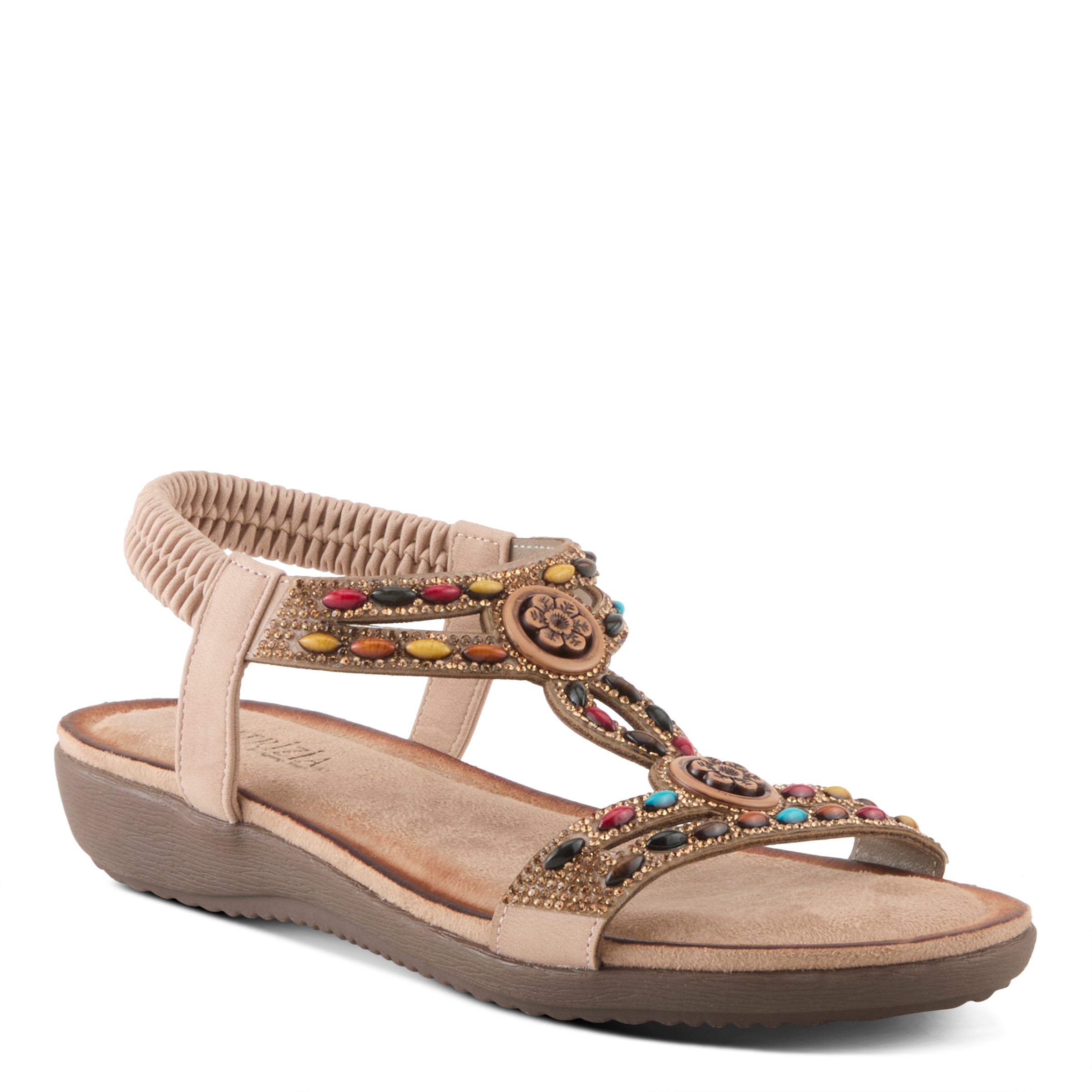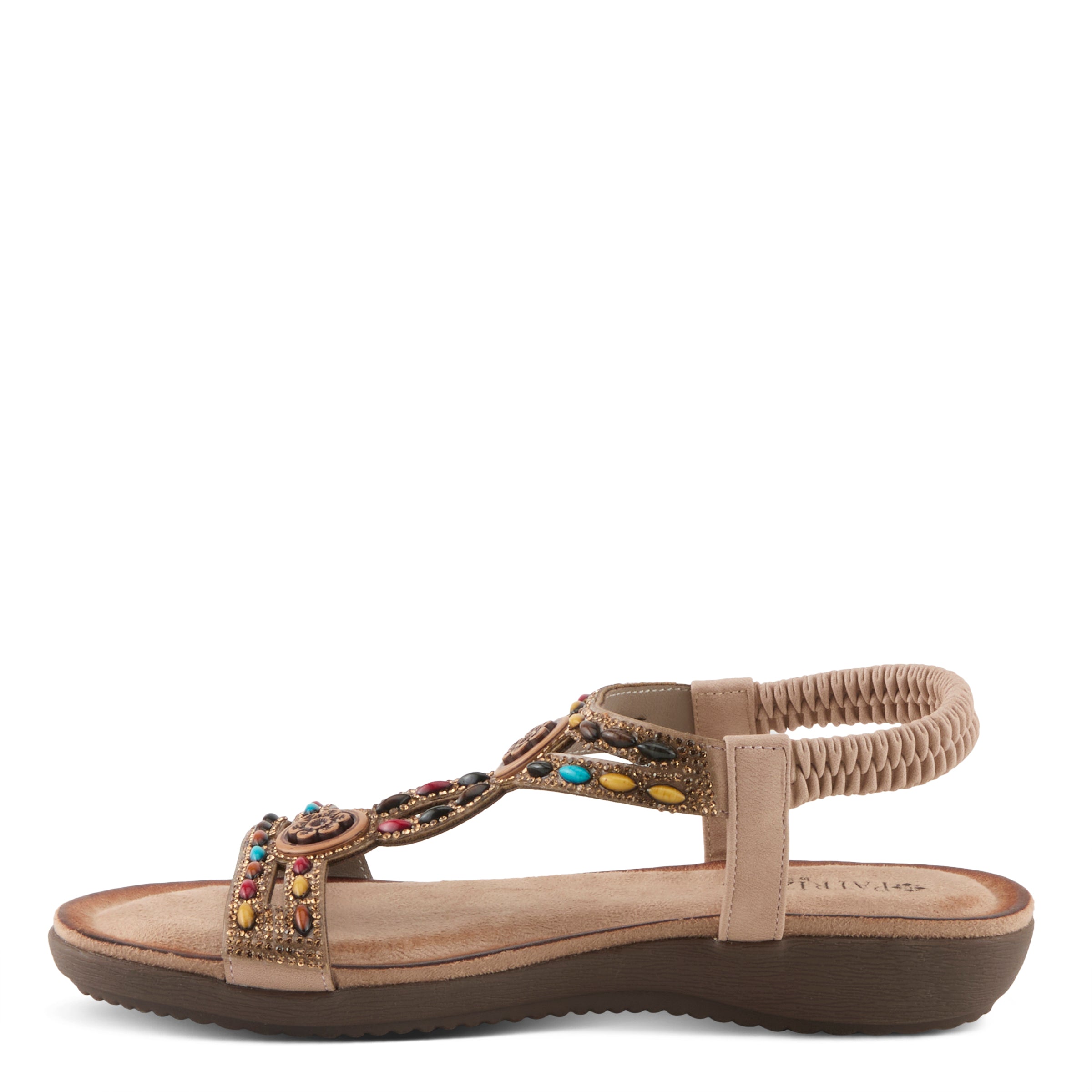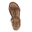 Perfect summer addition with this multicolored yet subtle sandal, Ponyo style features a beautifully crafted upper and burnished look insole.