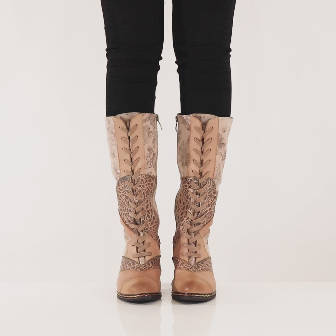 Bota con cordones de piel pintada a mano bellamente estampada con tejido floral metalizado estampado.