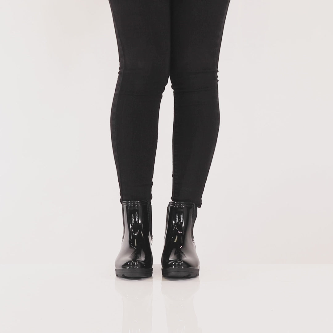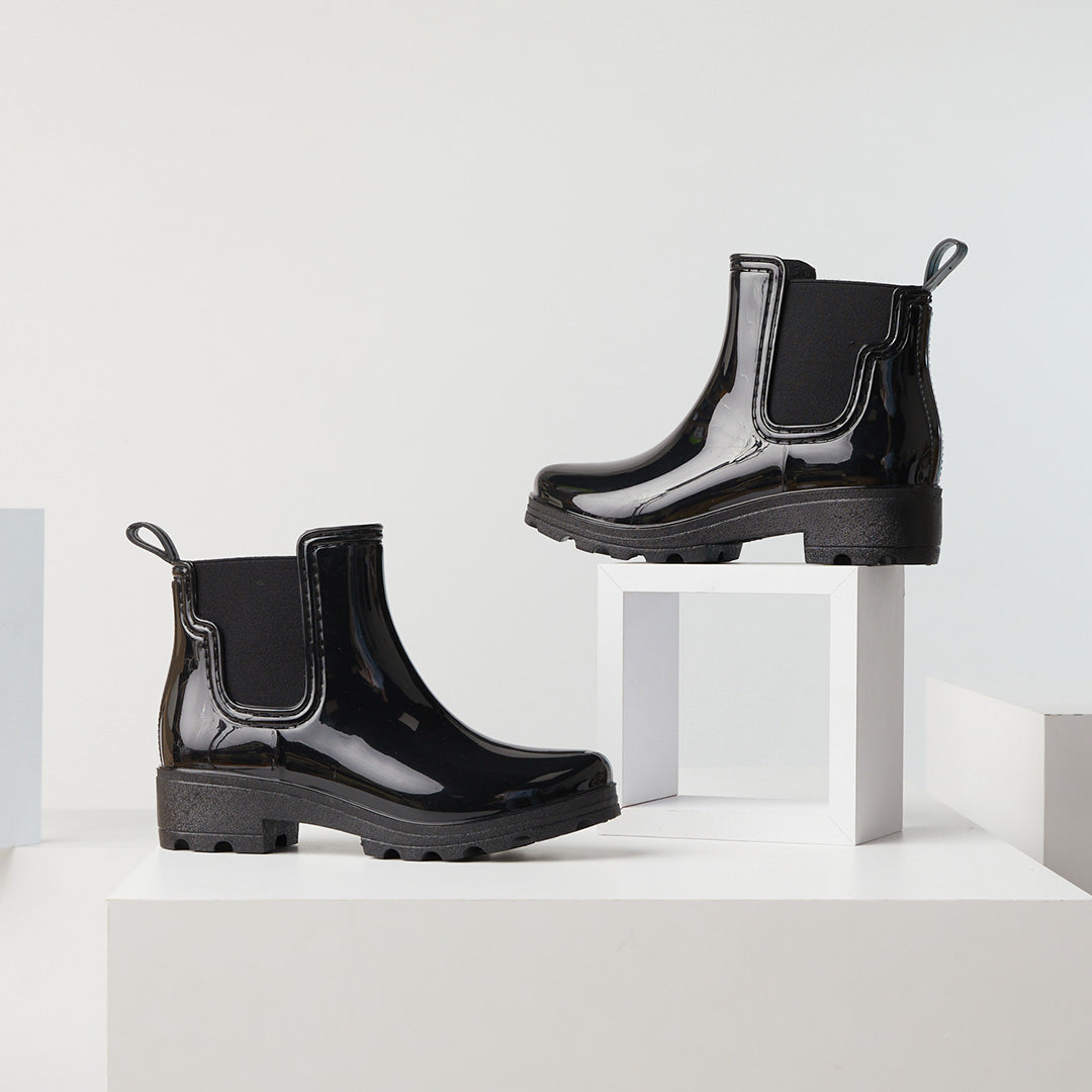 Bota de lluvia impermeable inspirada en Chelsie con lados elásticos en una SUELA EXTERIOR cómoda con tacos.