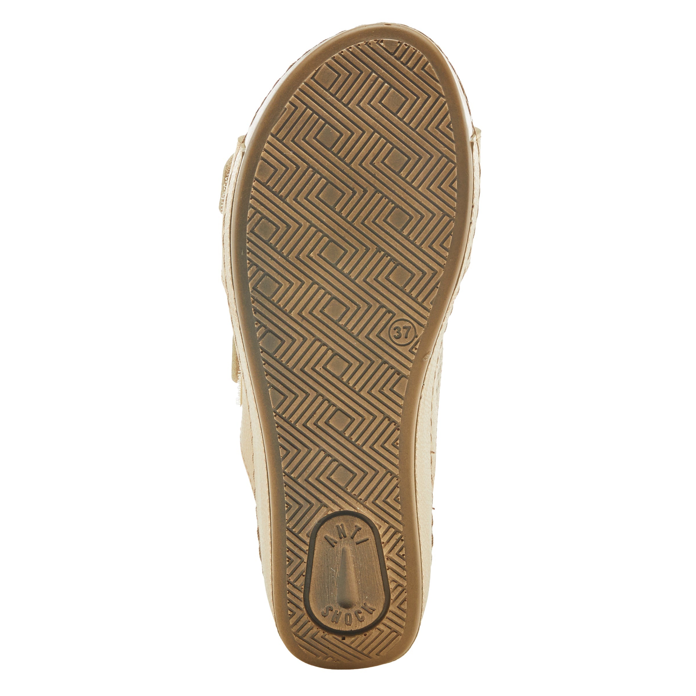 Una clásica sandalia tipo chancla con plataforma de dos tiras que presenta cierres dobles de velcro adornados con modernas hebillas de metal plateado. La plantilla de cuero y la construcción resistente con costuras laterales brindan una comodidad inigualable, todo sobre una suela de cuña antideslizante y antigolpes.