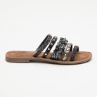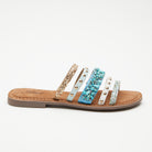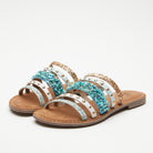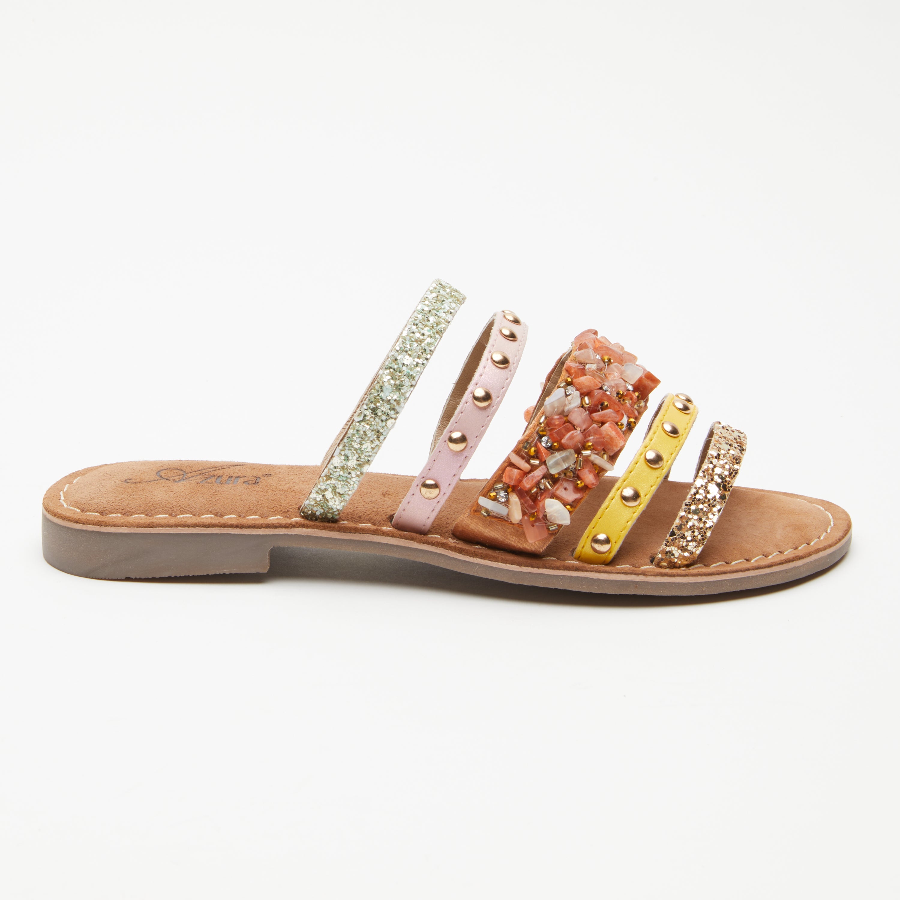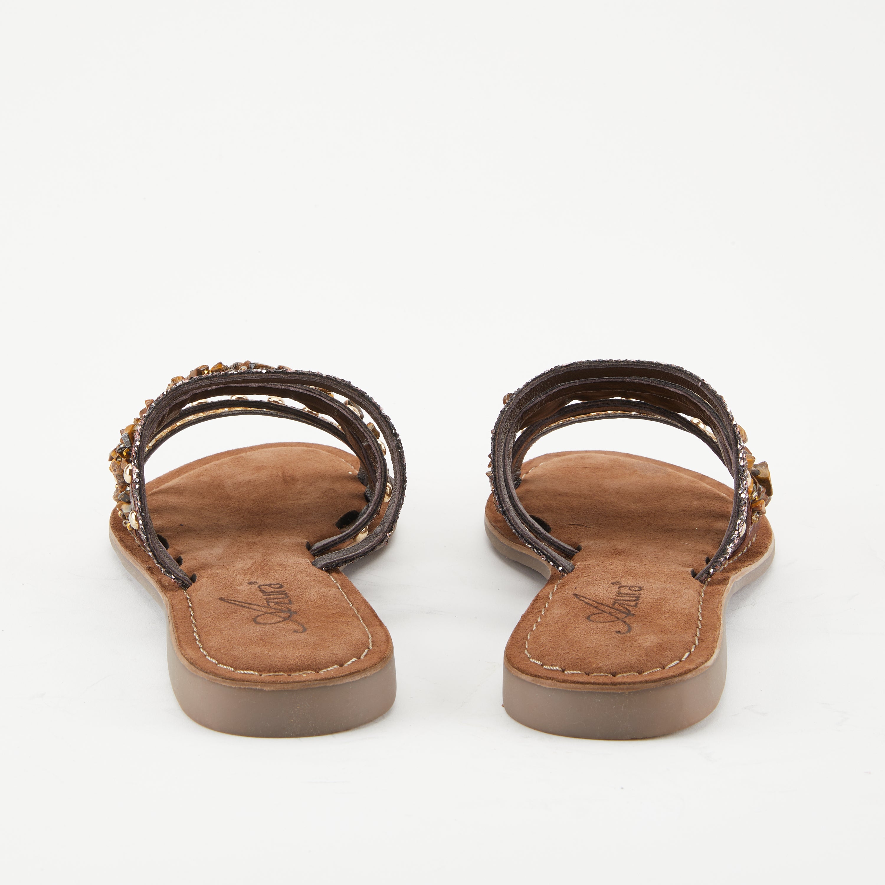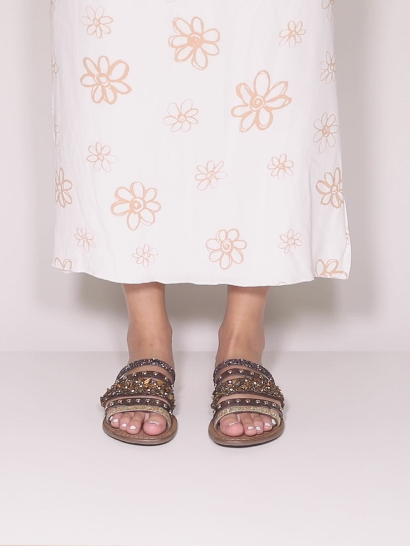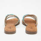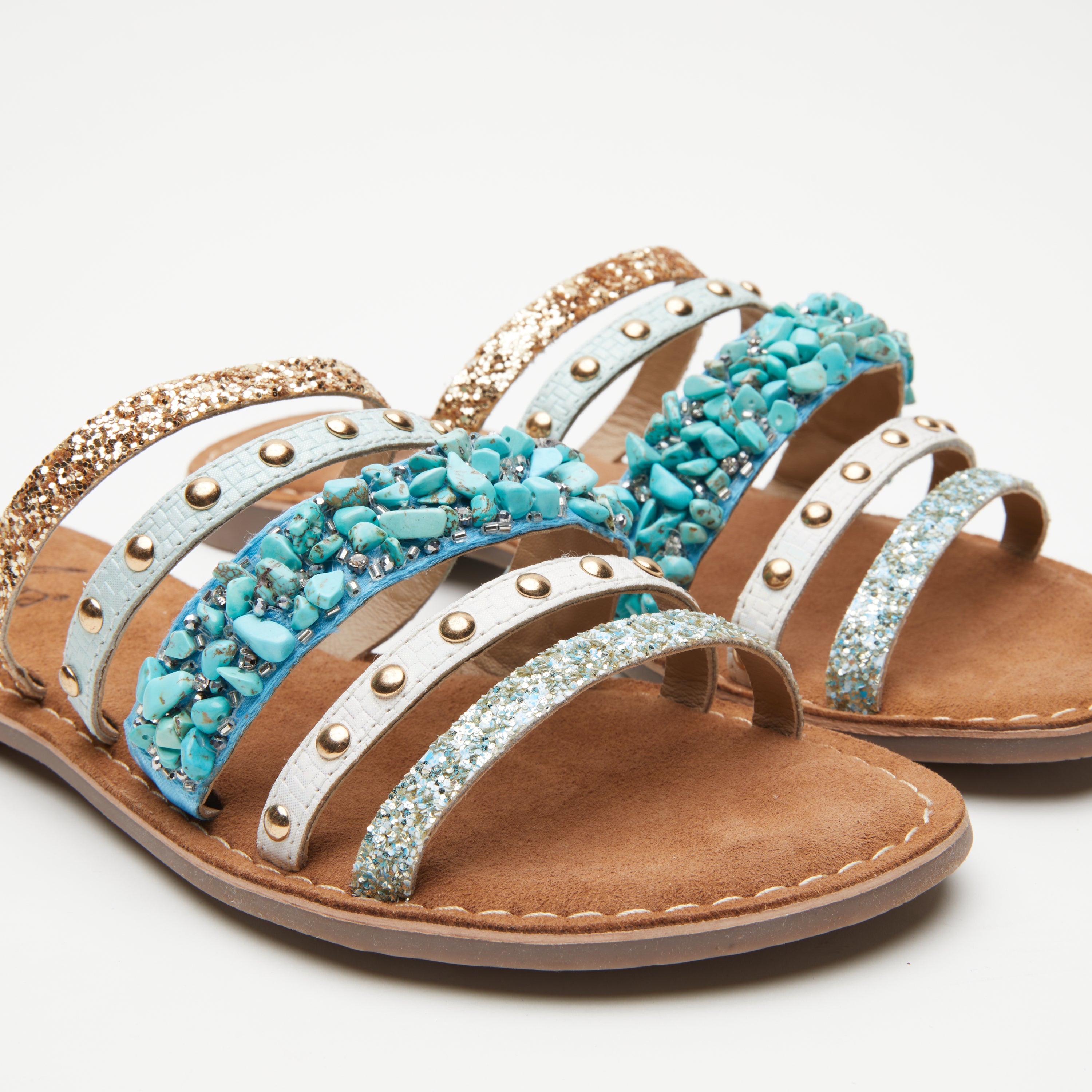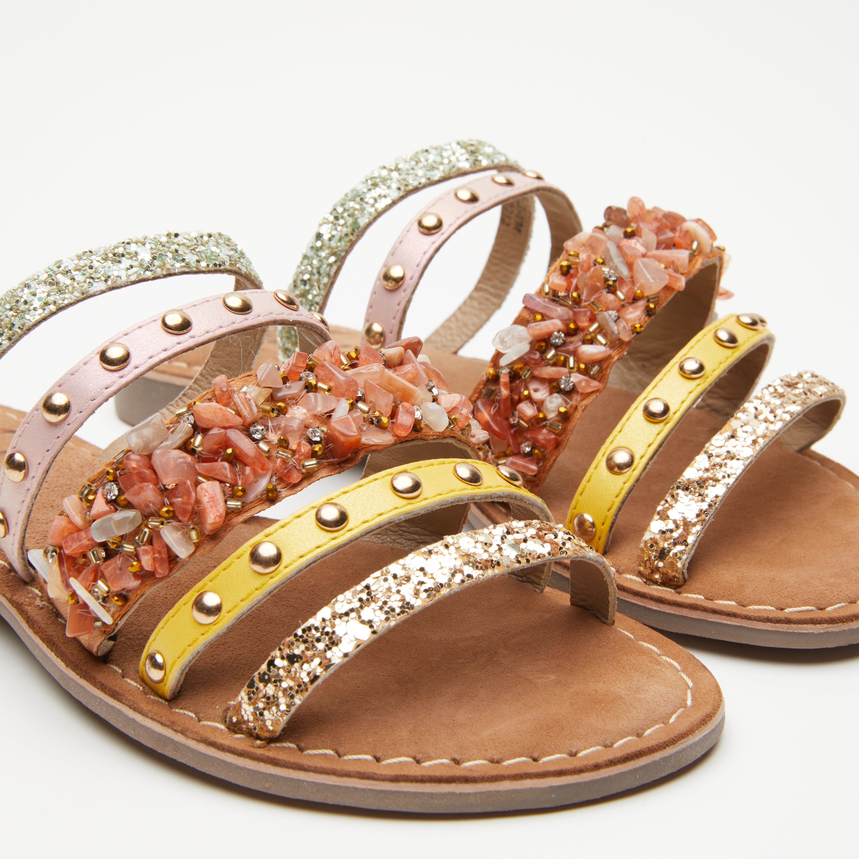 Lujosa y lujosa sandalia de cuero de primera calidad con influencia geocéntrica que presenta un hermoso aplique artesanal de lentejuelas, diamantes de imitación y piedras preciosas con un trabajo de puntadas tonales, todo en una suela exterior plana inspirada en la comodidad con una plantilla flexible.