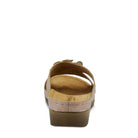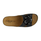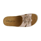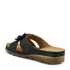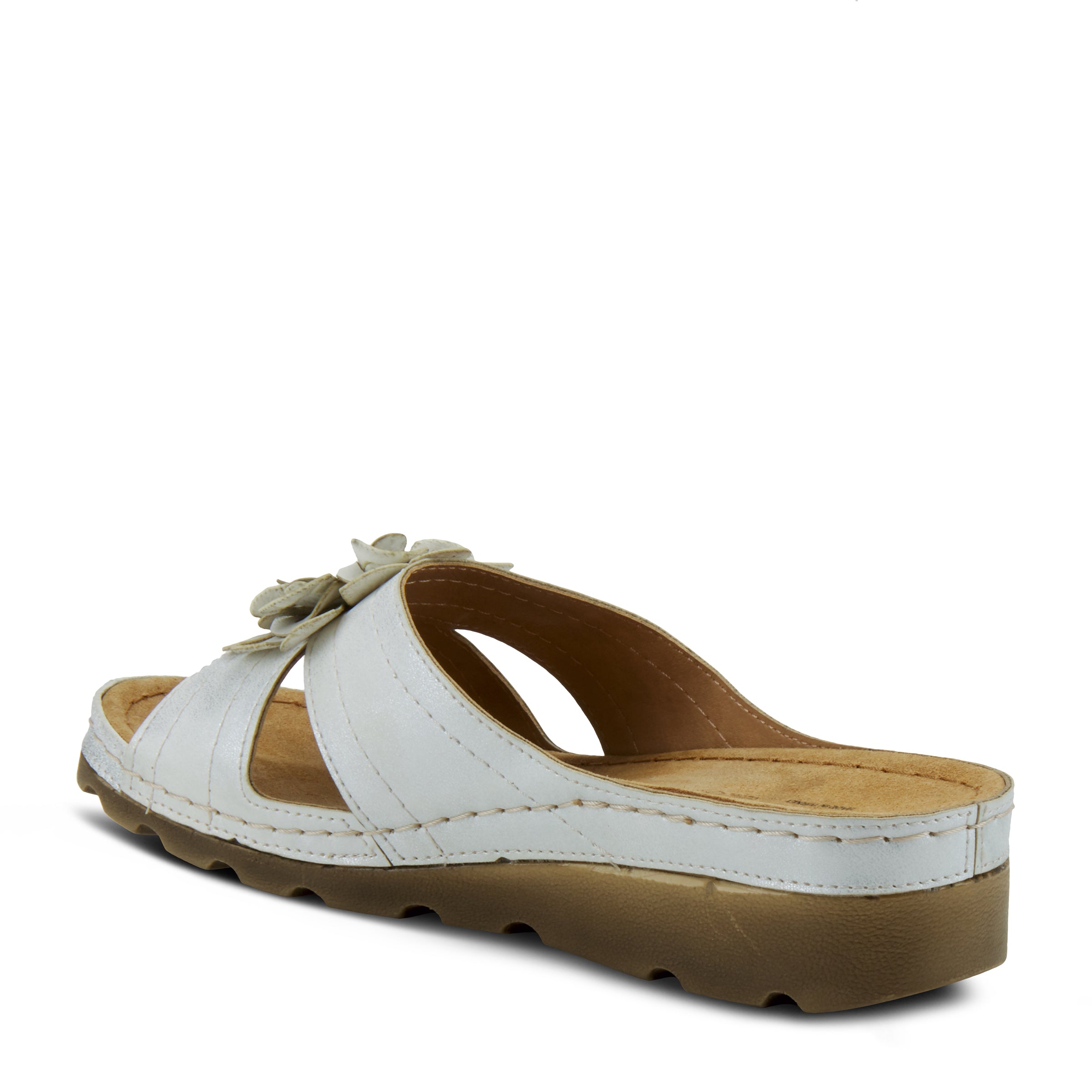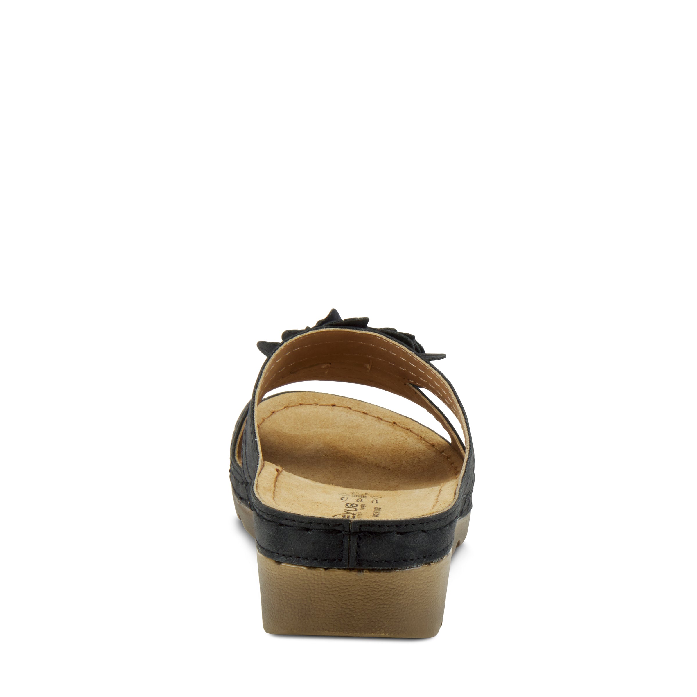 Sandalia tipo diapositiva liviana de doble tira que presenta un hermoso detalle floral dimensional central, todo sobre una plantilla acolchada contorneada de largo completo y una suela de cuña cosida en la pared lateral.