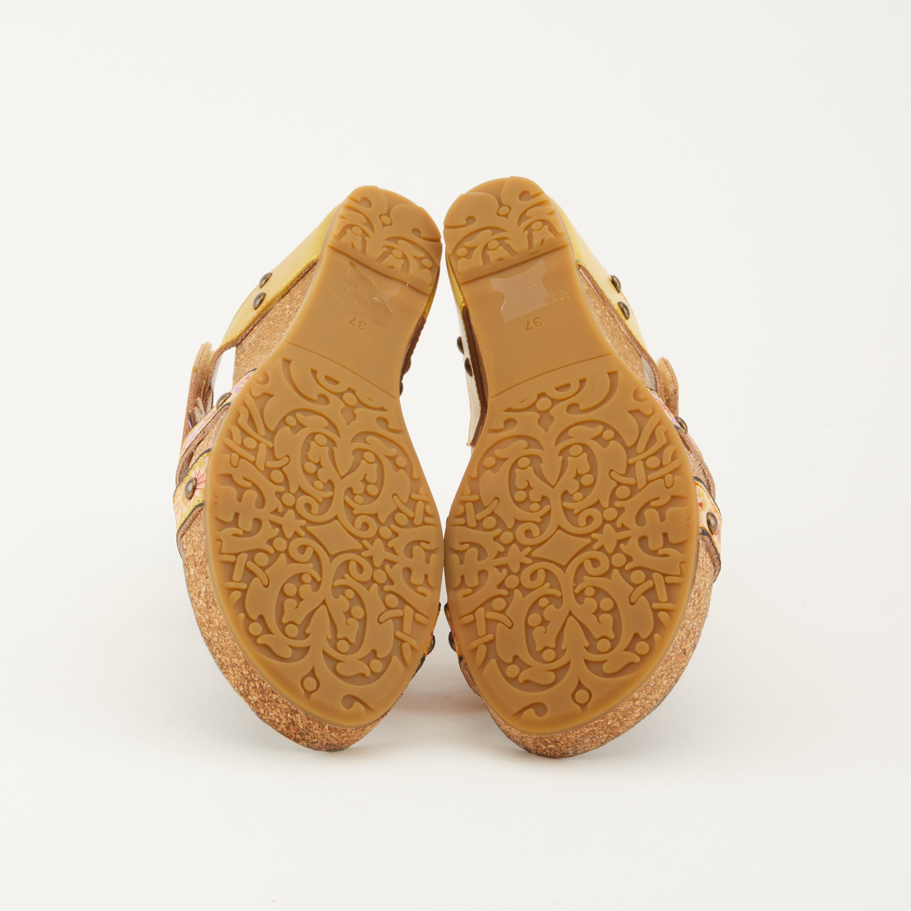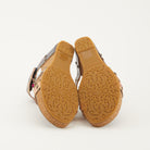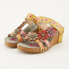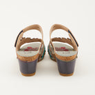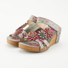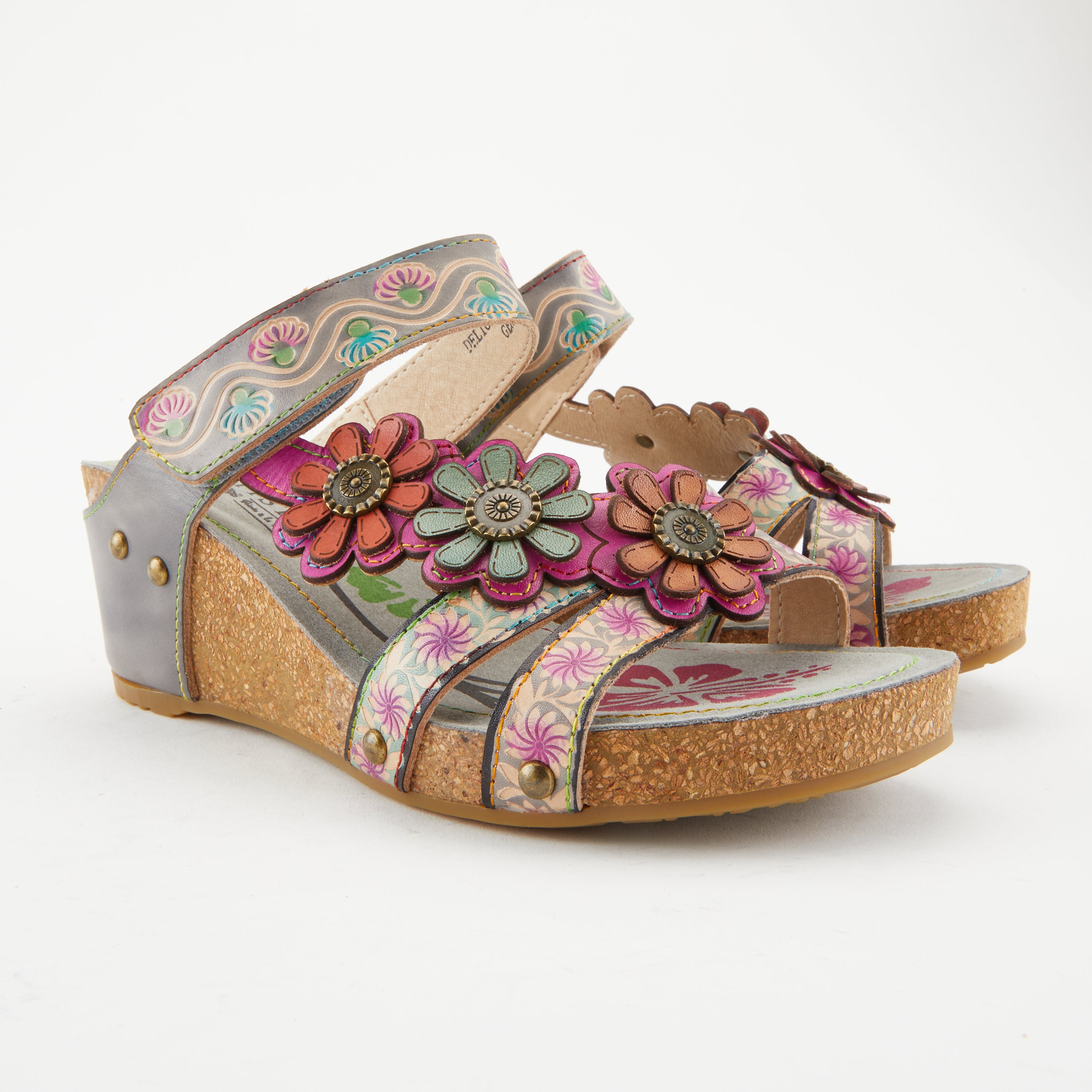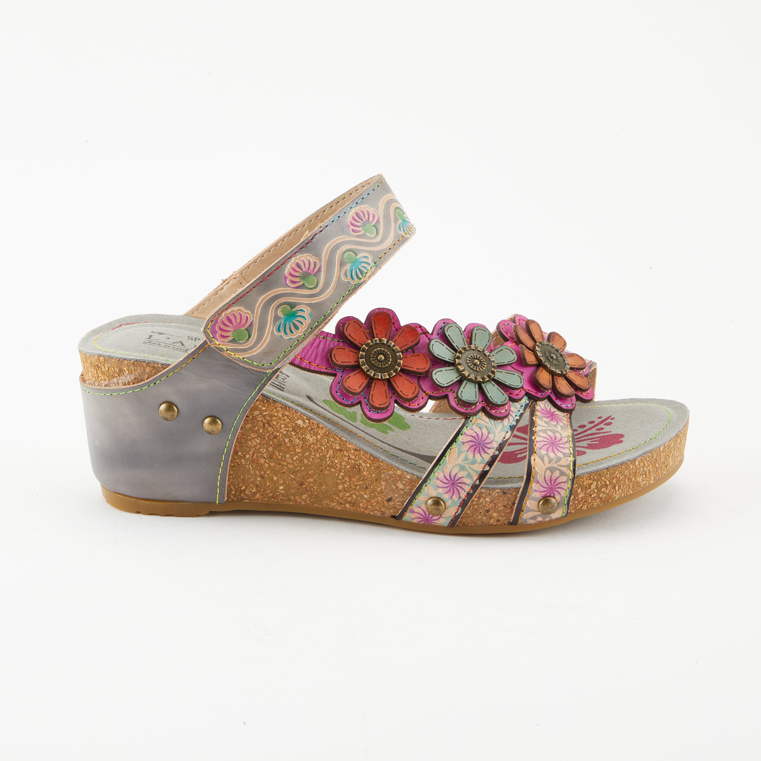 Sea chic sin esfuerzo con esta sandalia de cuero pintada a mano de inspiración francesa con flores en 3D en un diseño asimétrico y cierre de velcro ajustable Hook and Loop en la correa superior. Los ojales de latón en la parte inferior agregan un elemento resistente pero elegante. La plantilla acolchada y la cuña de corcho es un amortiguador para proteger tus pies asegurando el máximo confort.