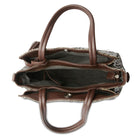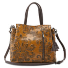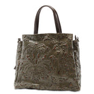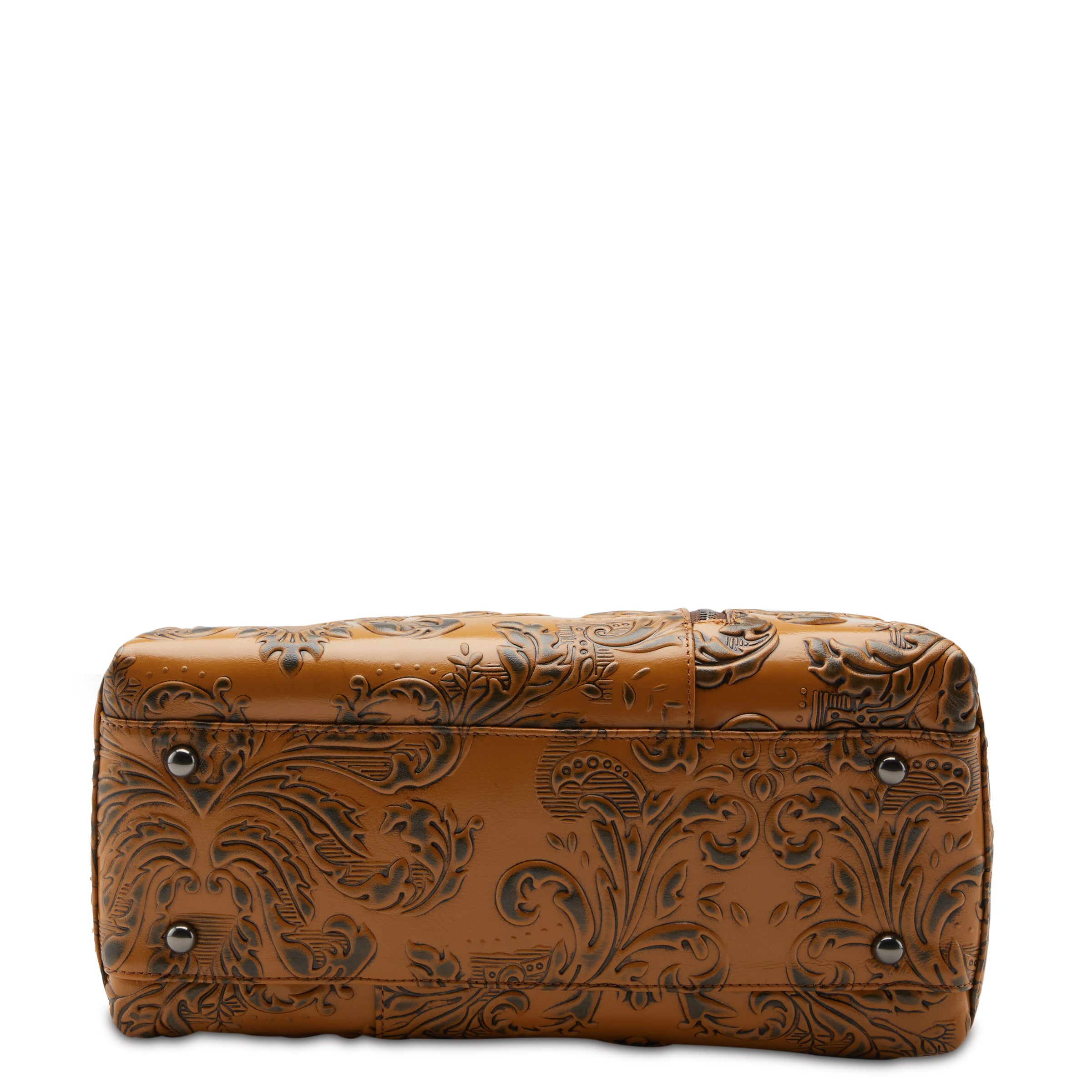 Un súper poder de bolsos con interiores discretos que satisfacen todas sus necesidades prácticas y un exterior de cuero tallado no tan humilde que seguramente ¡GUAU! Compartimento central con cremallera de cuerpo entero con 2 bolsillos abiertos en la pared, bolsillo opuesto con cremallera y asas de cuero enrolladas adjuntas con un lazo extraíble de cascabeles de cuero plisado que se puede mover de lado a lado o usar como collar. Dos grandes compartimentos abiertos a presión para un acceso fácil y seguro, bolsillo exterior horizontal con cremallera lo suficientemente grande como para un pequeño 'protectro' oculto y magníficos remolinos y rizos de cuero dimensional con acentos bruñidos en tonos tierra fleur-d-lei. Correa para el hombro extraíble y ajustable y bolsa para el polvo de algodón. Importado.