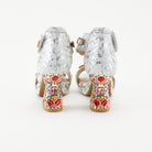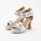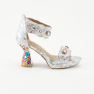 Deslumbrante sandalia con correa en el tobillo que presenta correas adornadas con cristales y un tacón arquitectónico único con joyas multicolores incorporadas.