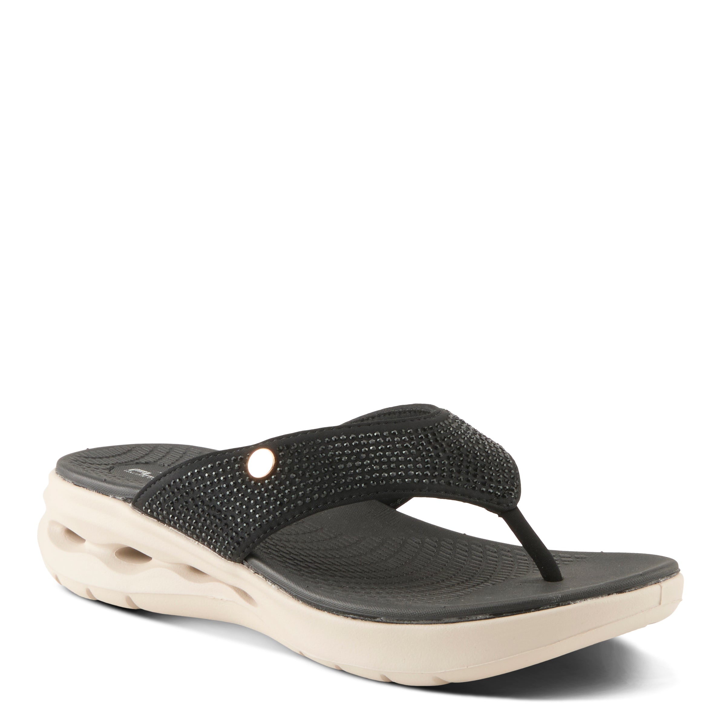 This thong sandal, bedazzled with shimmering rhinestones, effortlessly blends sporty style with luxurious comfort. The trendy active outsole adds a modern, dynamic touch, while the cushioned footbed provides all-day support, ensuring your feet feel secure and relaxed with every step. Perfect for those who crave both sparkle and stability, this sandal is a dazzling choice for active days and laid-back moments alike.