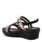 - Jute braiding intertwined with metallic accents, multicolored studs, and sparkling crystals make up the straps on the upper