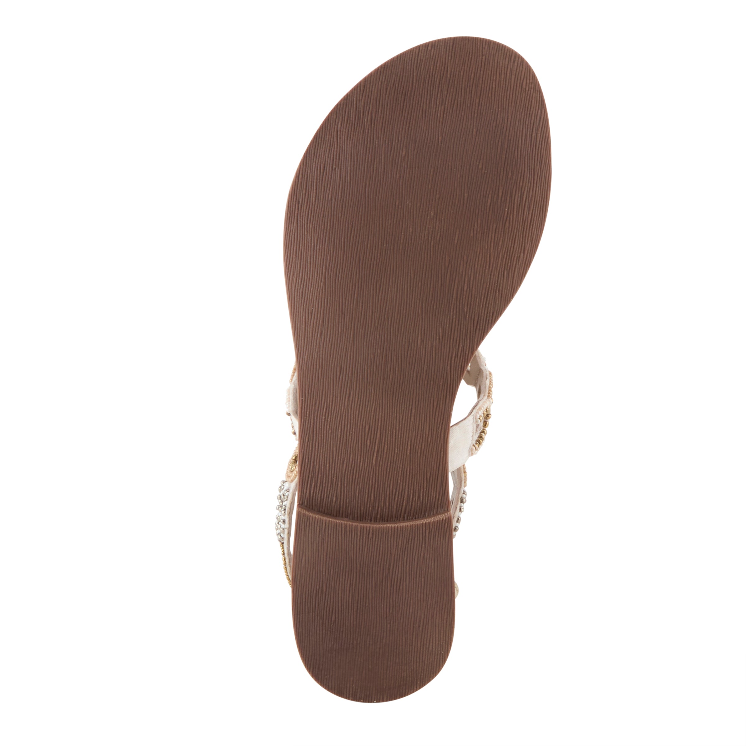 - Tonal beads and open cutouts on upper and ankle strap