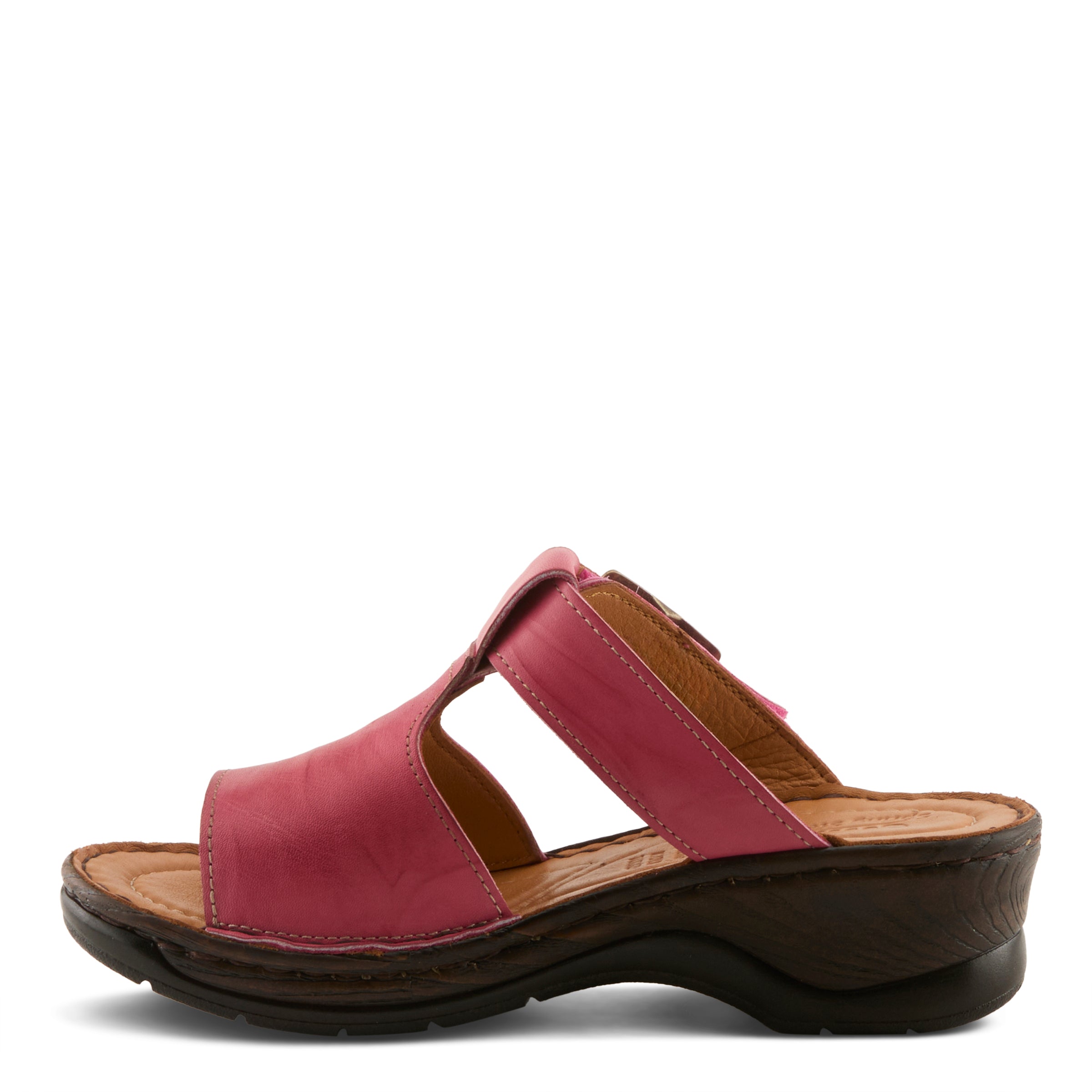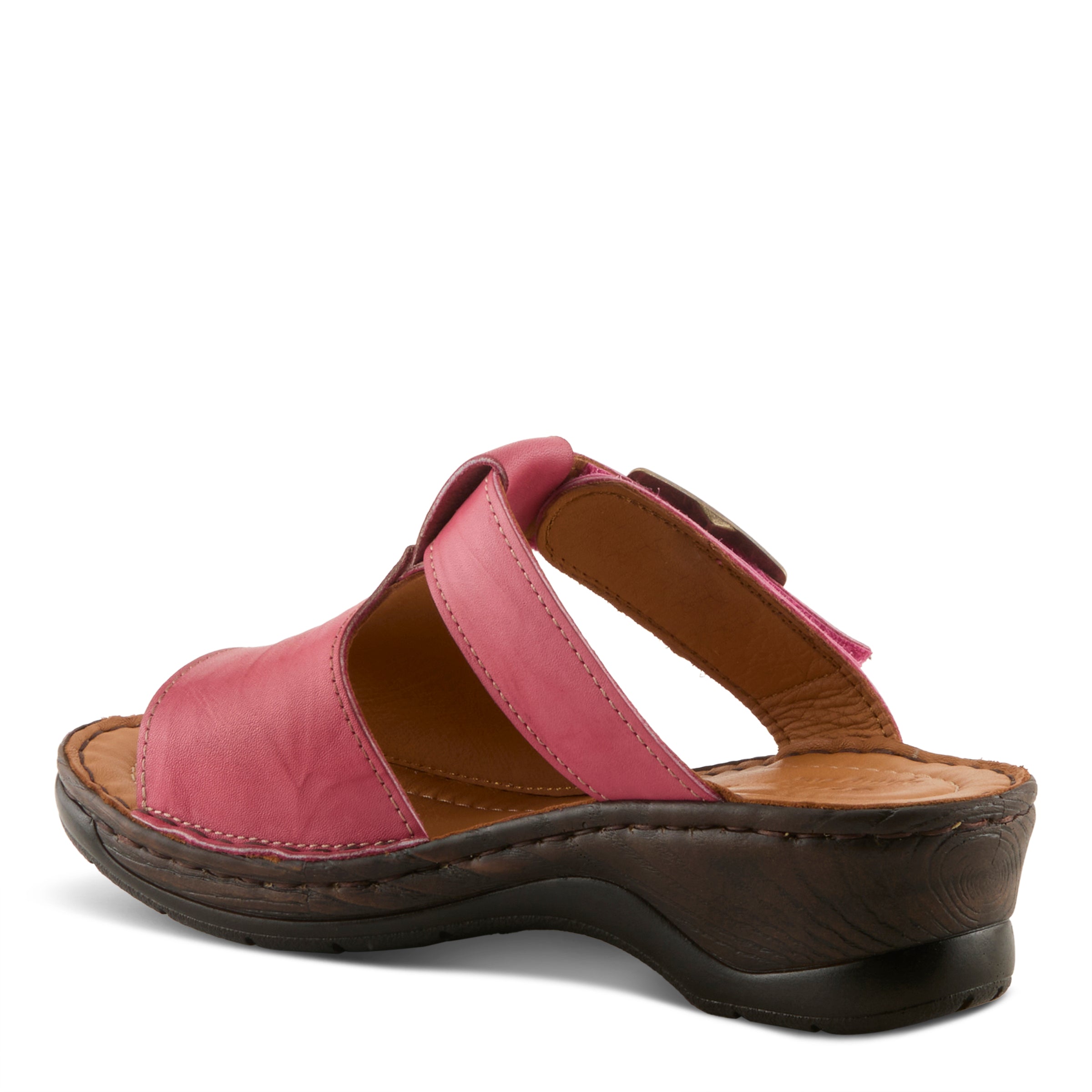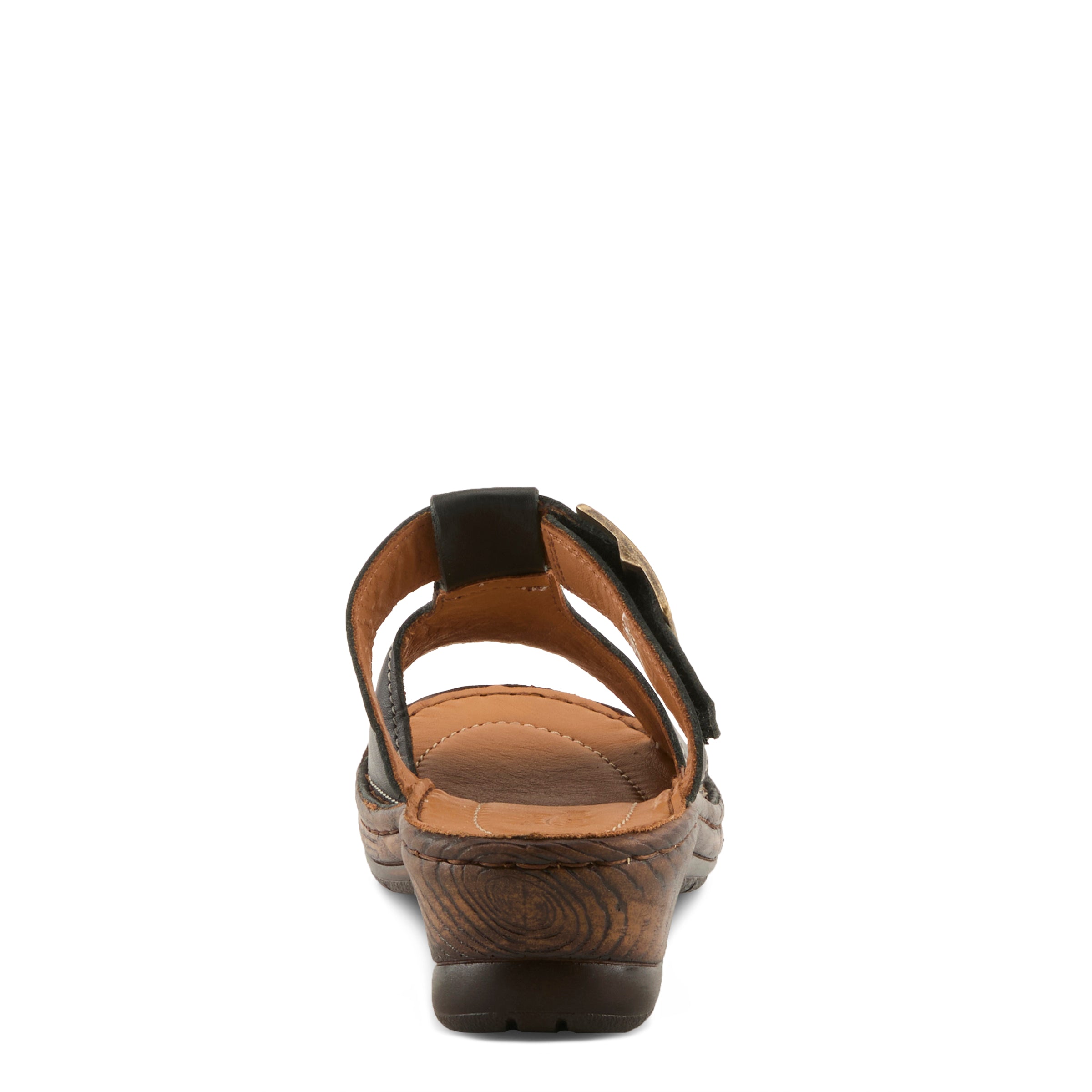This updated slide redefines casual sophistication with clean lines and a contemporary edge. The wide leather upper with cut-out accents creates a sleek silhouette, complemented by a bold oversized brass buckle that makes a statement while concealing a practical hook-and-loop closure. The dark faux-wood wedge, sculpted with subtle textural depth, adds both lift and modern flair. Designed with premium leathers inside and out plus extra insole padding, this sandal balances fashion and function perfectly. Ideal with cropped jumpsuits, straight-leg jeans, or minimalist day dresses, it adapts effortlessly from weekday chic to weekend casual.