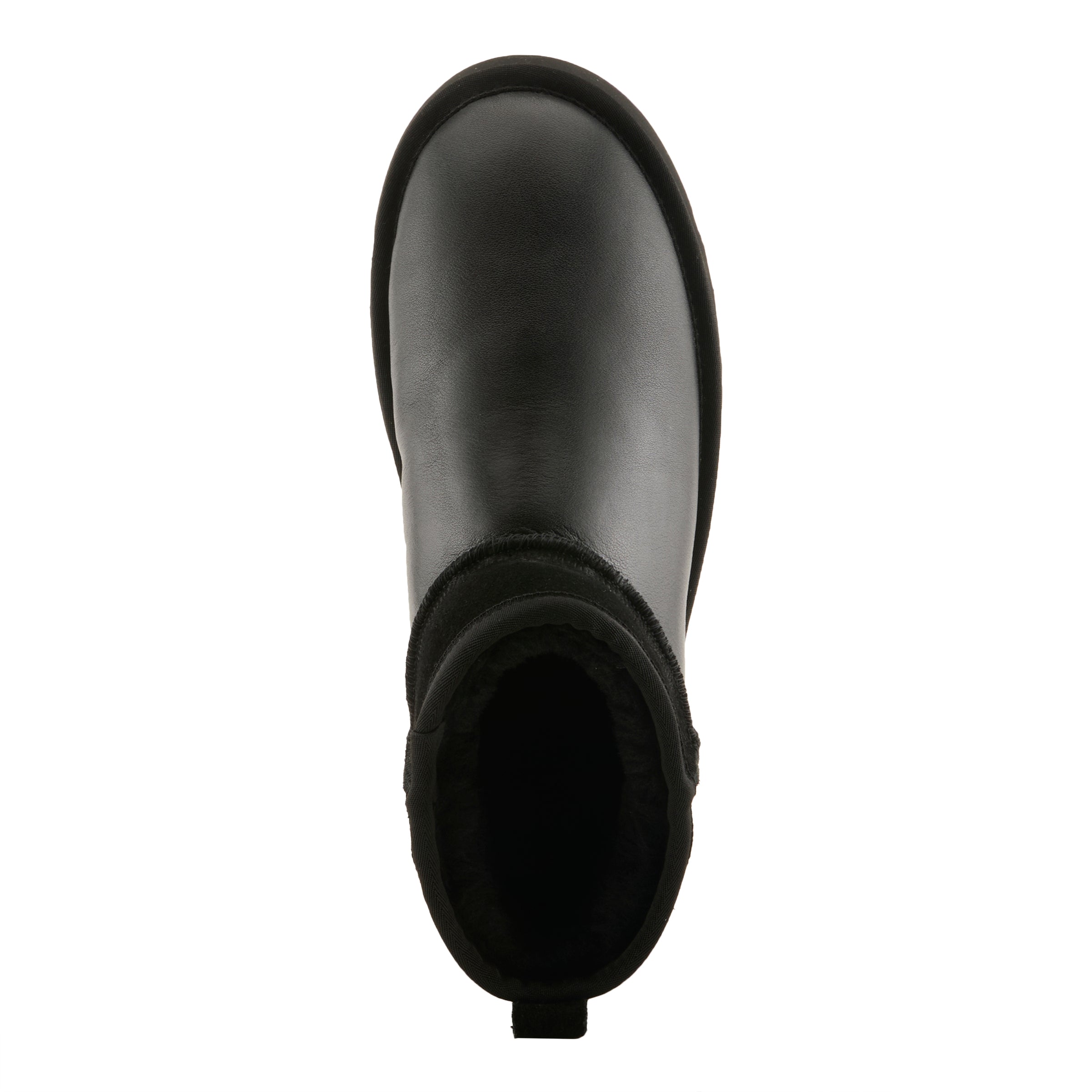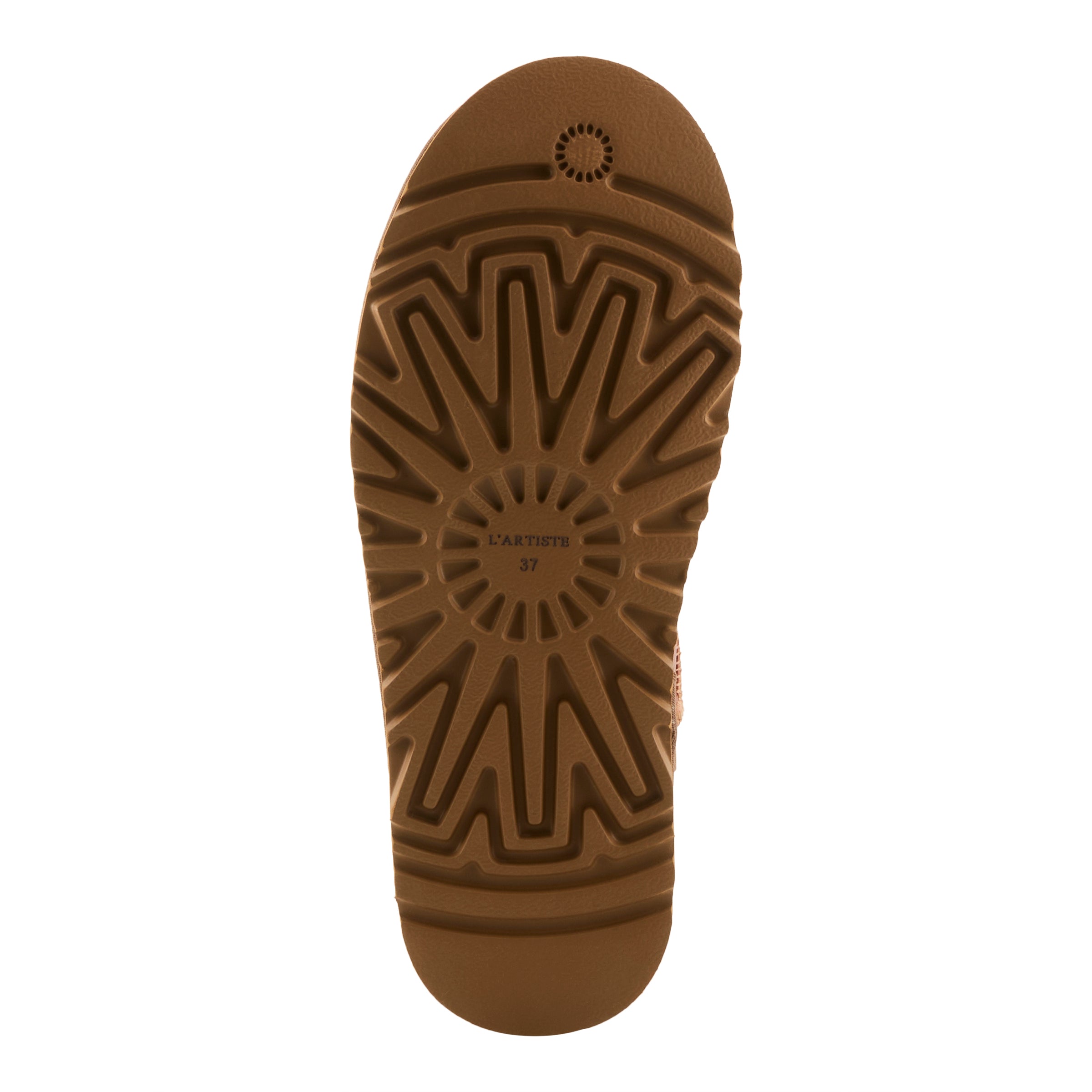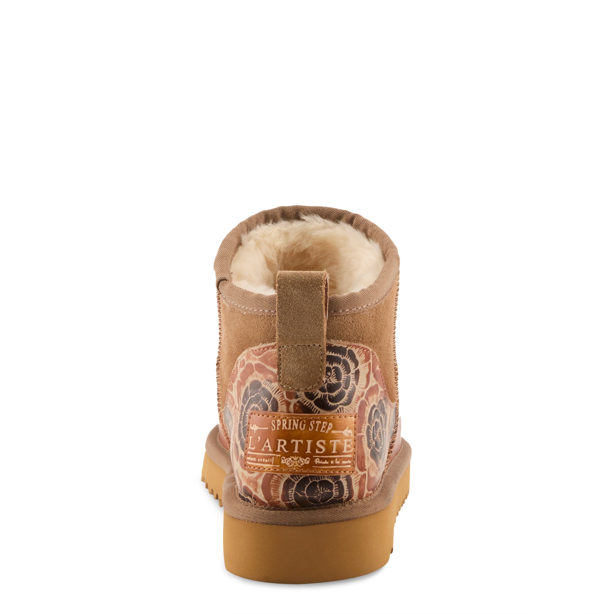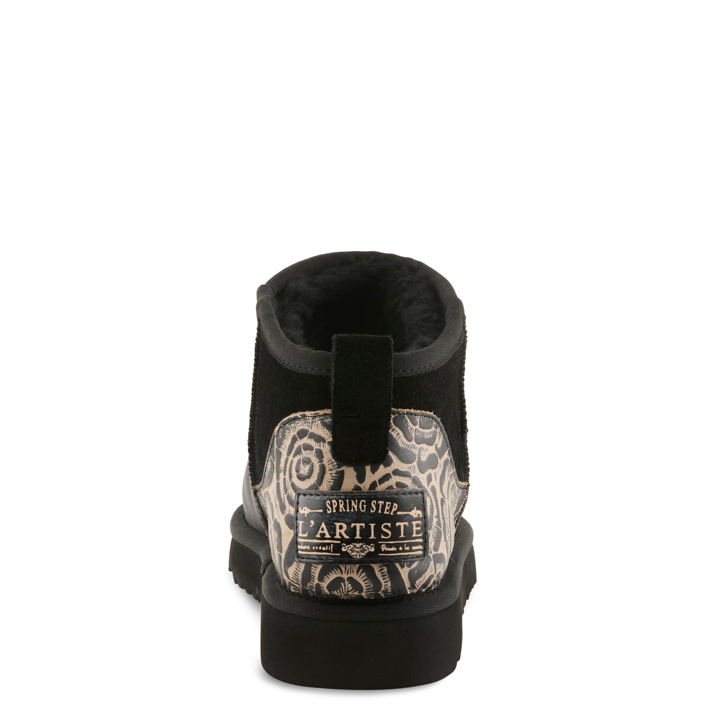 Embrace the perfect fusion of warmth and style with this cool and hip ankle boot. Featuring an embossed leather print and suede upper, this boot adds an artsy and trendy flair to your winter wardrobe. The sumptuously soft shearling lining and insole provide ultimate coziness, keeping your feet warm in any chilly setting. Designed for effortless wear, the back pull-tab allows easy on-and-off access, while the flatform outsole offers stability with a modern edge. Whether lounging at home or stepping out, this boot blends comfort and fashion effortlessly.