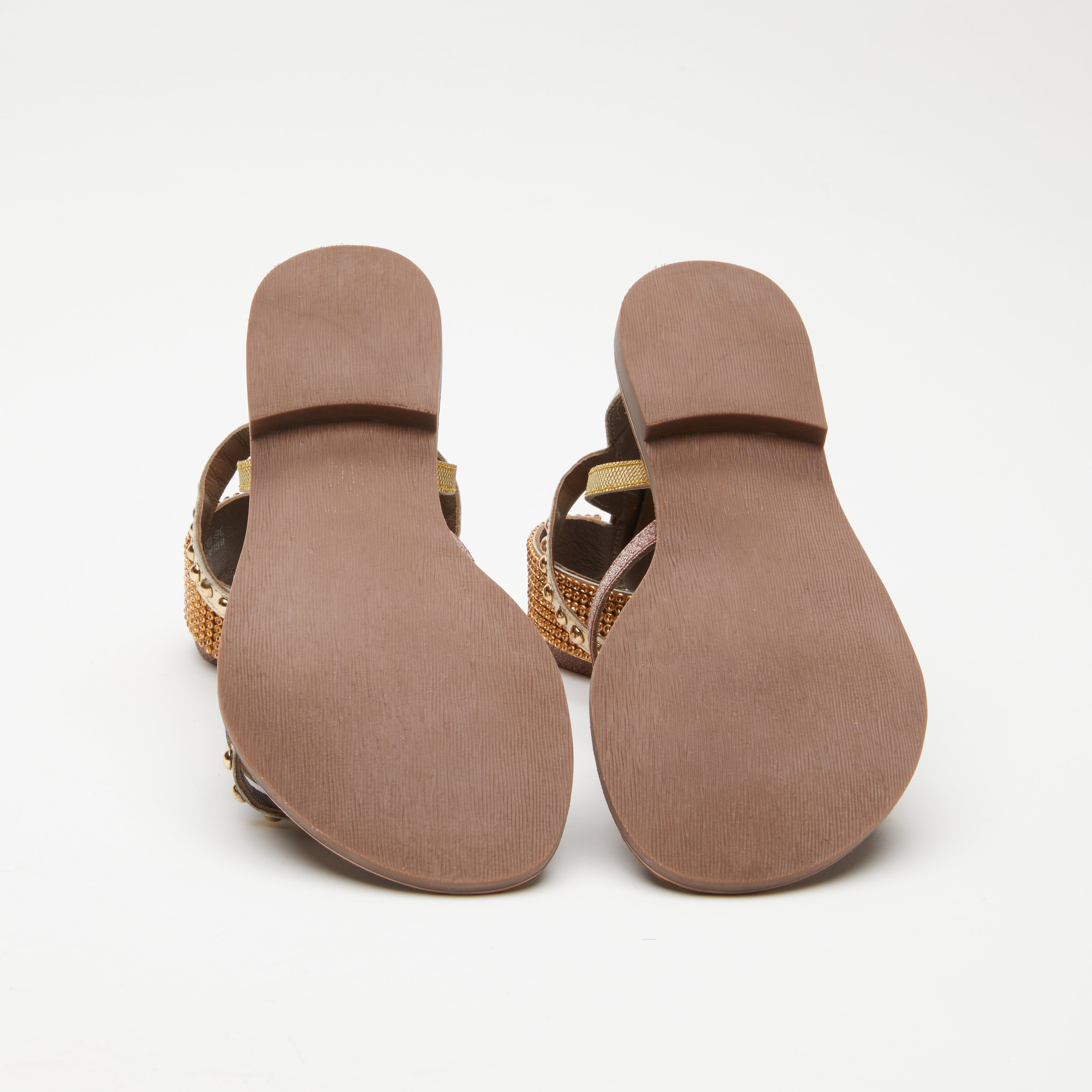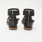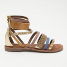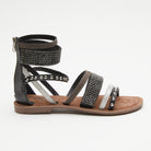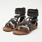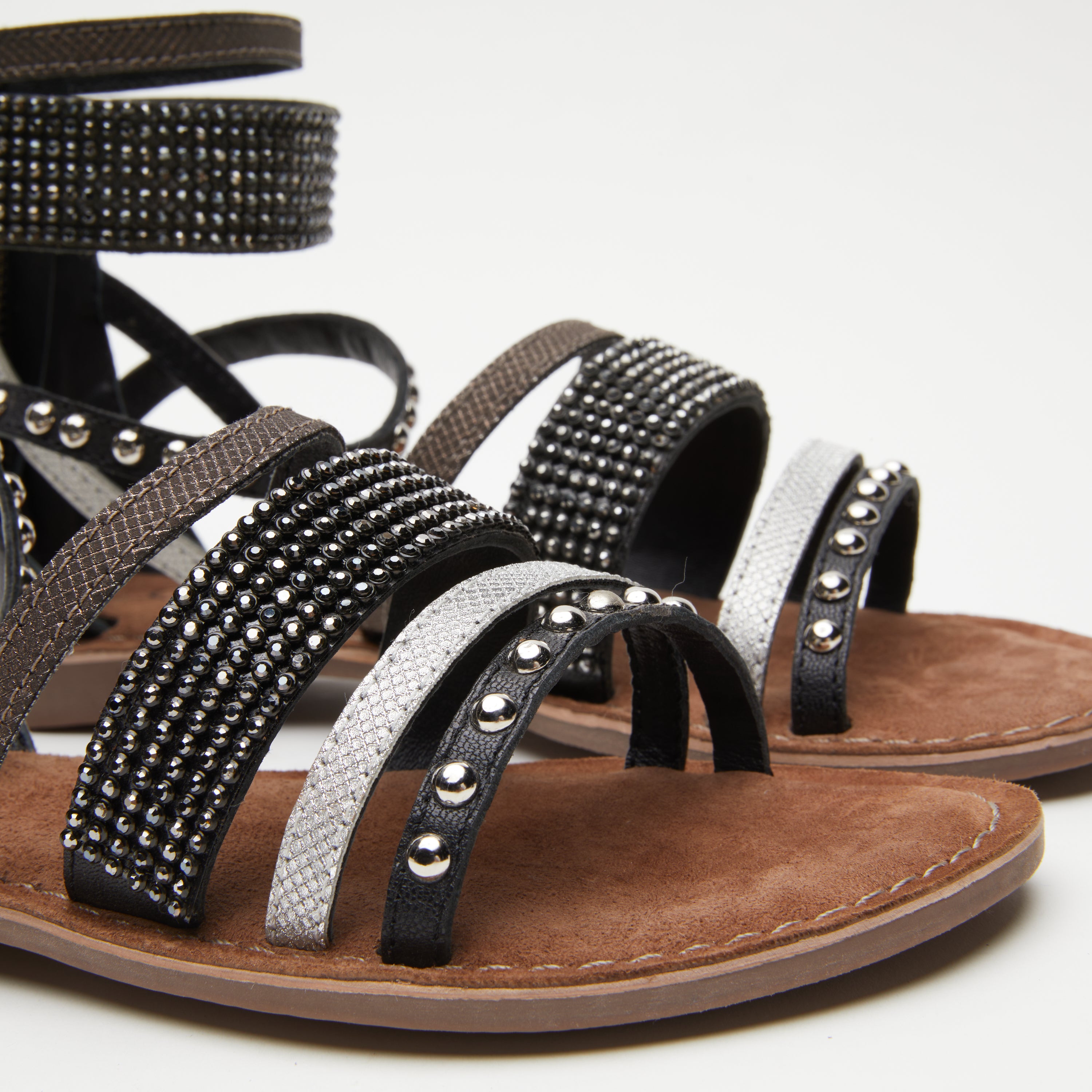 Sandalia estilo gladiador con múltiples tiras de influencia europea en piel de primera calidad. Es una combinación fabulosa de tachuelas de metal pulido, pedrería y diseños de correa con textura metálica. Este zapato lo tiene todo.