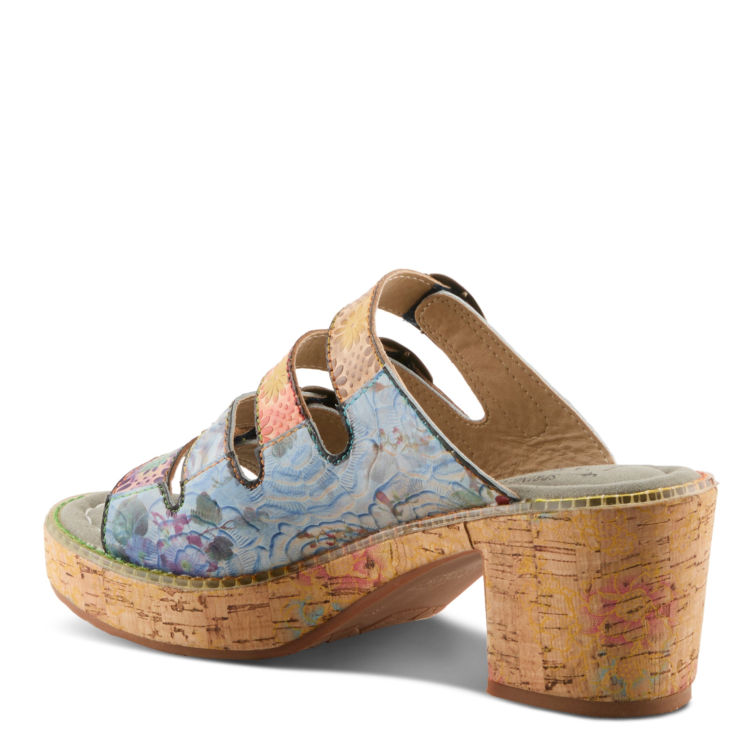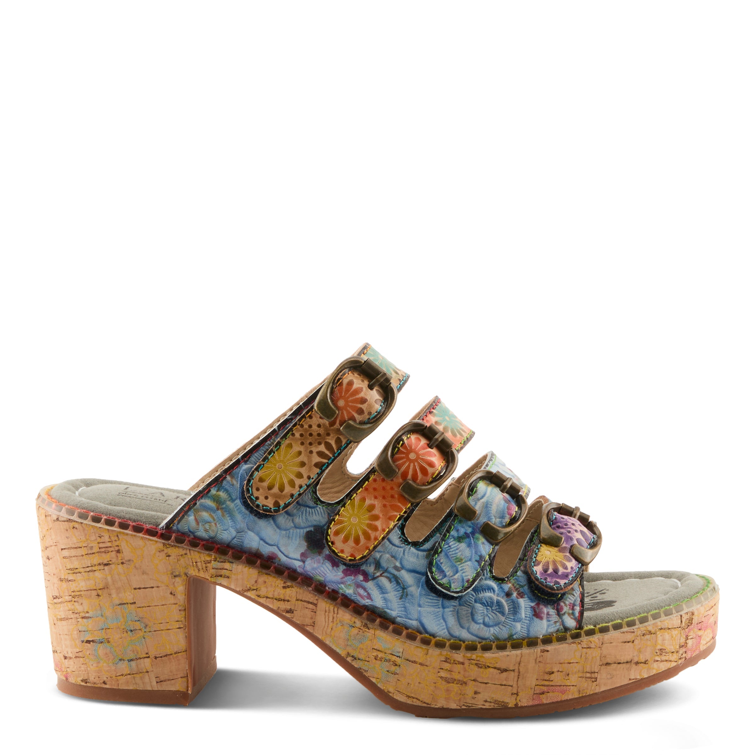 - Lightweight cork heel + midsole with printed florals & metallic highlights