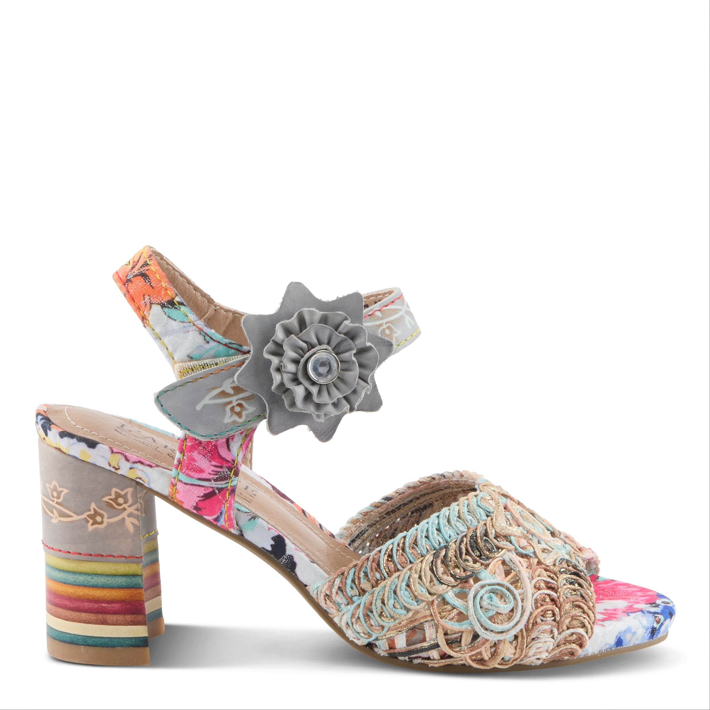 The back strap is embossed with delicate floral detailing and secures with a hook-and-loop closure for both style and ease of wear. Inside, a combination floral-printed lining and smooth faux-leather insole provide comfort and balance the richly artistic design.