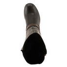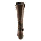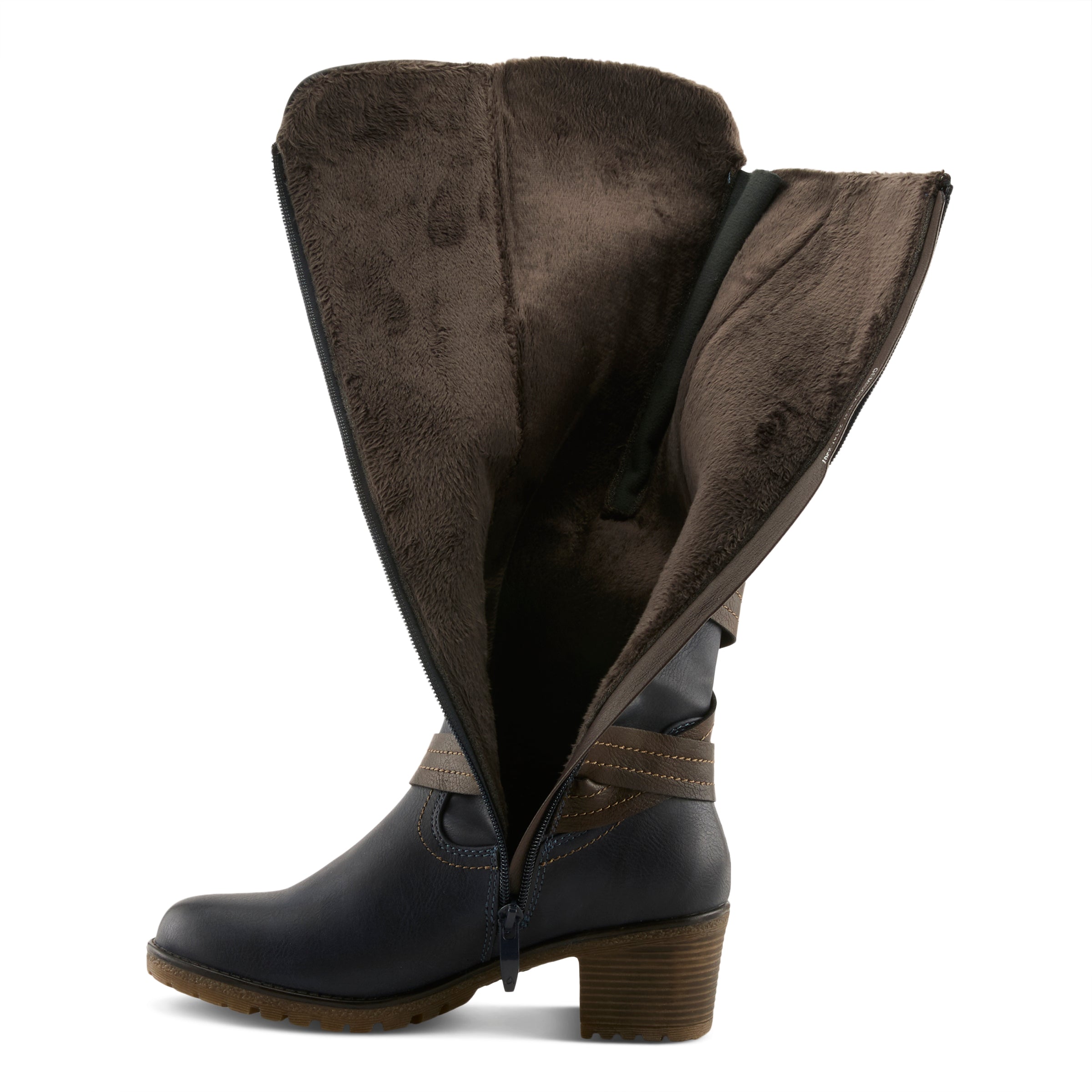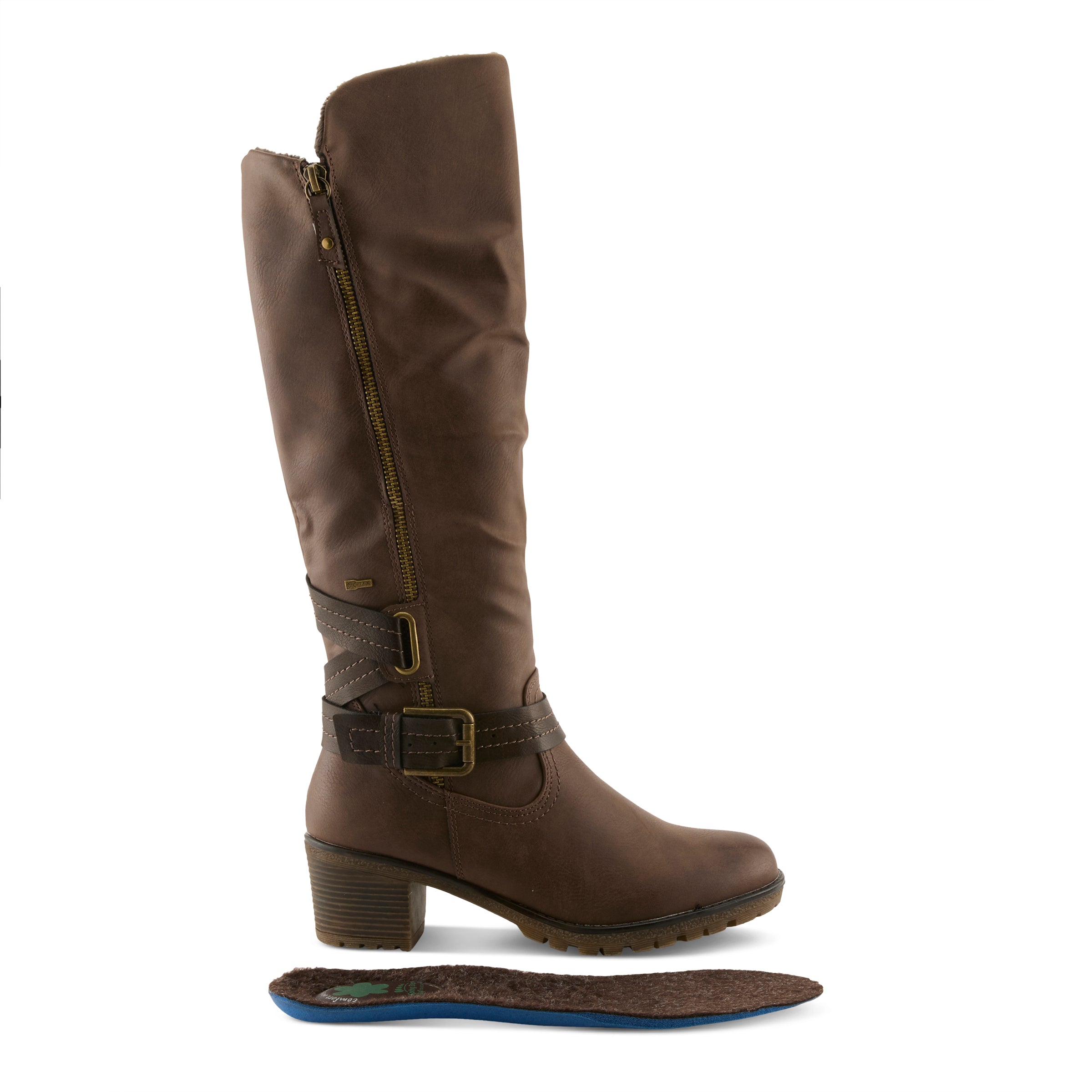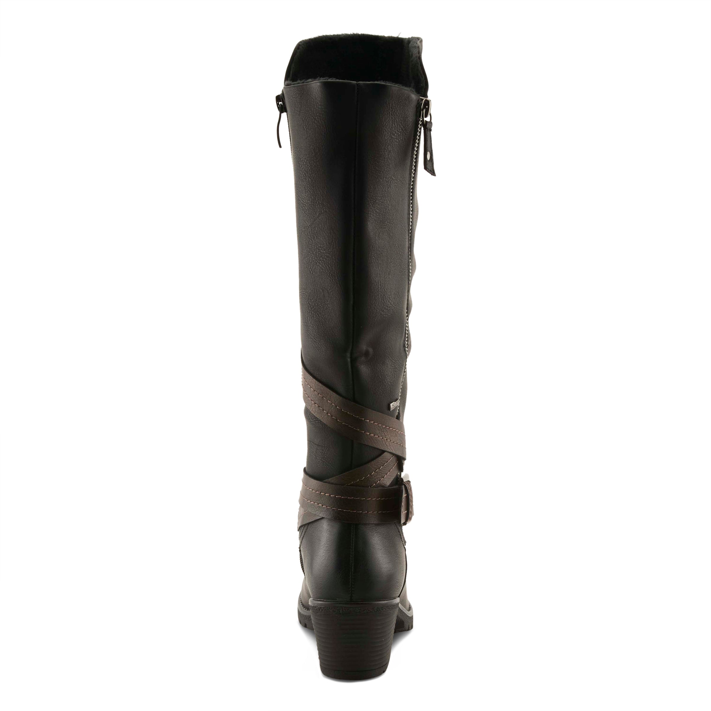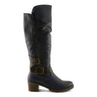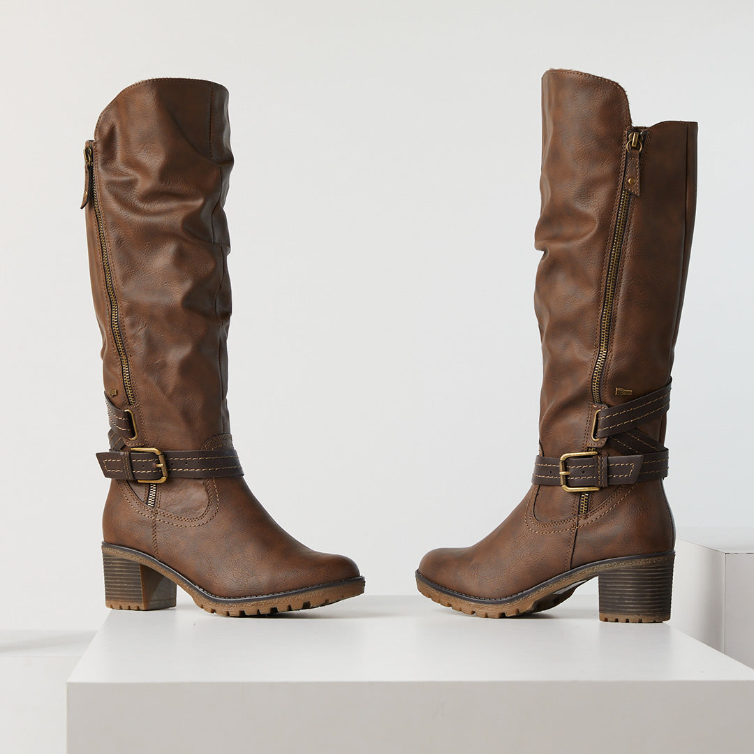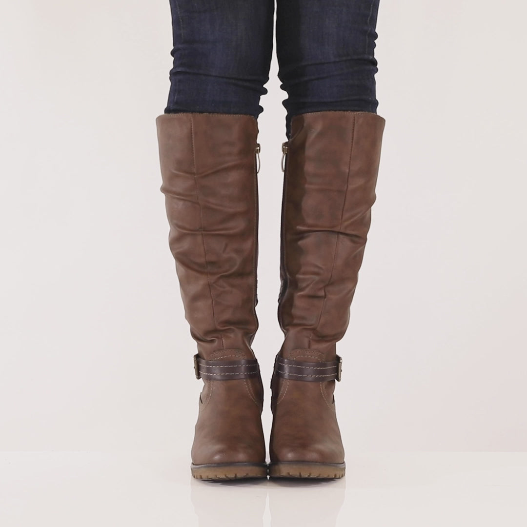 Experimente la revolución de la comodidad con esta bota alta sin cordones de cuero artificial resistente al agua que cuenta con una cremallera lateral (exterior) para una pantorrilla expandible y un diseño decorativo de correa en el tobillo, todo en un tacón grueso y esculpido.