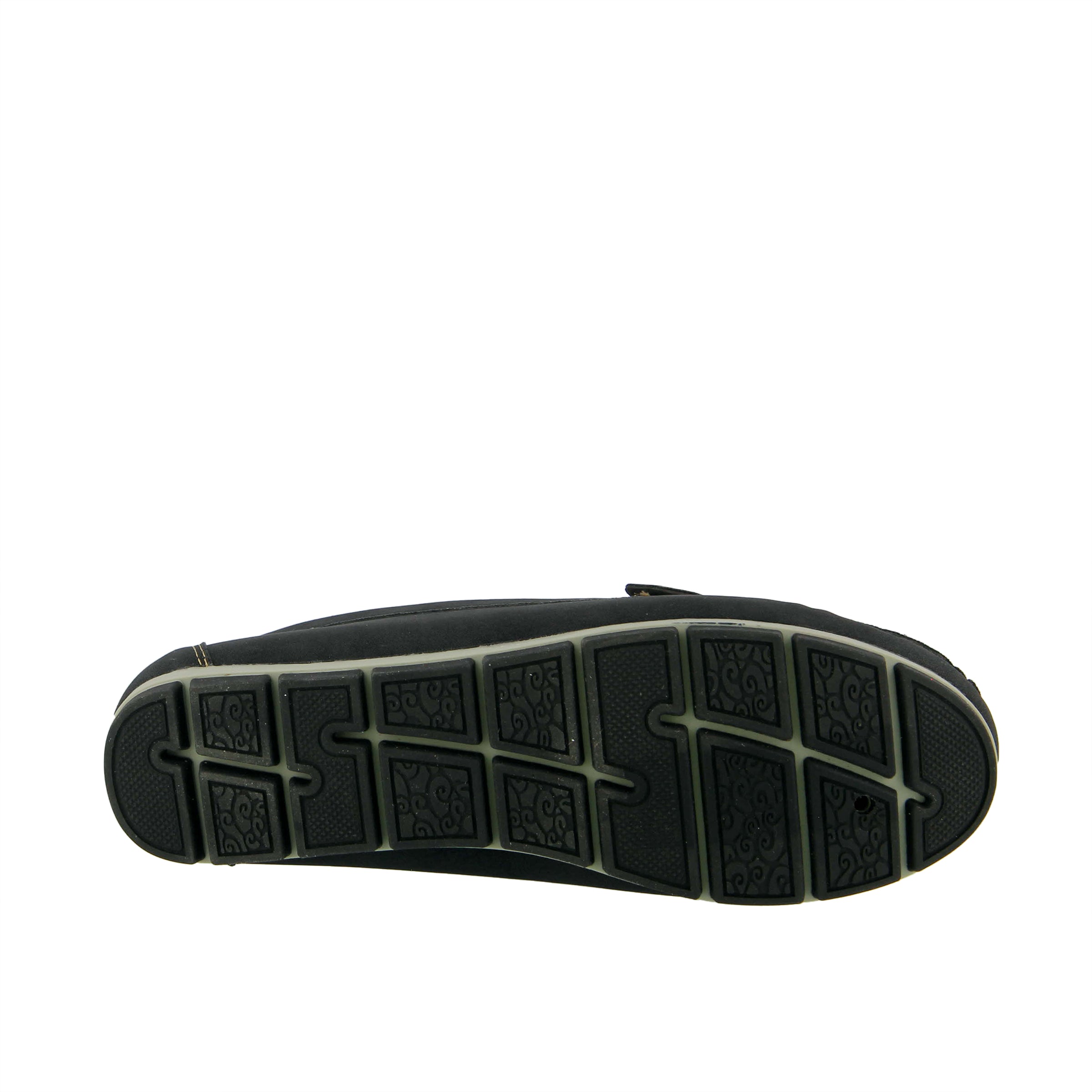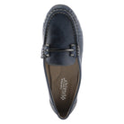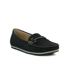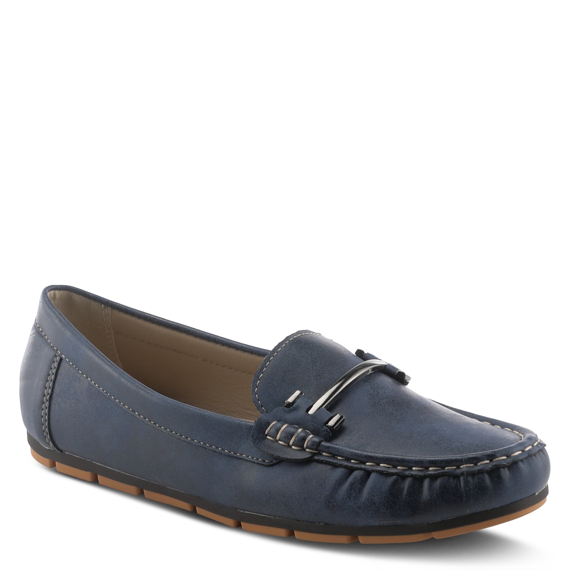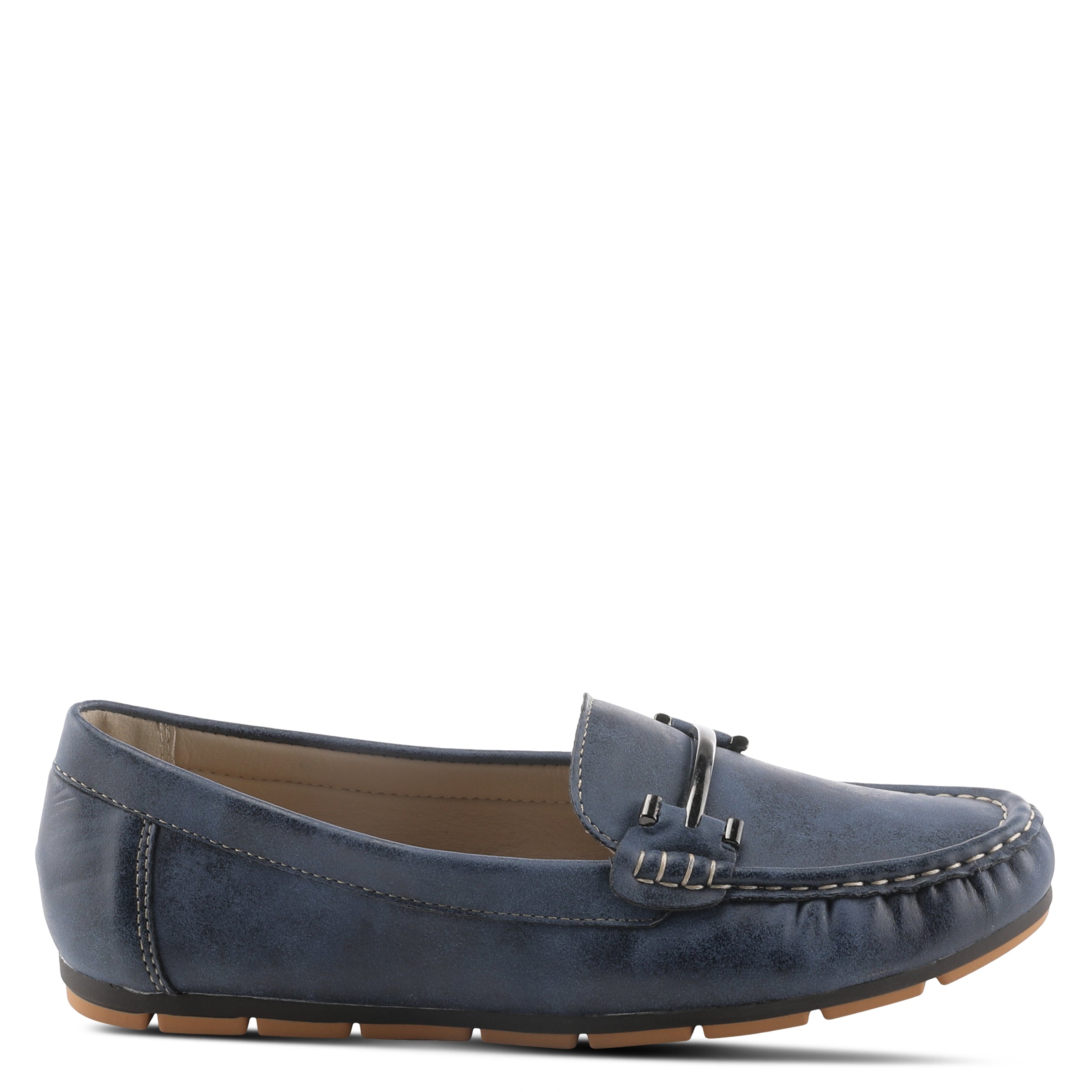 Mocasines casuales para todos los días con herrajes de metal pulido en el empeine y un detalle de mocasín en la puntera, todo en una suela plana esculpida.