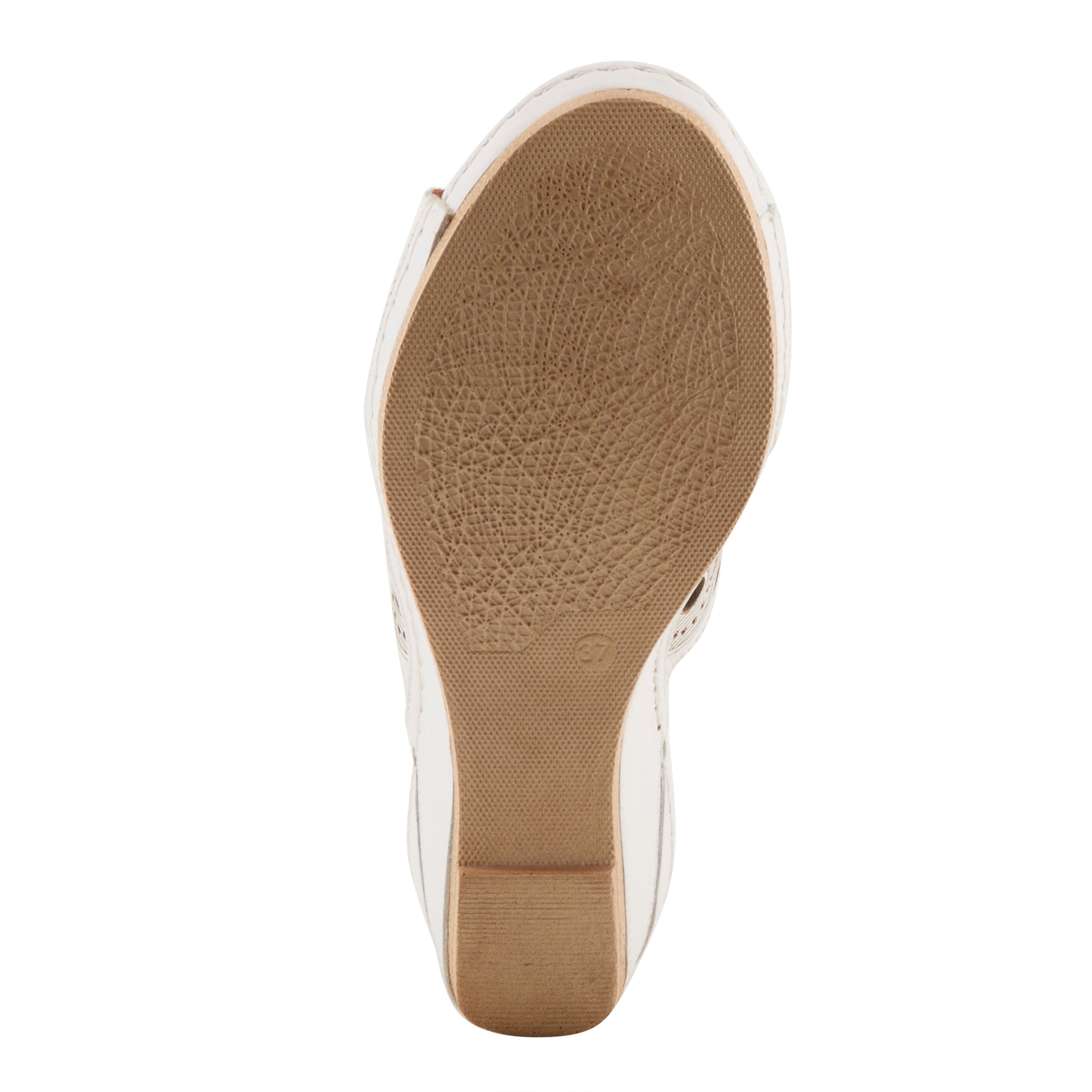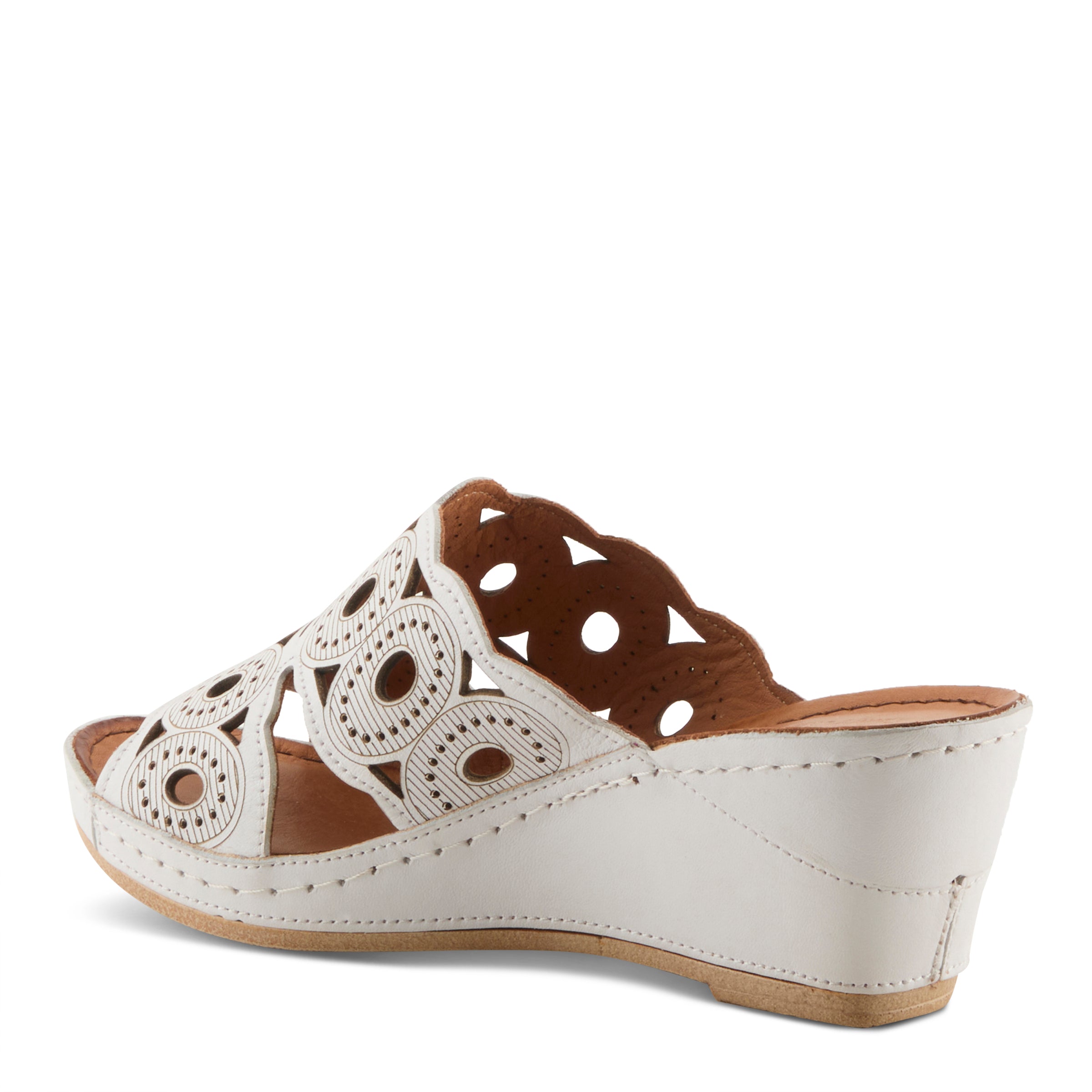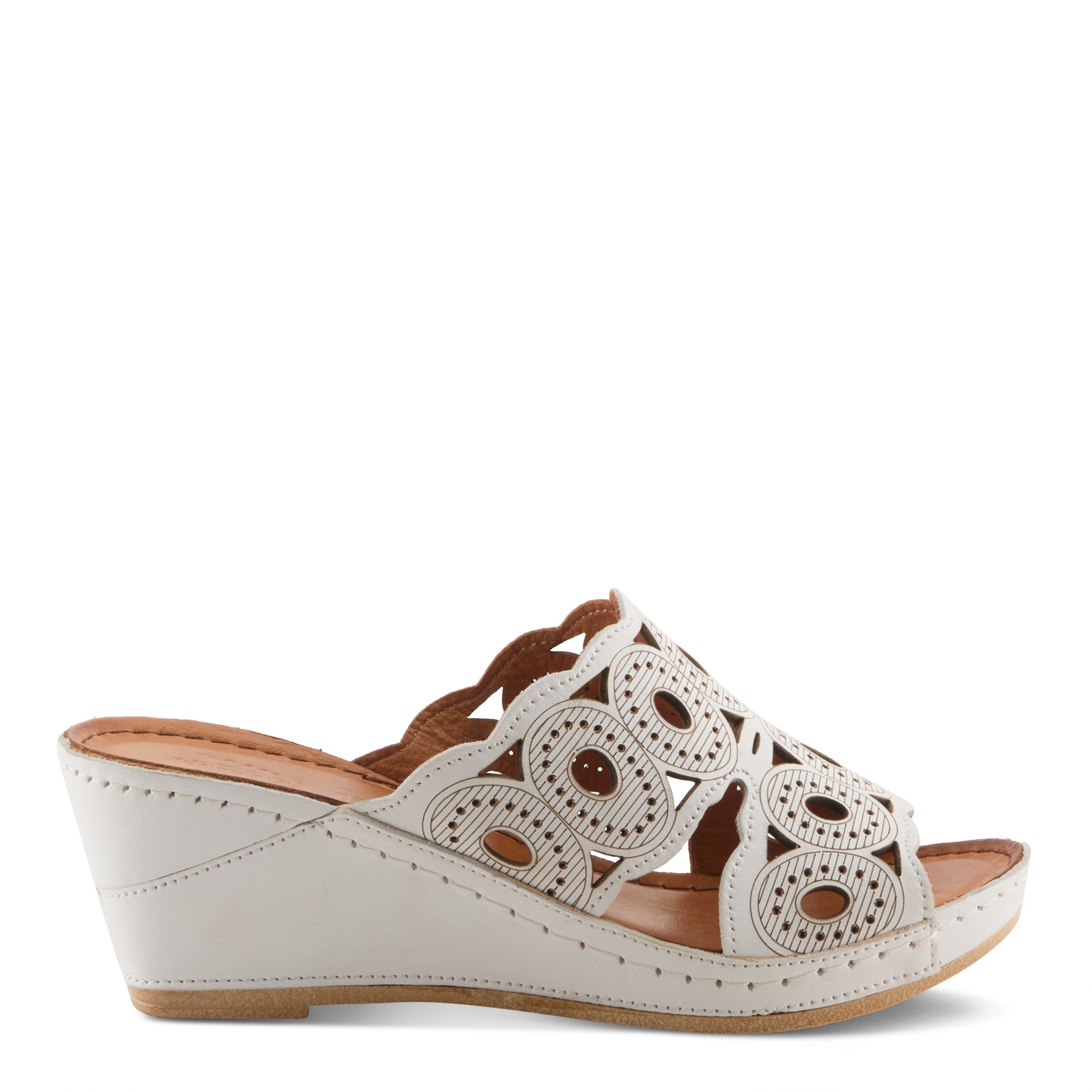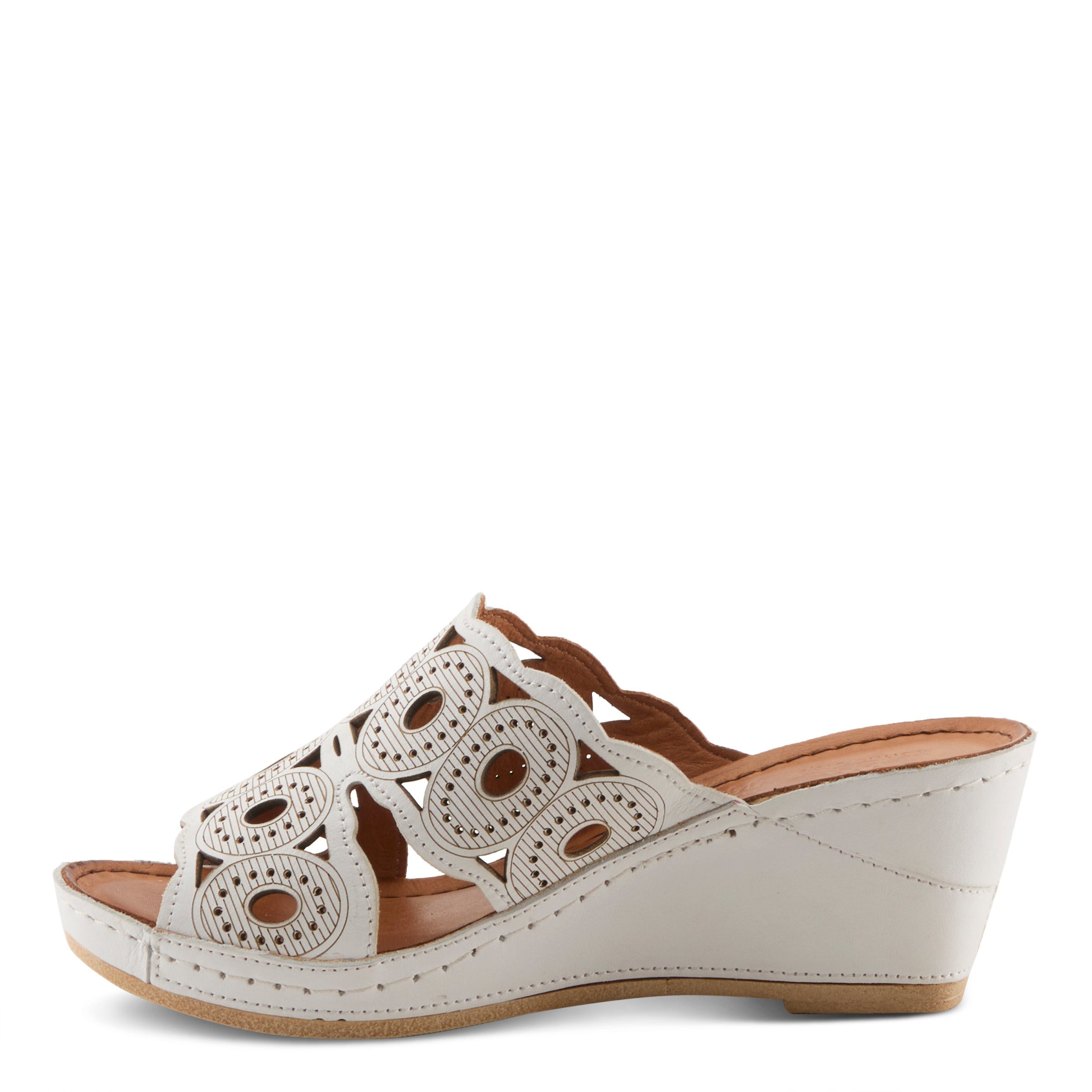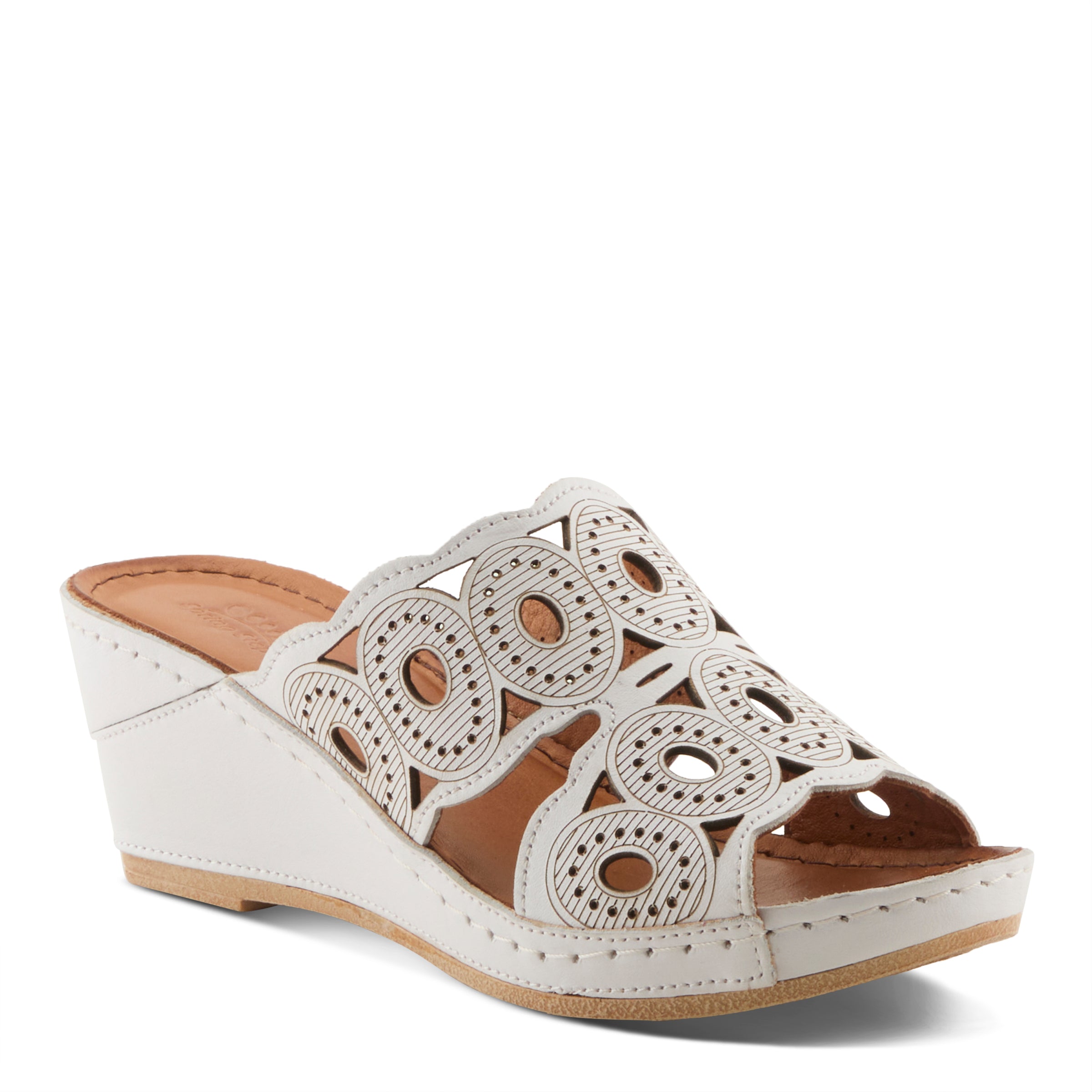 Sandalia tipo slide de piel suave y transpirable de primera calidad con grandes aberturas ovaladas rodeadas de aberturas circulares pequeñas y bordes ondulados en la parte superior, inferior y central. Forrada en piel y forrada sobre una cómoda cuña con una plantilla de piel súper acolchada y flexible para una comodidad durante todo el día y la noche.