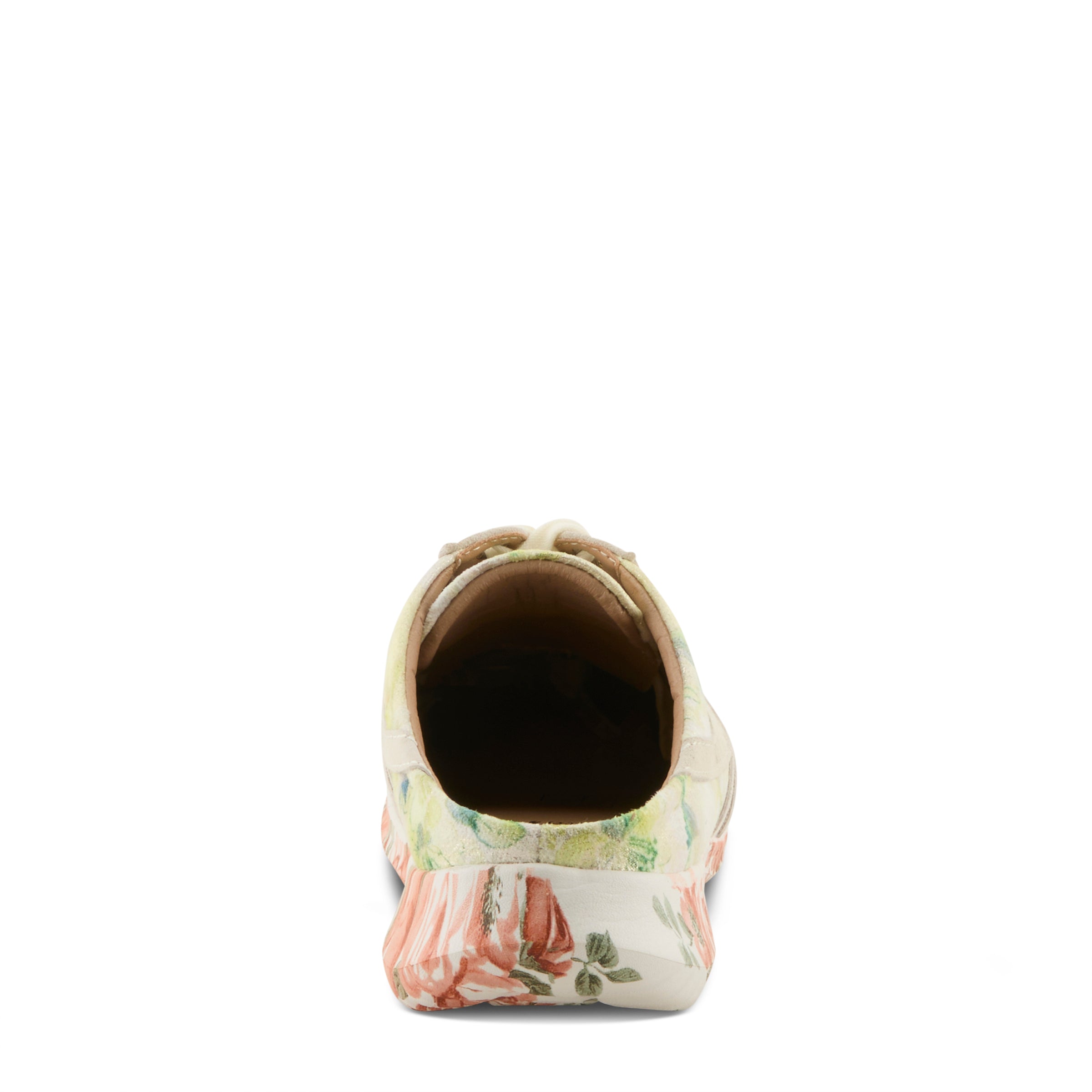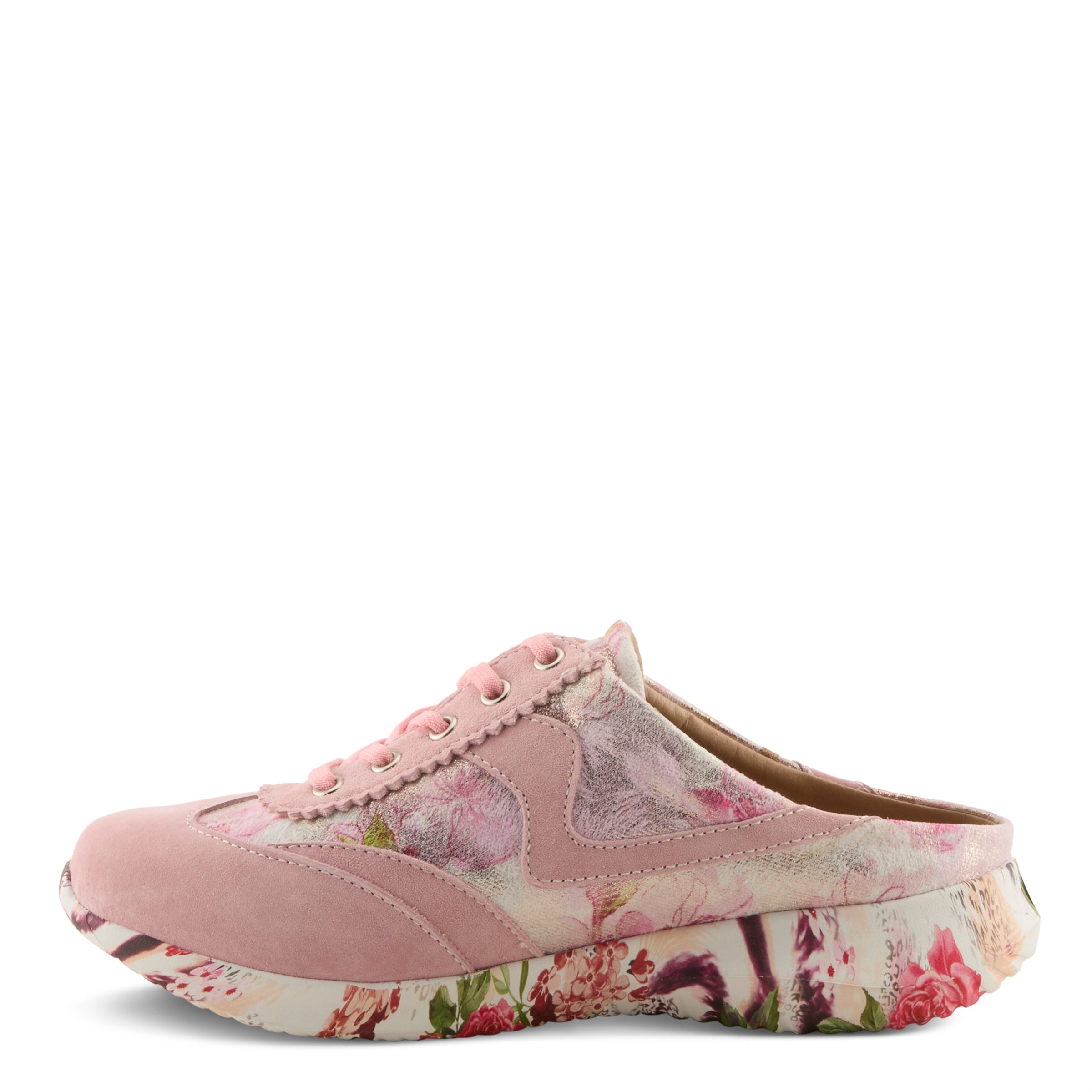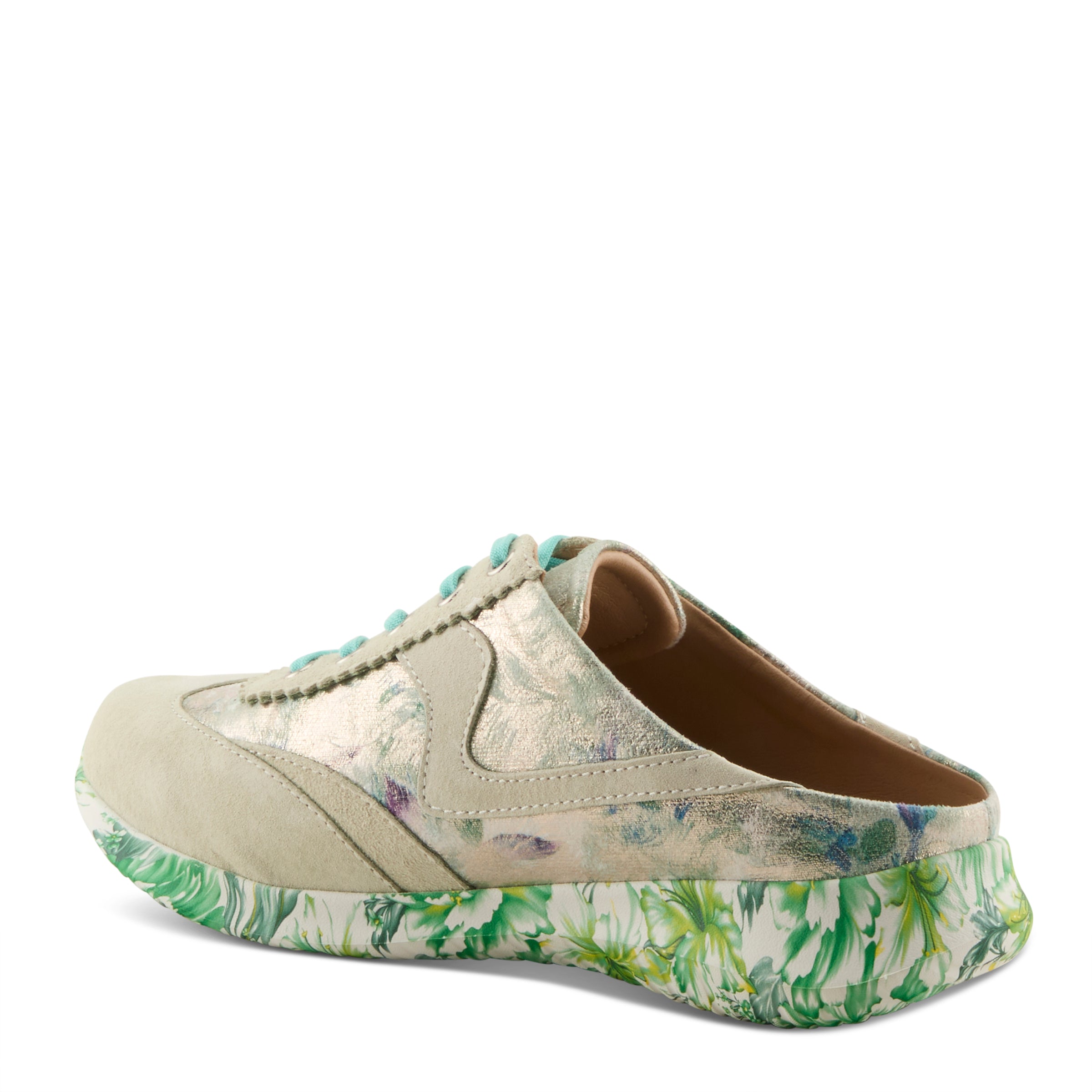 Slip into effortless cool with this modern mule sneaker that blends comfort and fashion in one standout design. The upper is a stylish mix of buttery suede and metallic floral-printed leather, creating a soft shimmer with every step. Unlike the lace-up sneaker version, this backless mule makes it easy to slide on and go, while still offering lace detail for a sporty-chic vibe. The true showstopper is the outsole — fully printed with a lush floral garden motif, giving this casual shoe an artistic, gallery-worthy edge. Finished with a cushioned insole for daylong wear, it’s the perfect mix of laid-back ease and elevated detail.