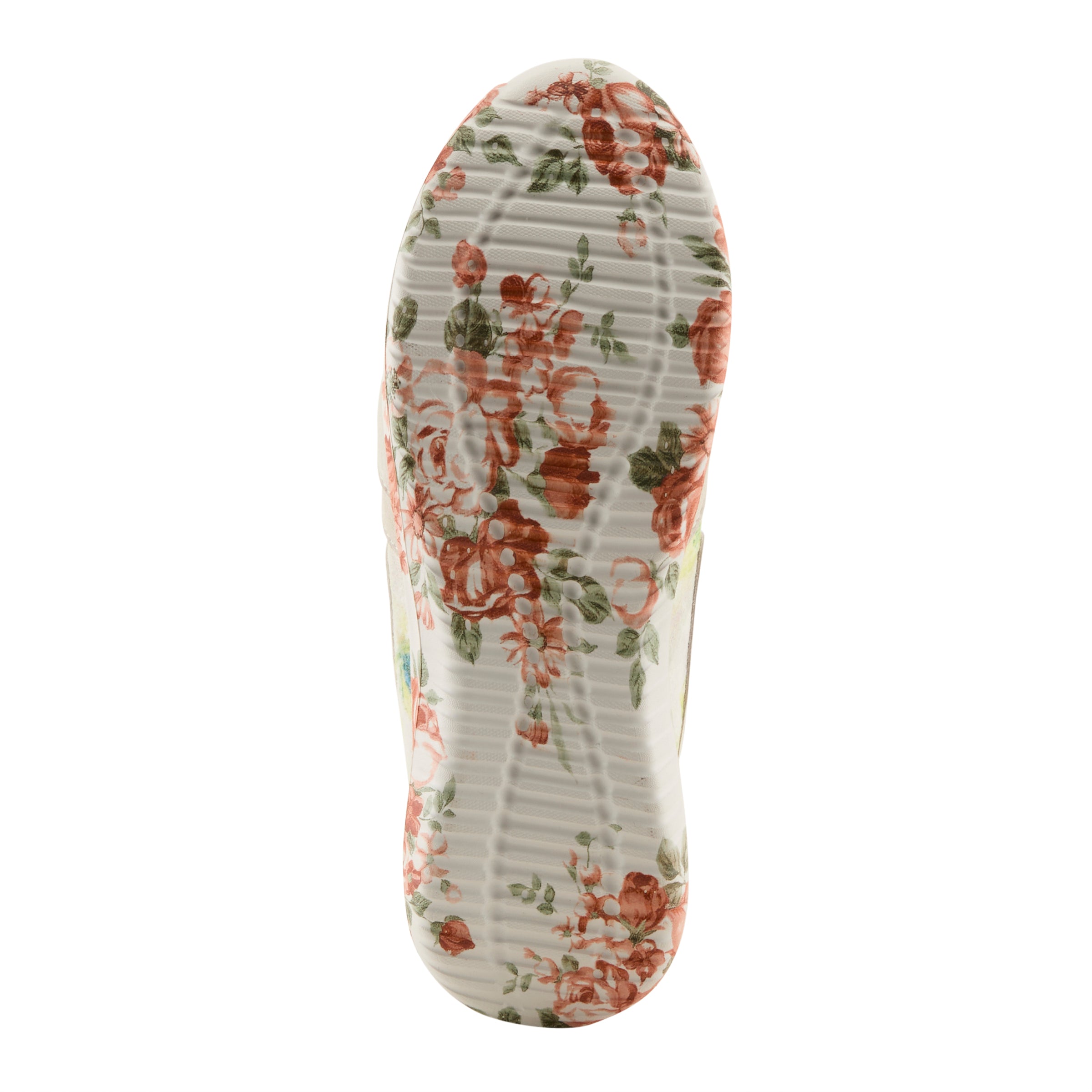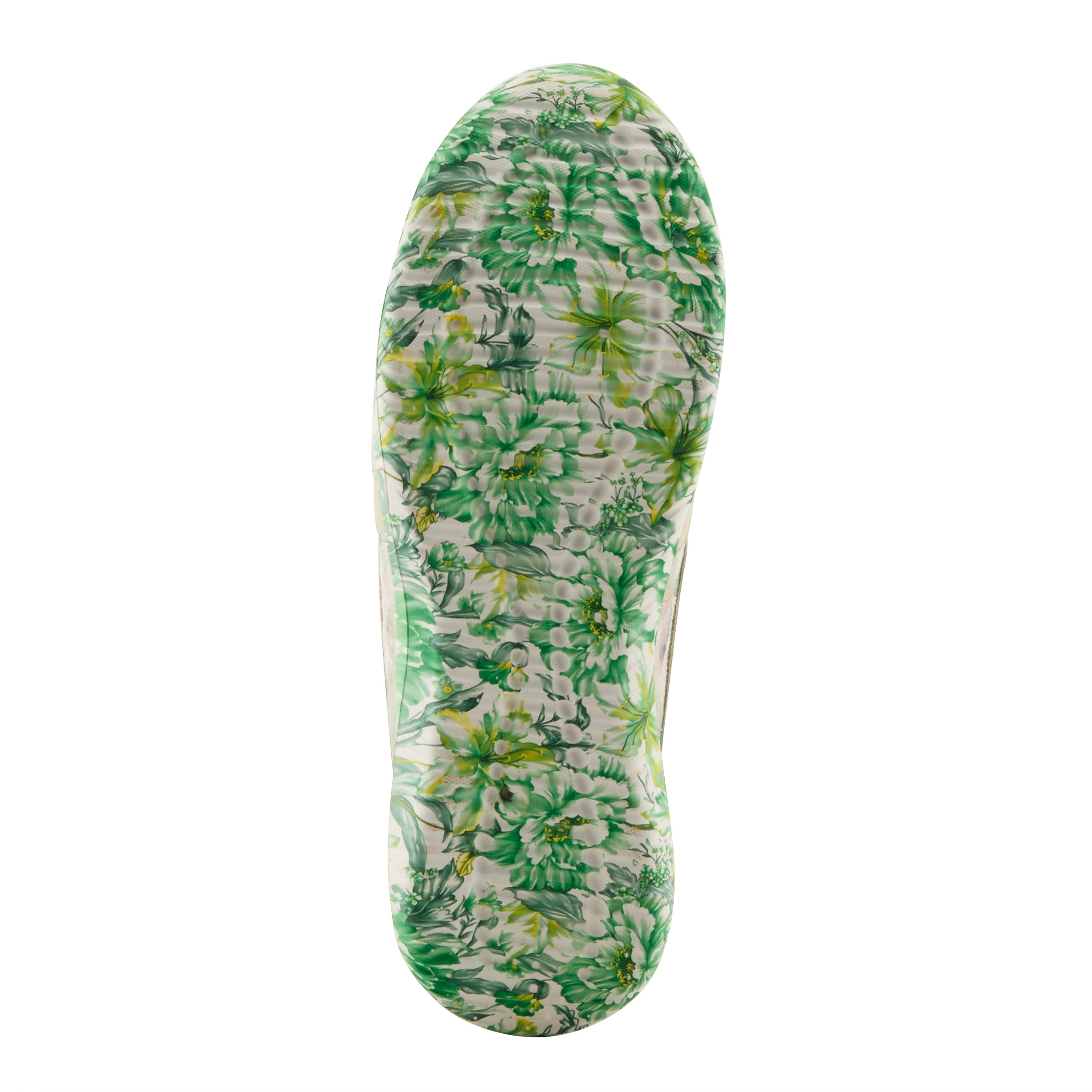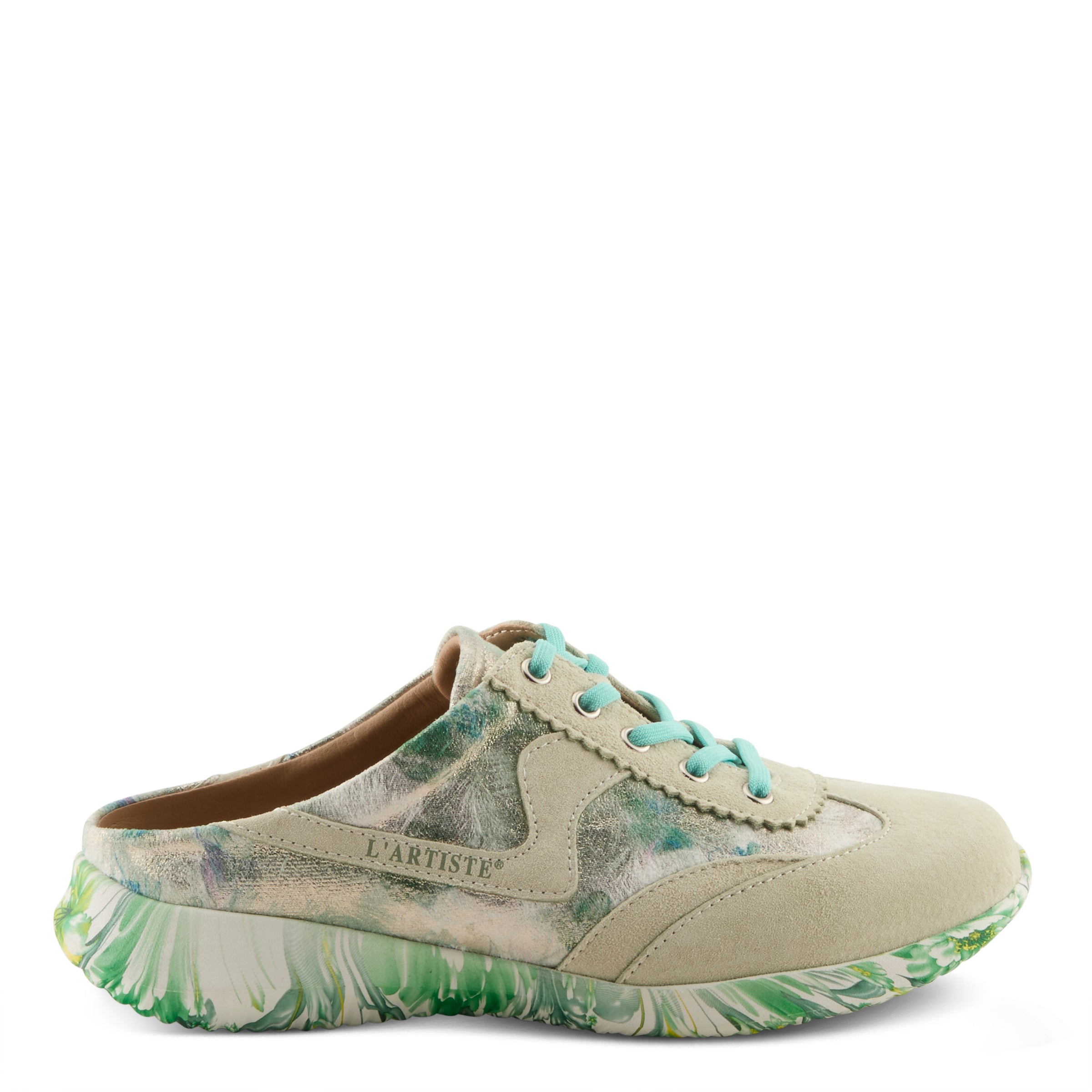 Slip into effortless cool with this modern mule sneaker that blends comfort and fashion in one standout design. The upper is a stylish mix of buttery suede and metallic floral-printed leather, creating a soft shimmer with every step. Unlike the lace-up sneaker version, this backless mule makes it easy to slide on and go, while still offering lace detail for a sporty-chic vibe. The true showstopper is the outsole — fully printed with a lush floral garden motif, giving this casual shoe an artistic, gallery-worthy edge. Finished with a cushioned insole for daylong wear, it’s the perfect mix of laid-back ease and elevated detail.